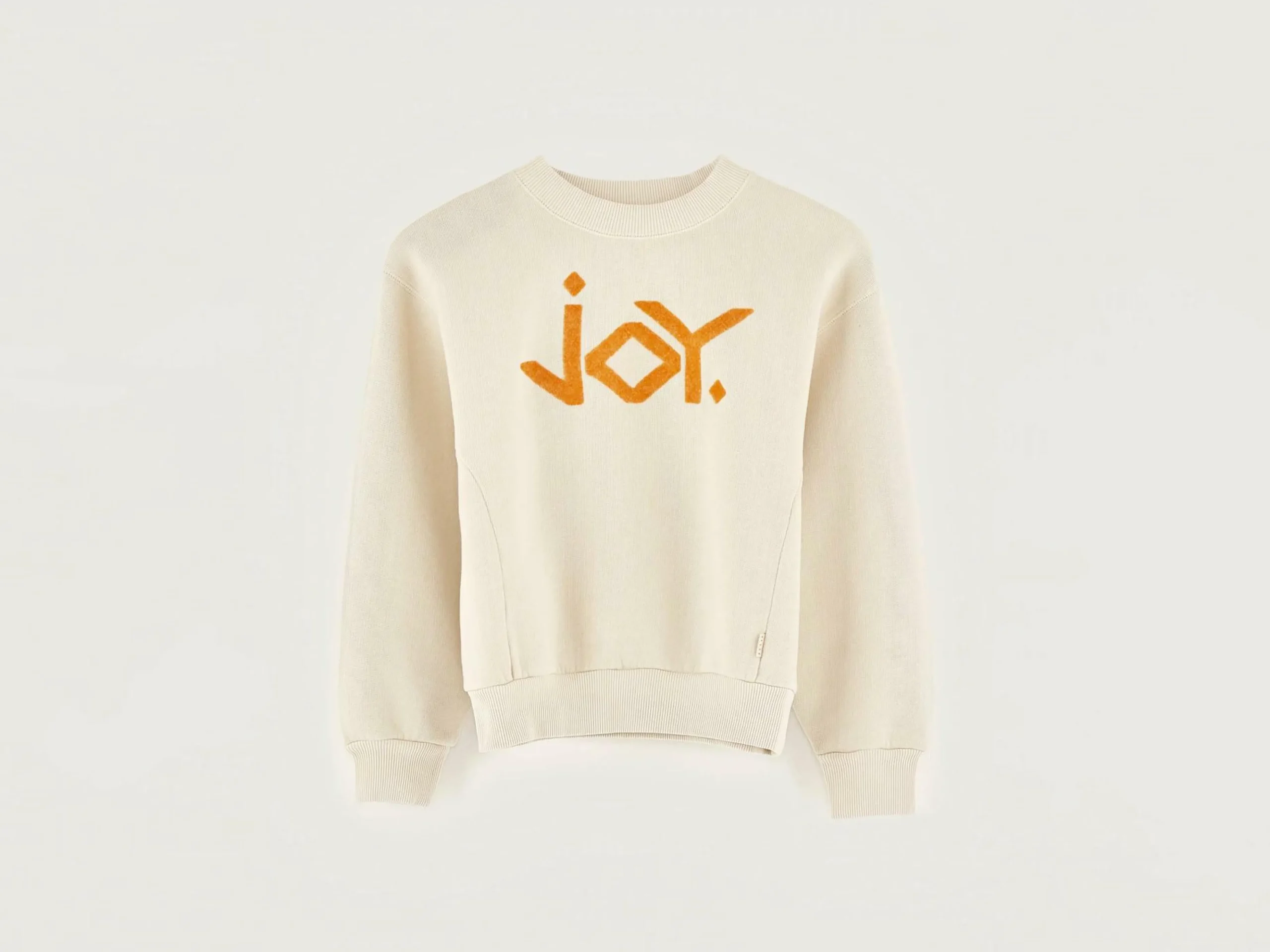 Sweatshirt décontracté à manches longues en jersey beige avec imprimé « JOY » en lettres feutrées sur l’avant.