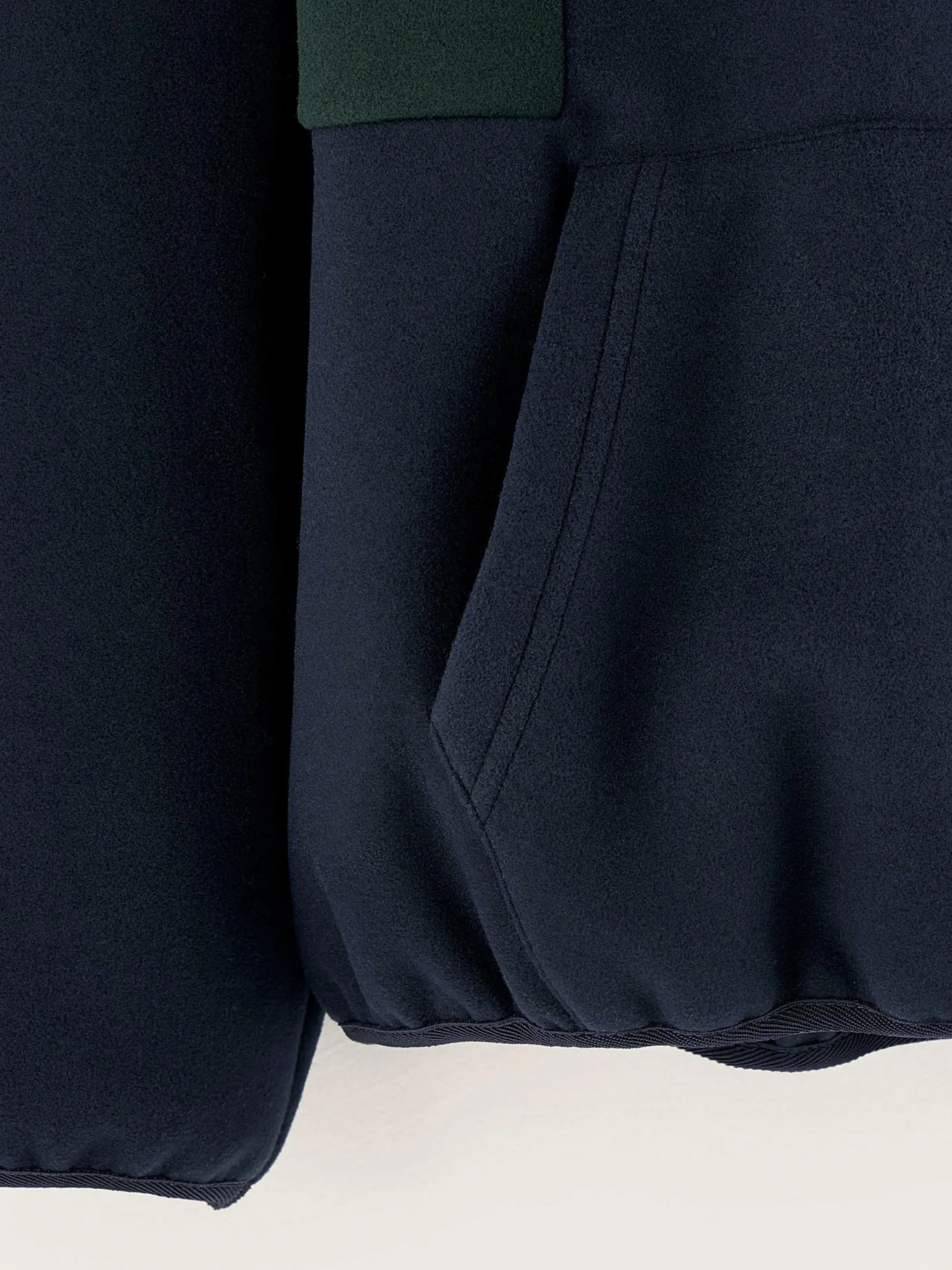 Sweatshirt coupe classique, couleur bleu foncé et col montant zippé.