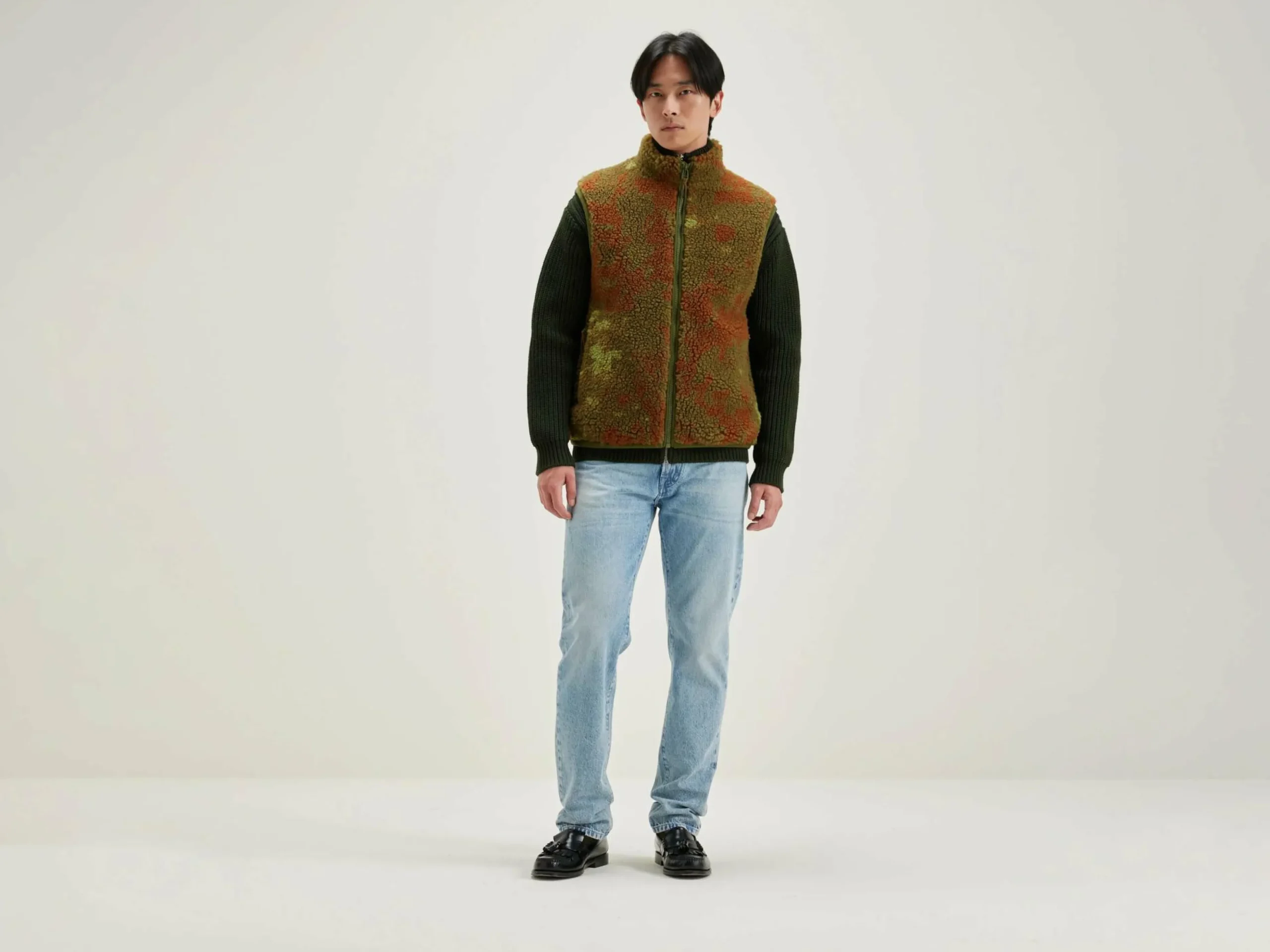 Sweatshirt zippé sans manches, coupe droite, confectionné en polaire imprimée camouflage.