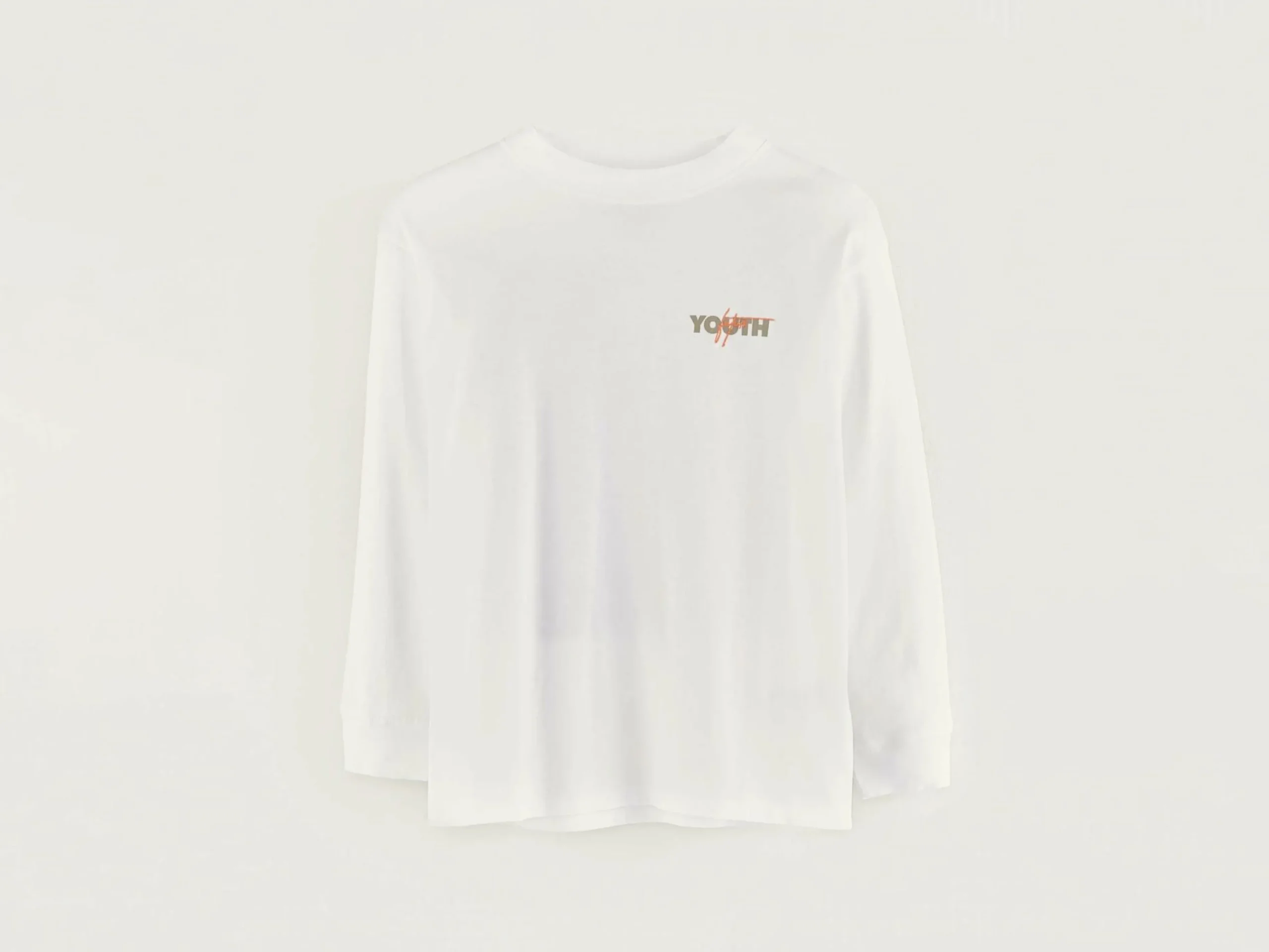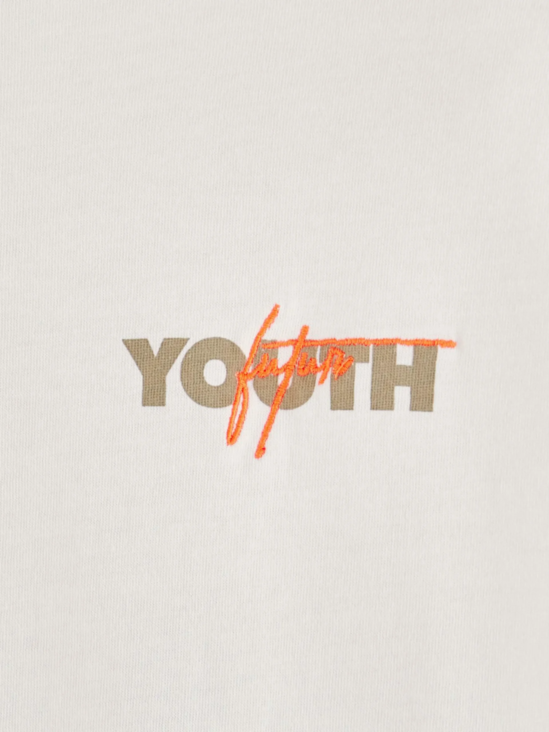 T-shirt décontracté en jersey de coton brossé blanc, imprimé d’une photo dans le dos et brodé sur l’avant.