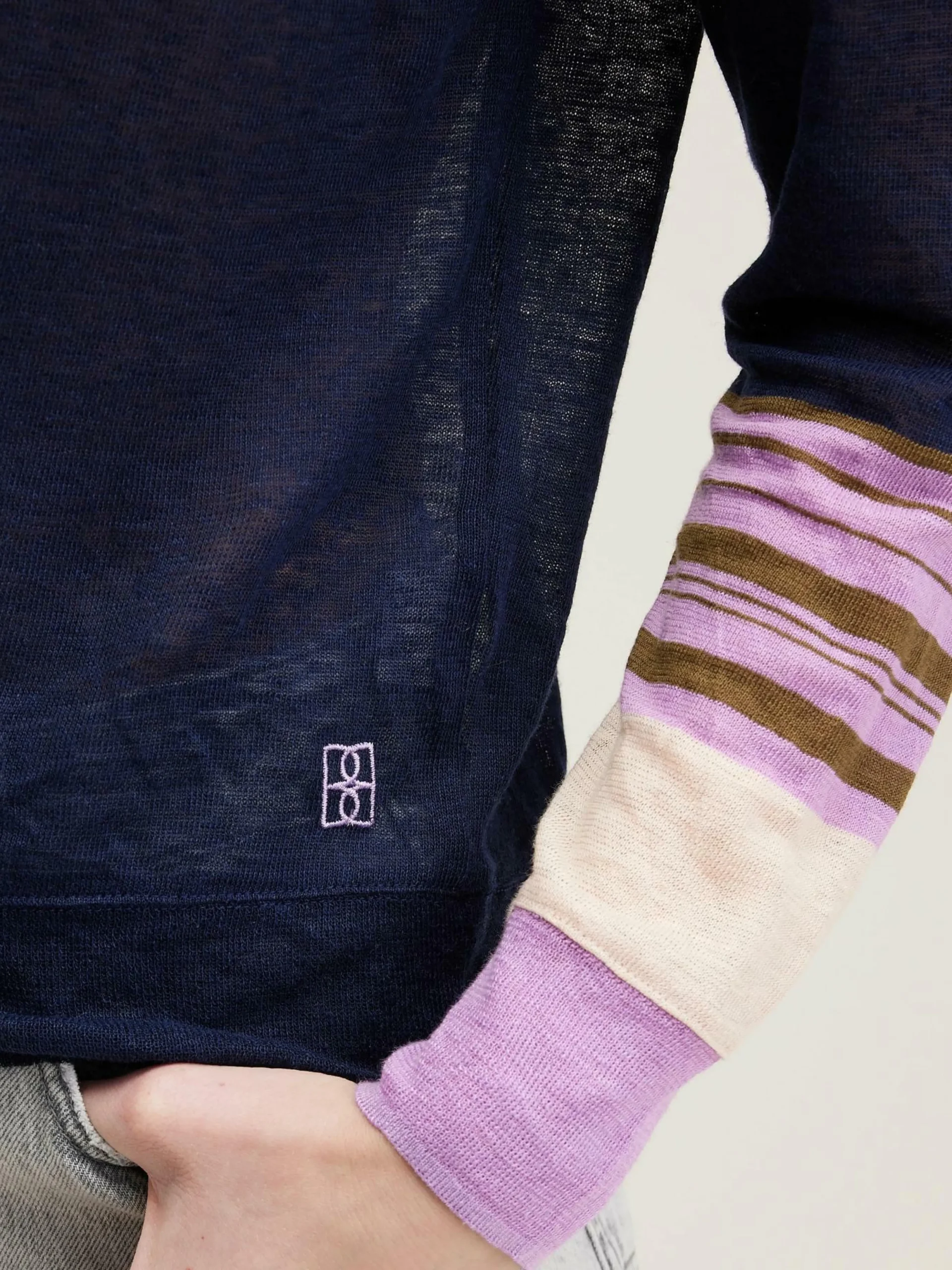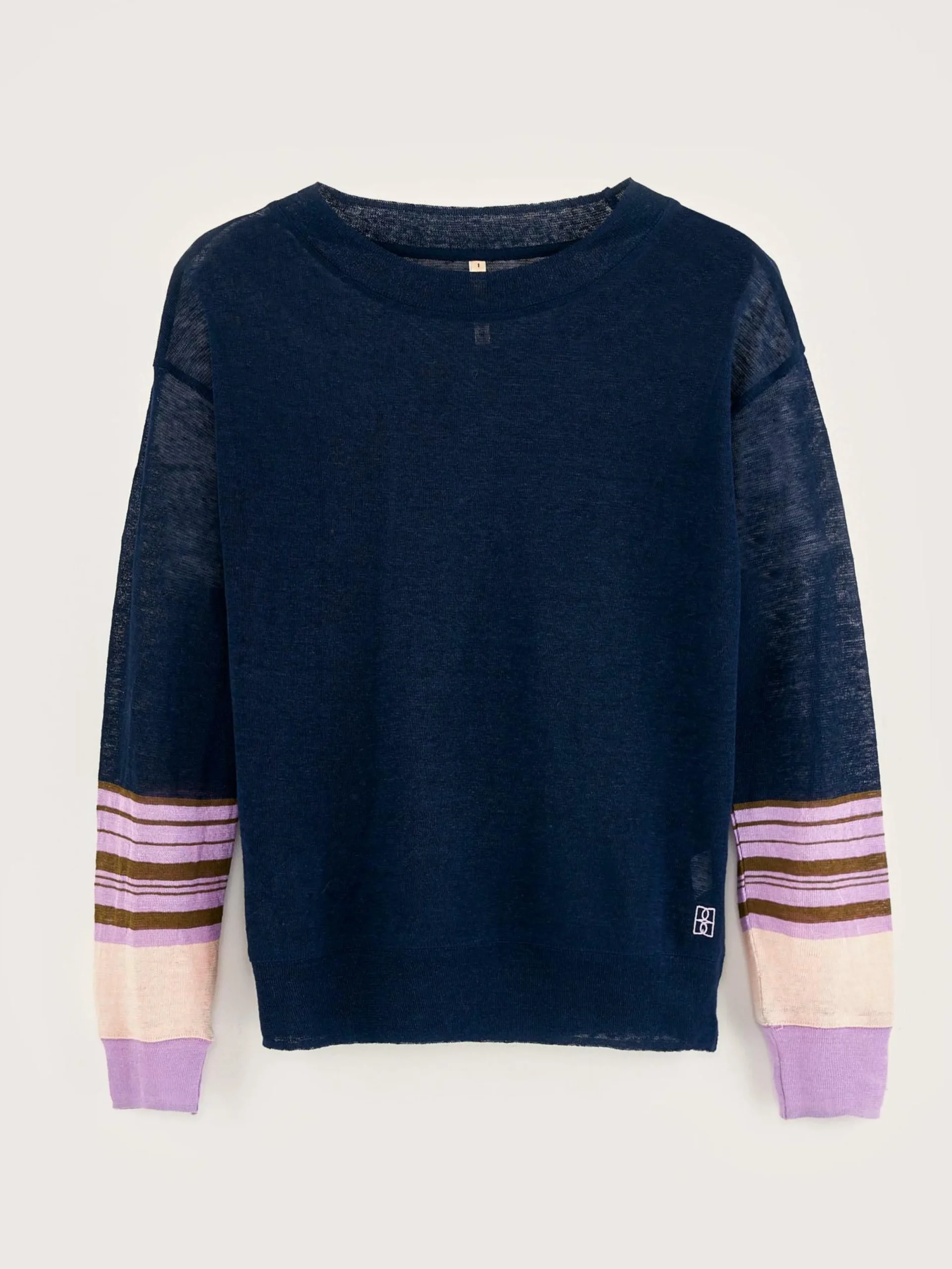 T-shirt en lin bleu marine coupe décontractée, manches longues avec rayures contrastées.