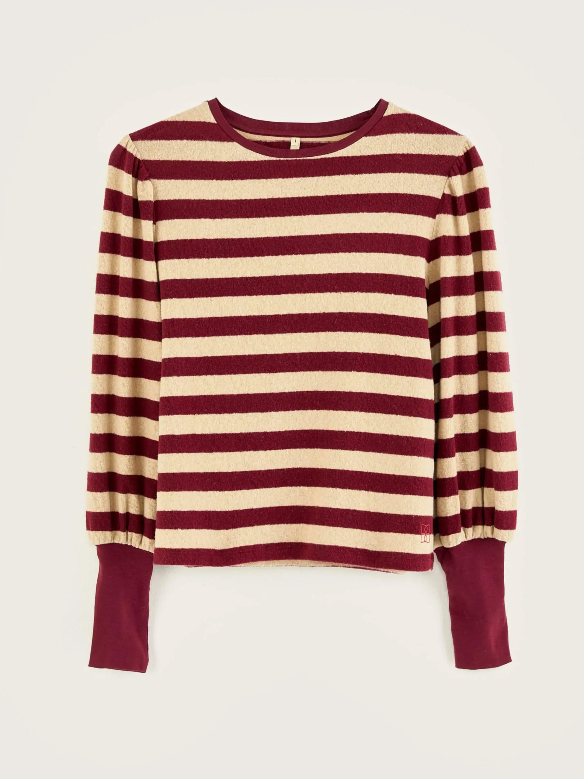 T-shirt en jersey rayé blanc et rouge, manches bouffantes, col rond et poignets ajustés.