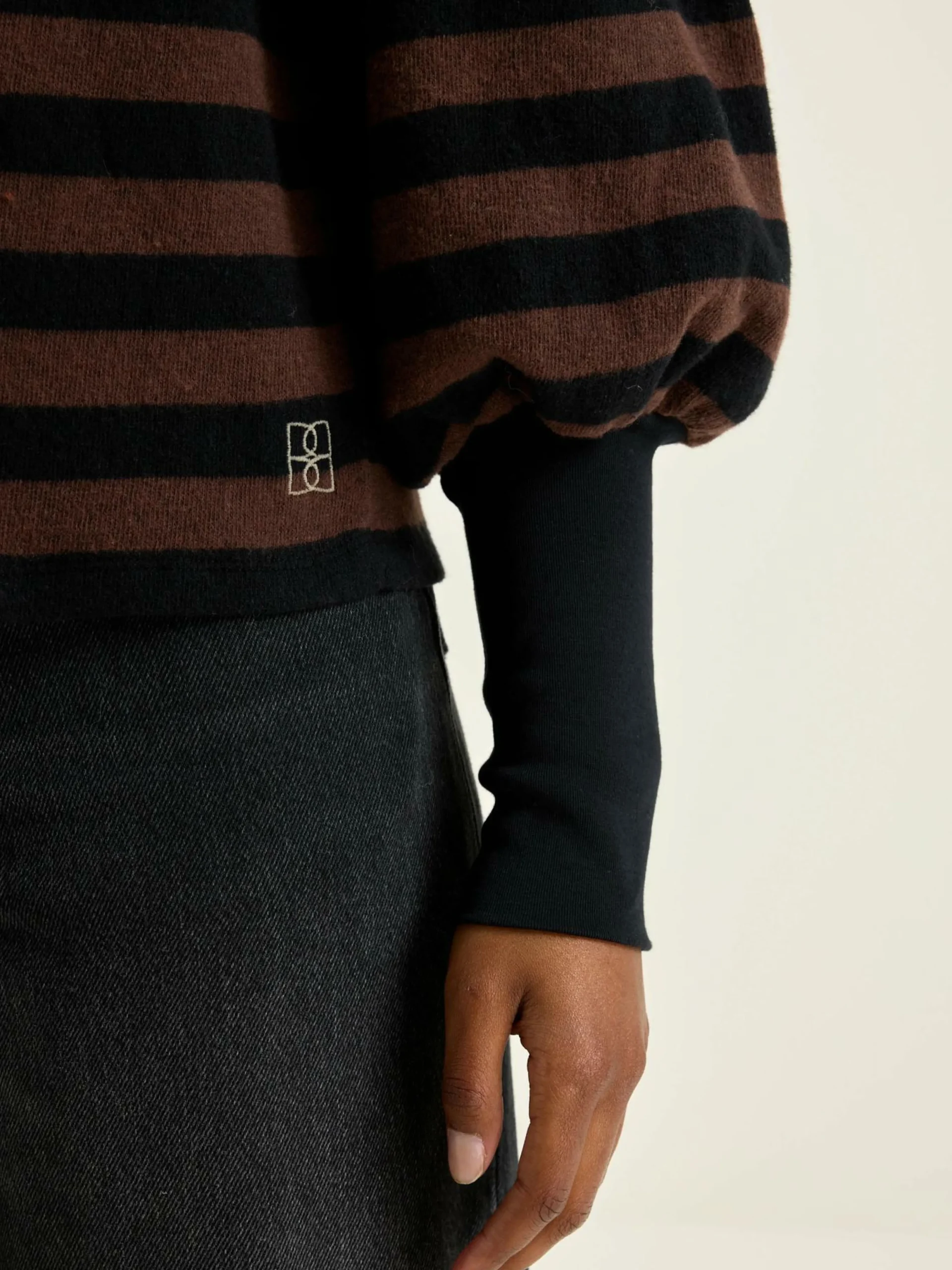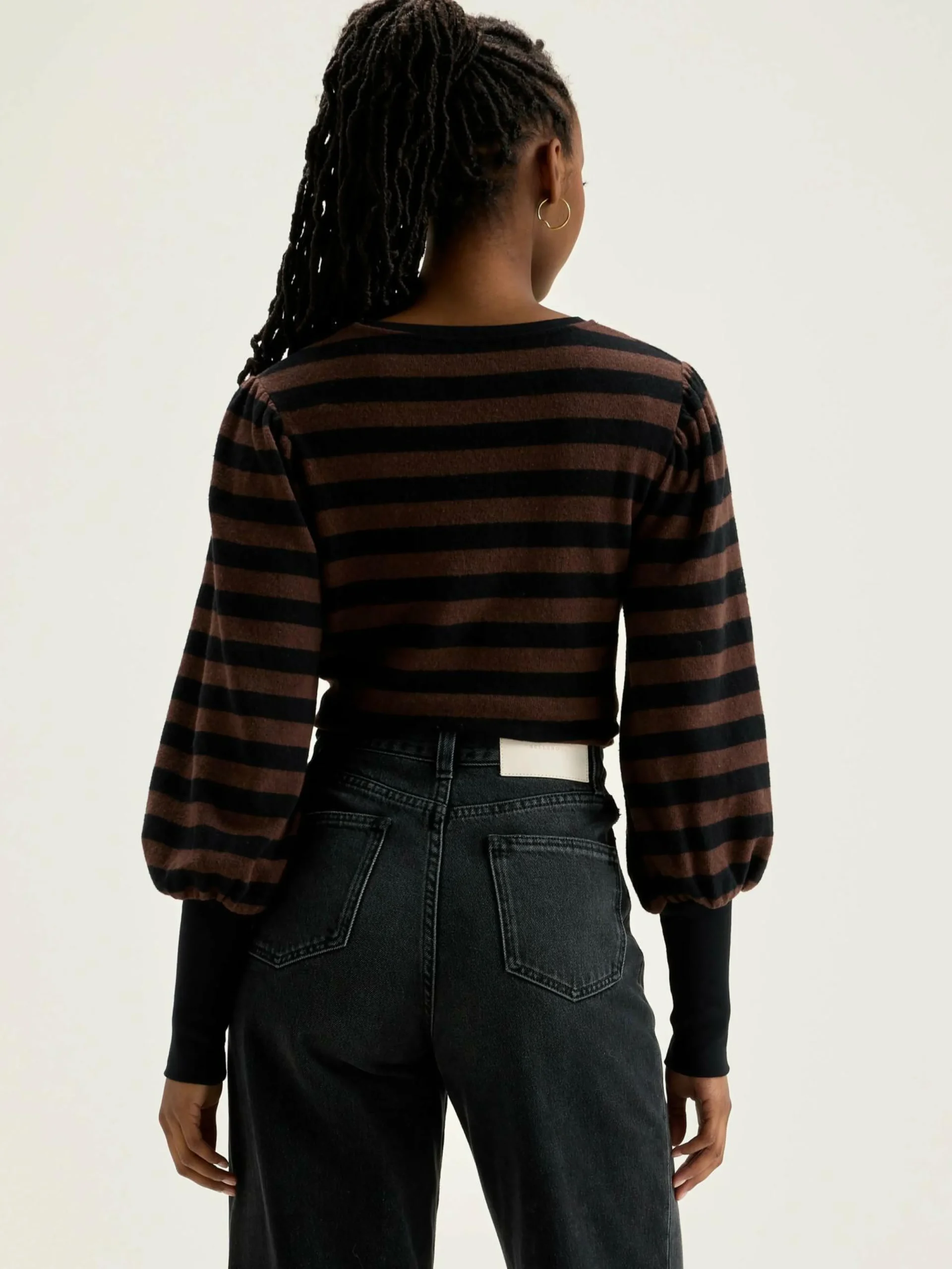 T-shirt en jersey rayé noir et brun, manches bouffantes, col rond et poignets ajustés.