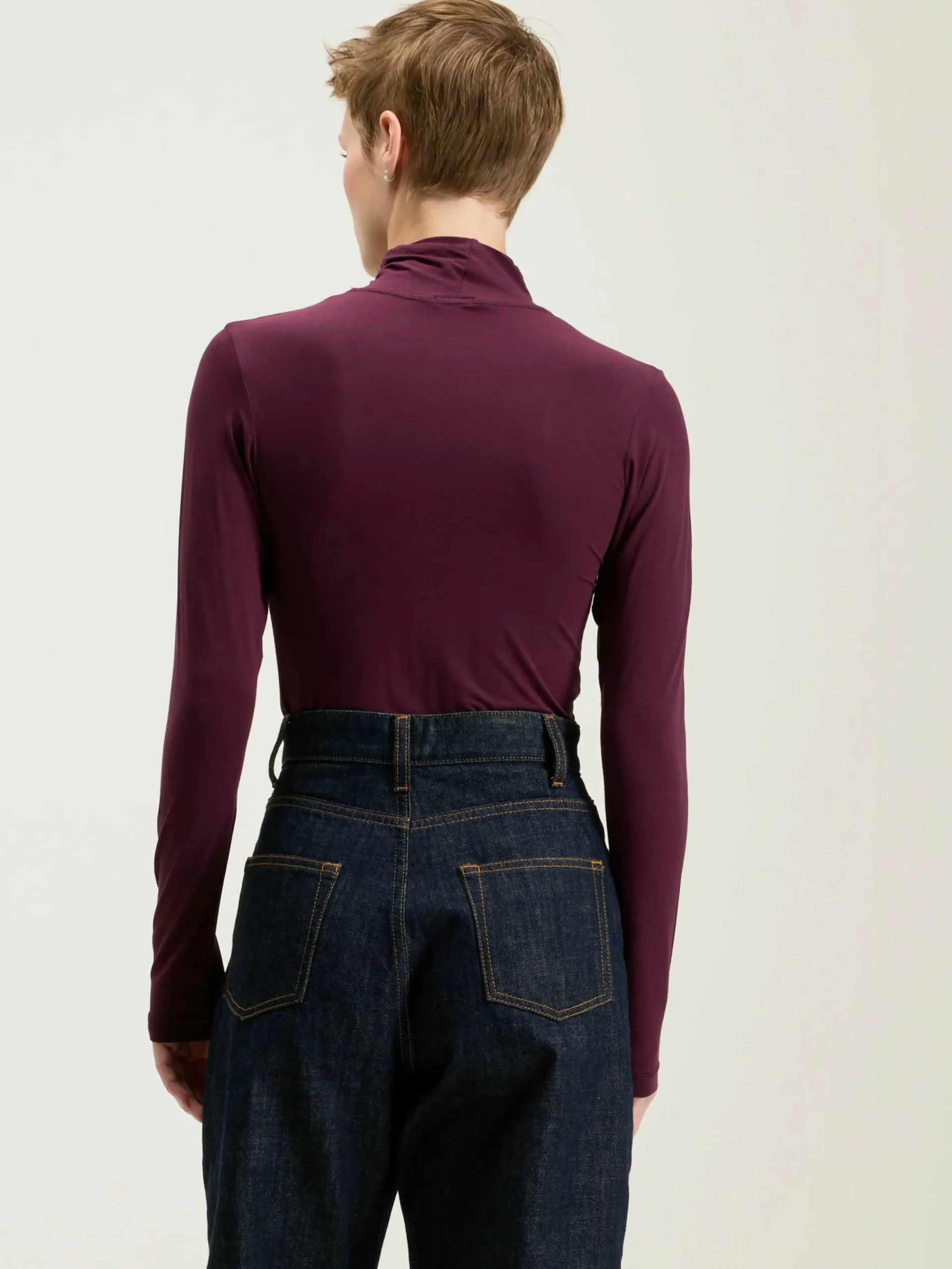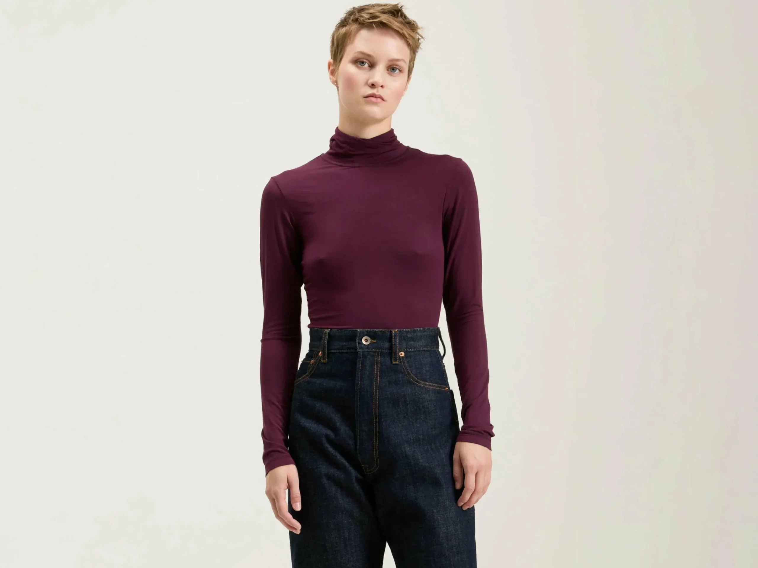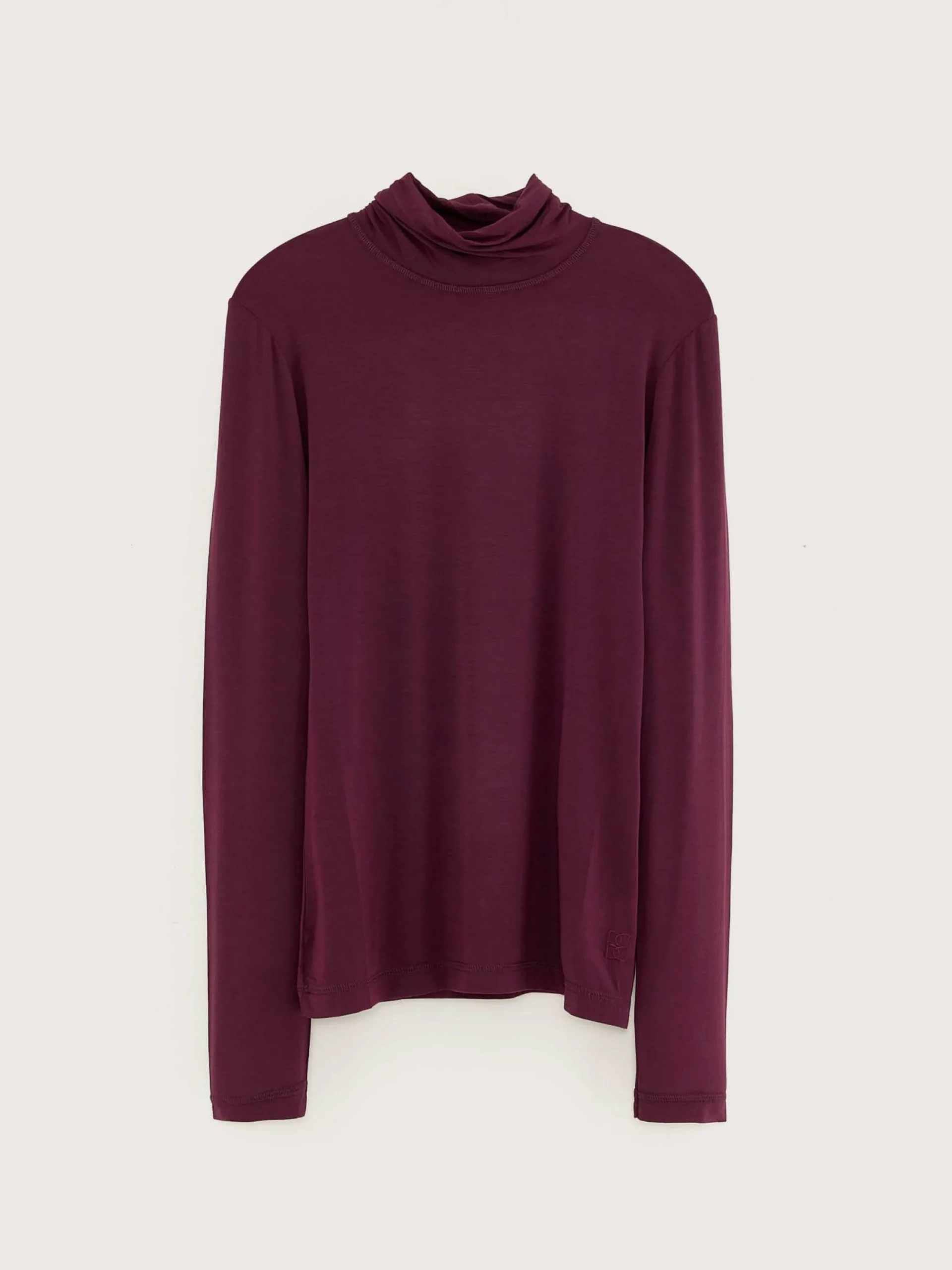 T-shirt slim fit à col montant en tissu effet seconde peau couleur bordeaux.