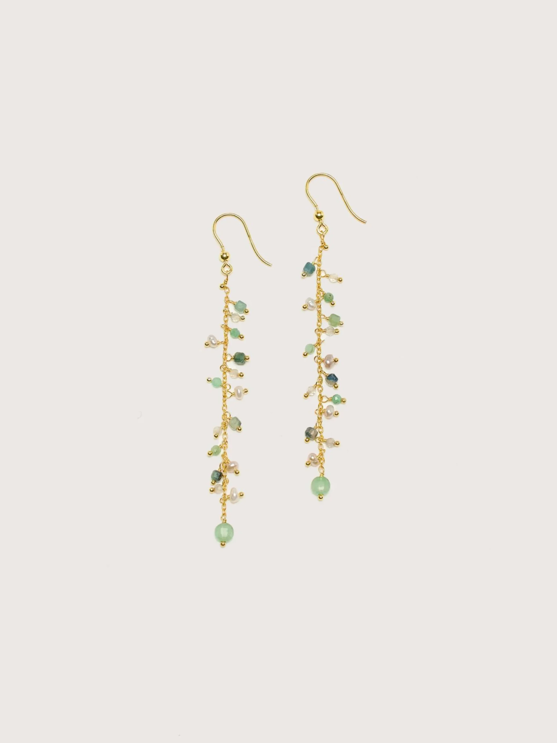 Les boucles d’oreilles Untitledition Ribes sont de magnifiques longues chaînes en or vermeil avec des perles d’eau douce et des pierres précieuses.