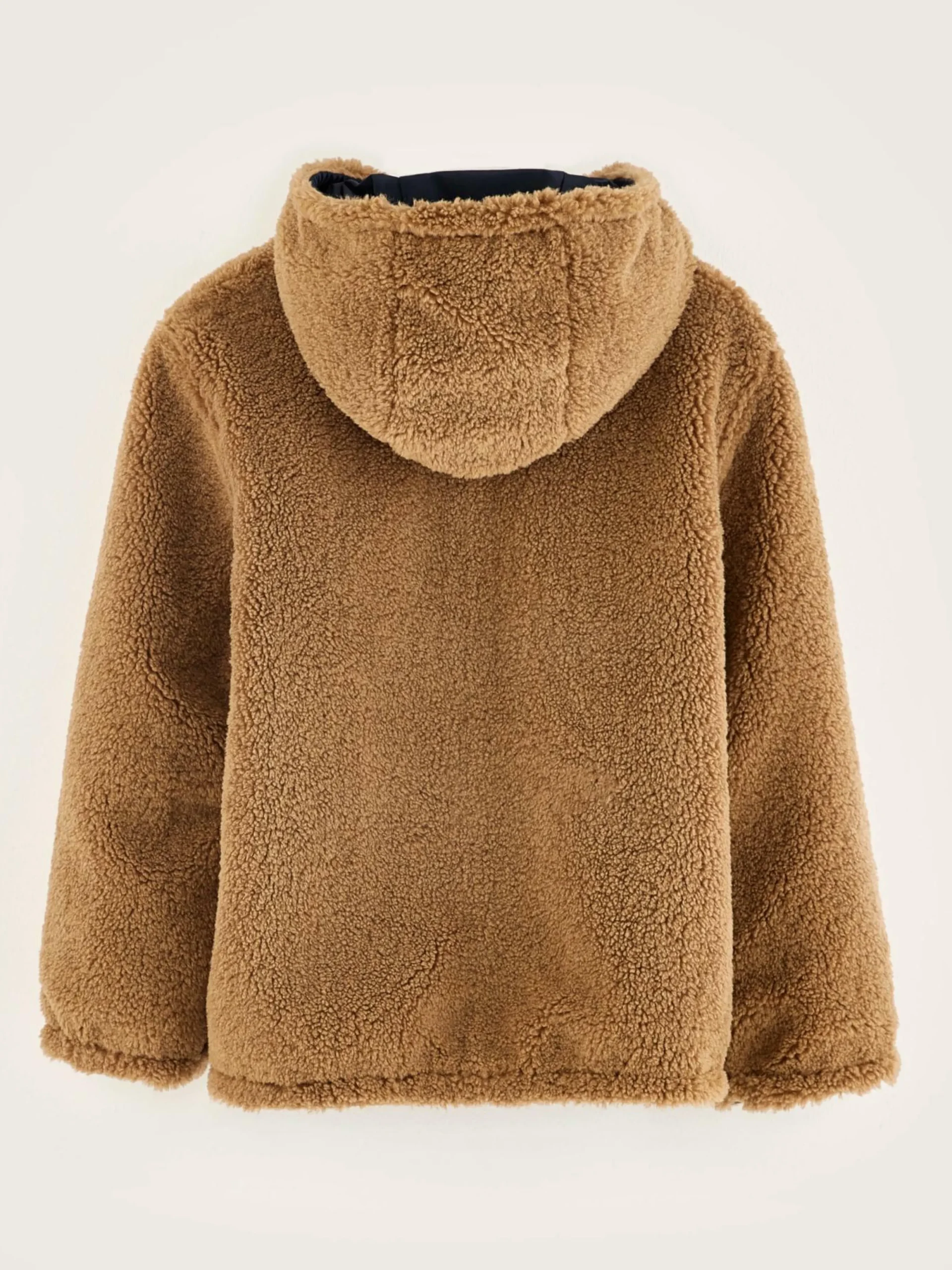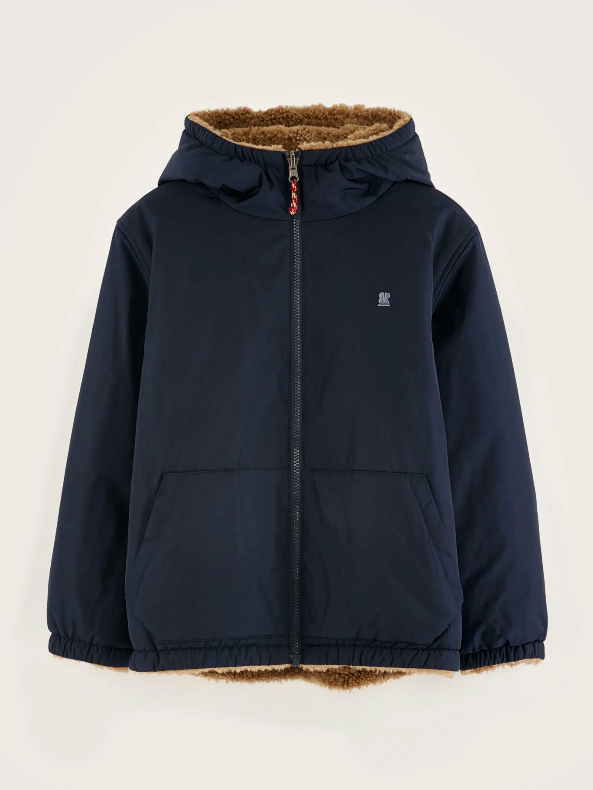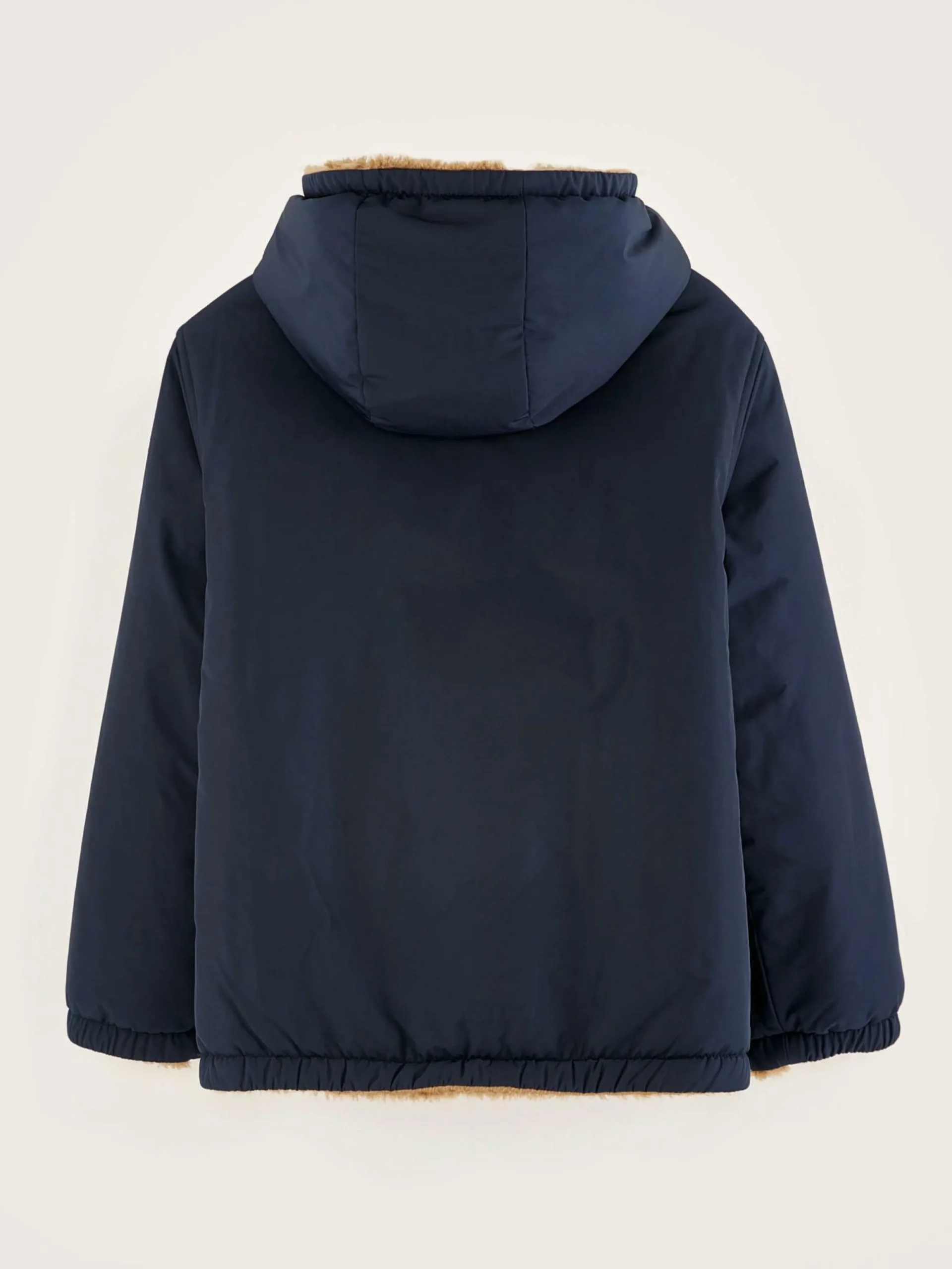 Veste réversible à capuche, coupe classique en tissu déperlant bleu foncé et doublée de teddy.