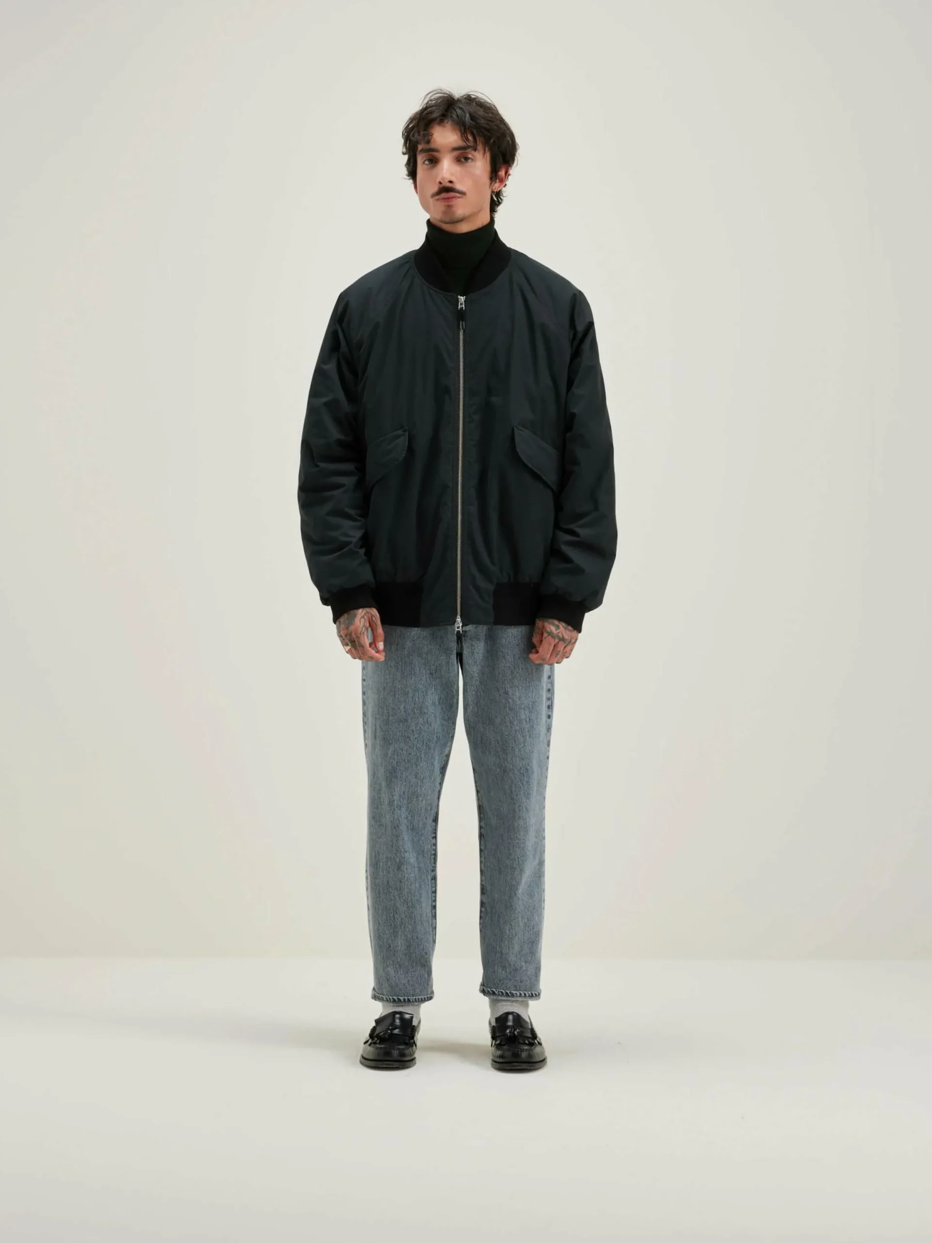 Veste oversize style bomber en toile noire avec fermeture par zip et manches raglan.
