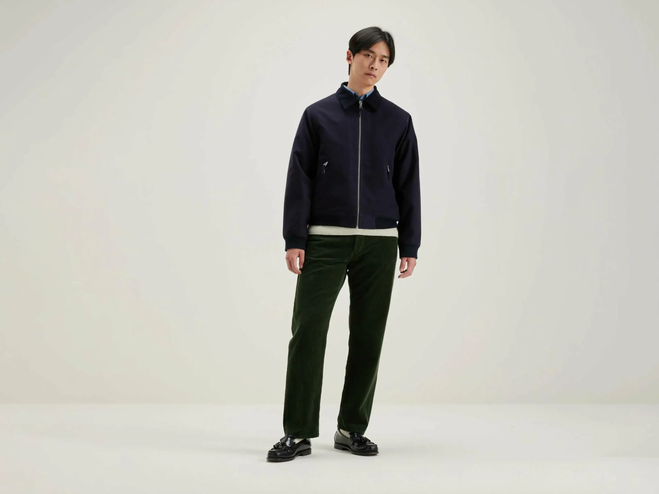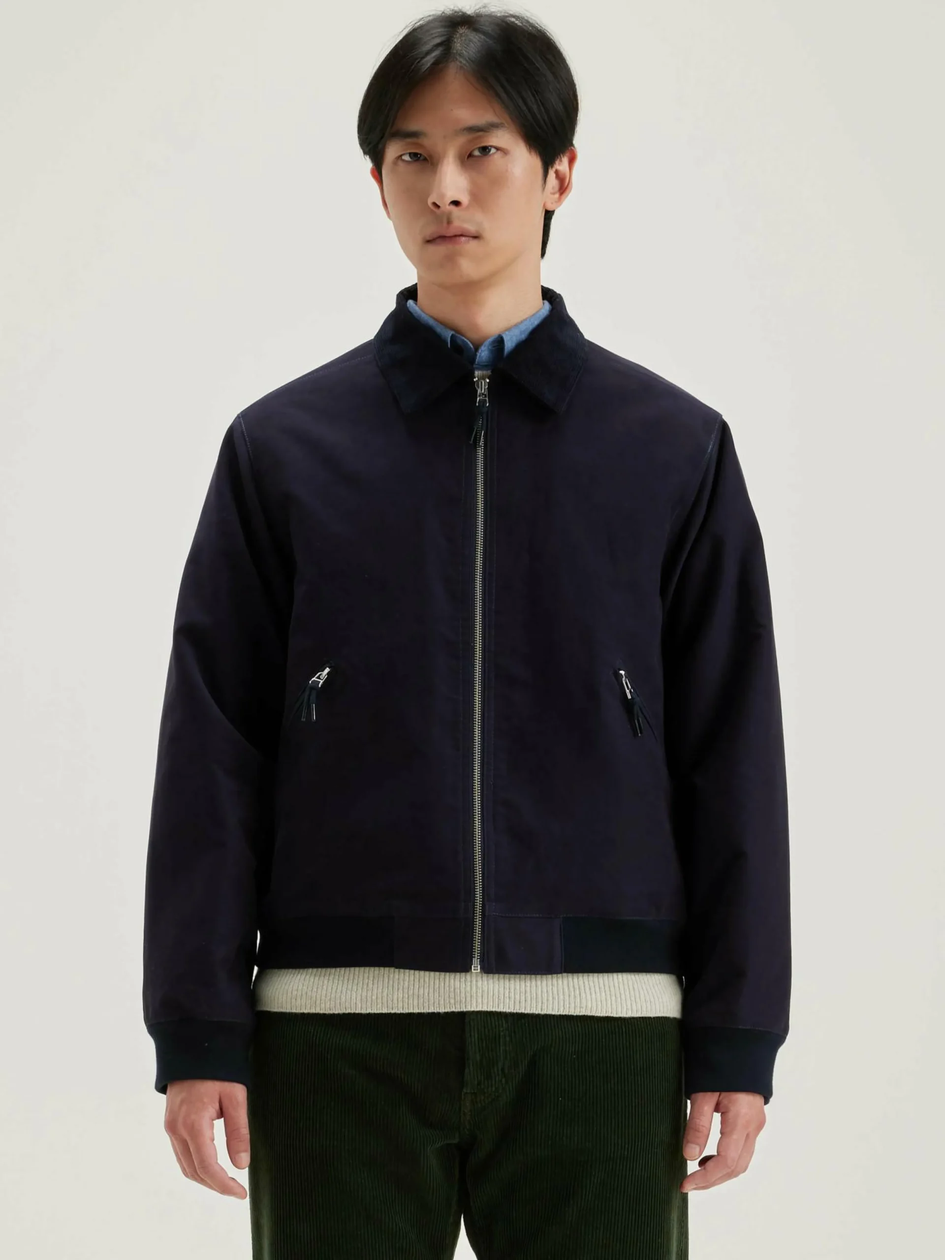 Veste de golf classique en moleskine de coton noir-bleu, avec fermeture par zip et col classique.