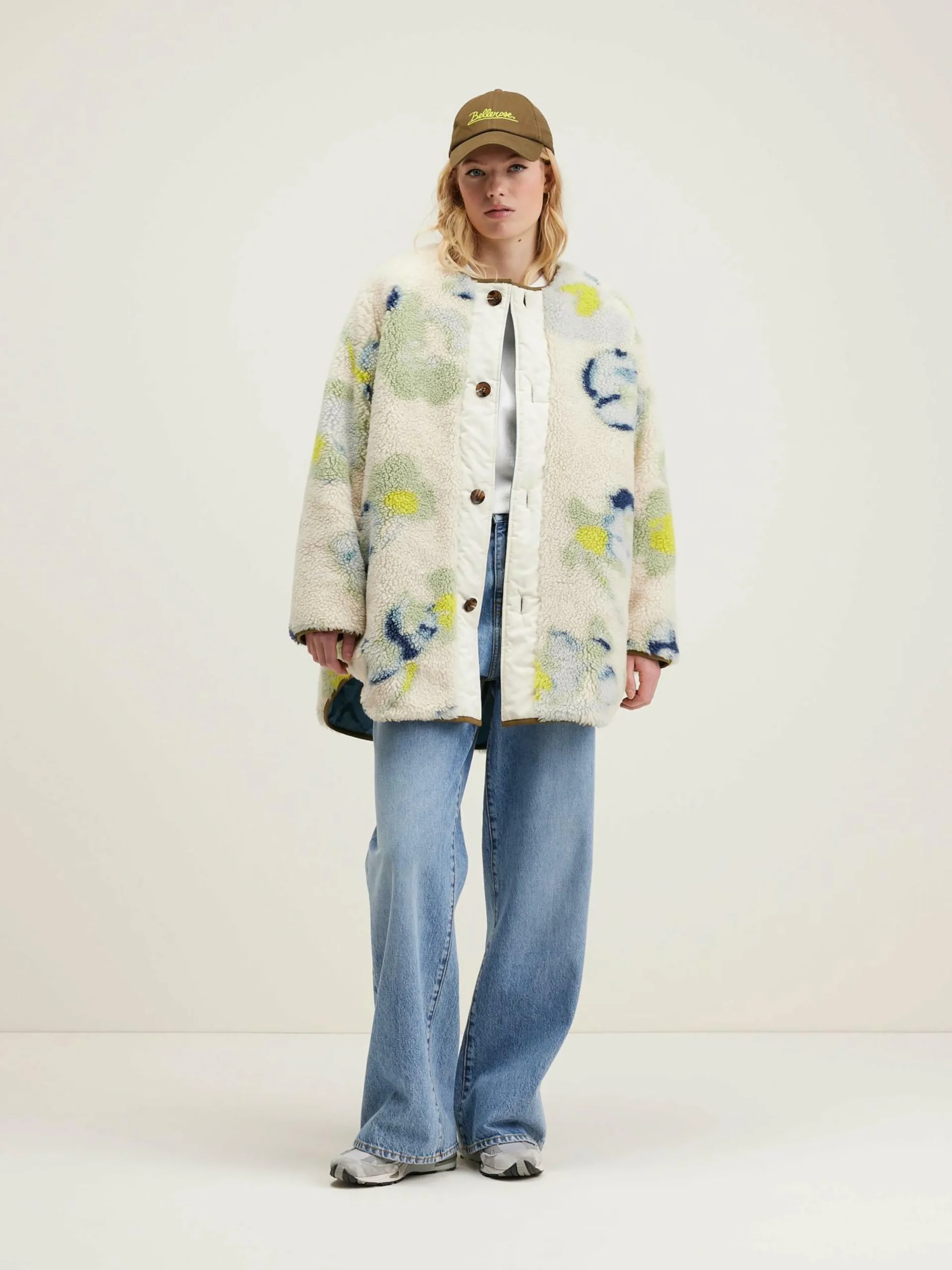 Veste bleue oversize et réversible. Une face satinée et matelassée en nylon bleu et une face en teddy imprimé de fleurs géantes.