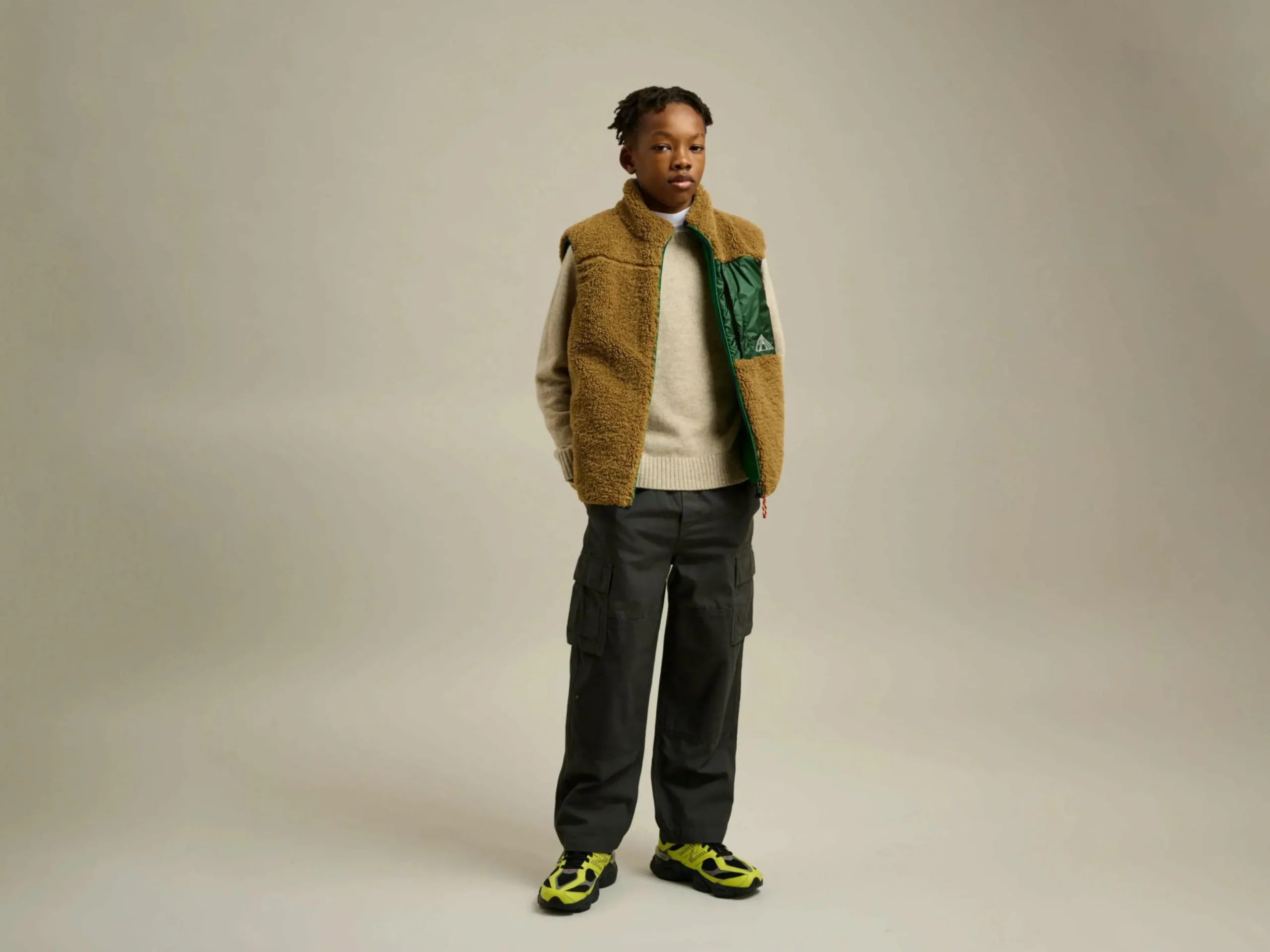 Bodywarmer réversible et genderless avec un côté en teddy et l’autre en tissu vert déperlant.