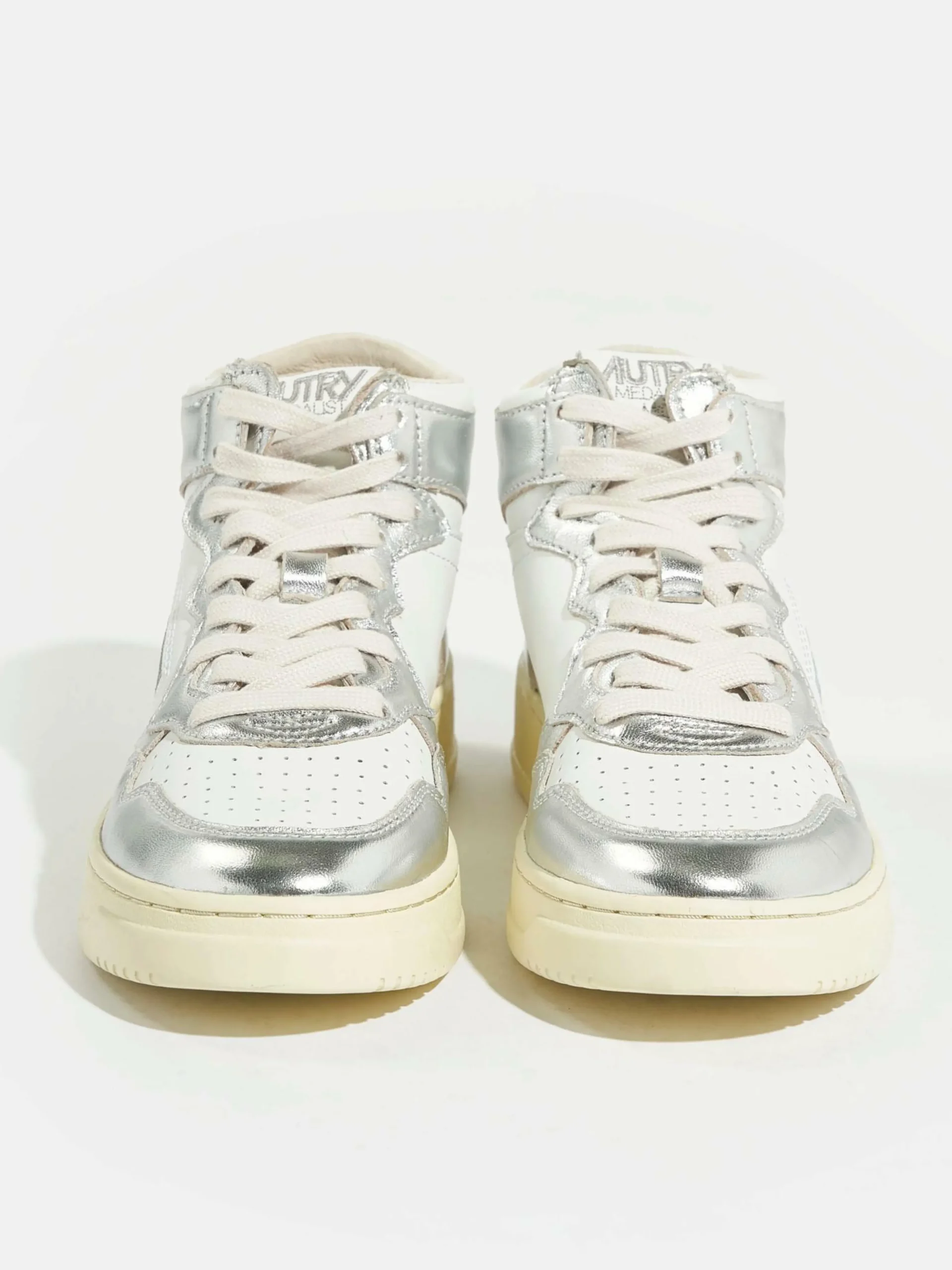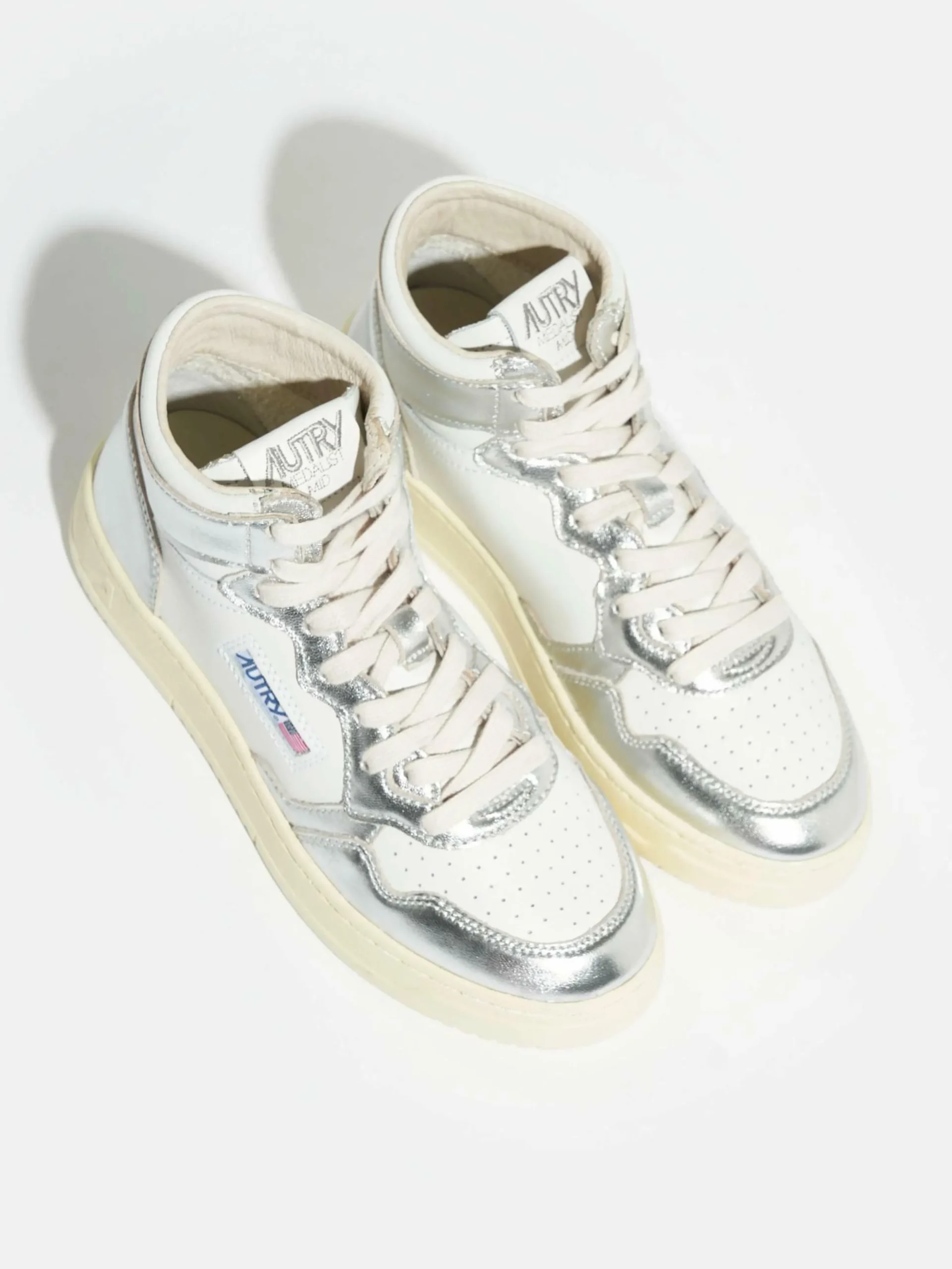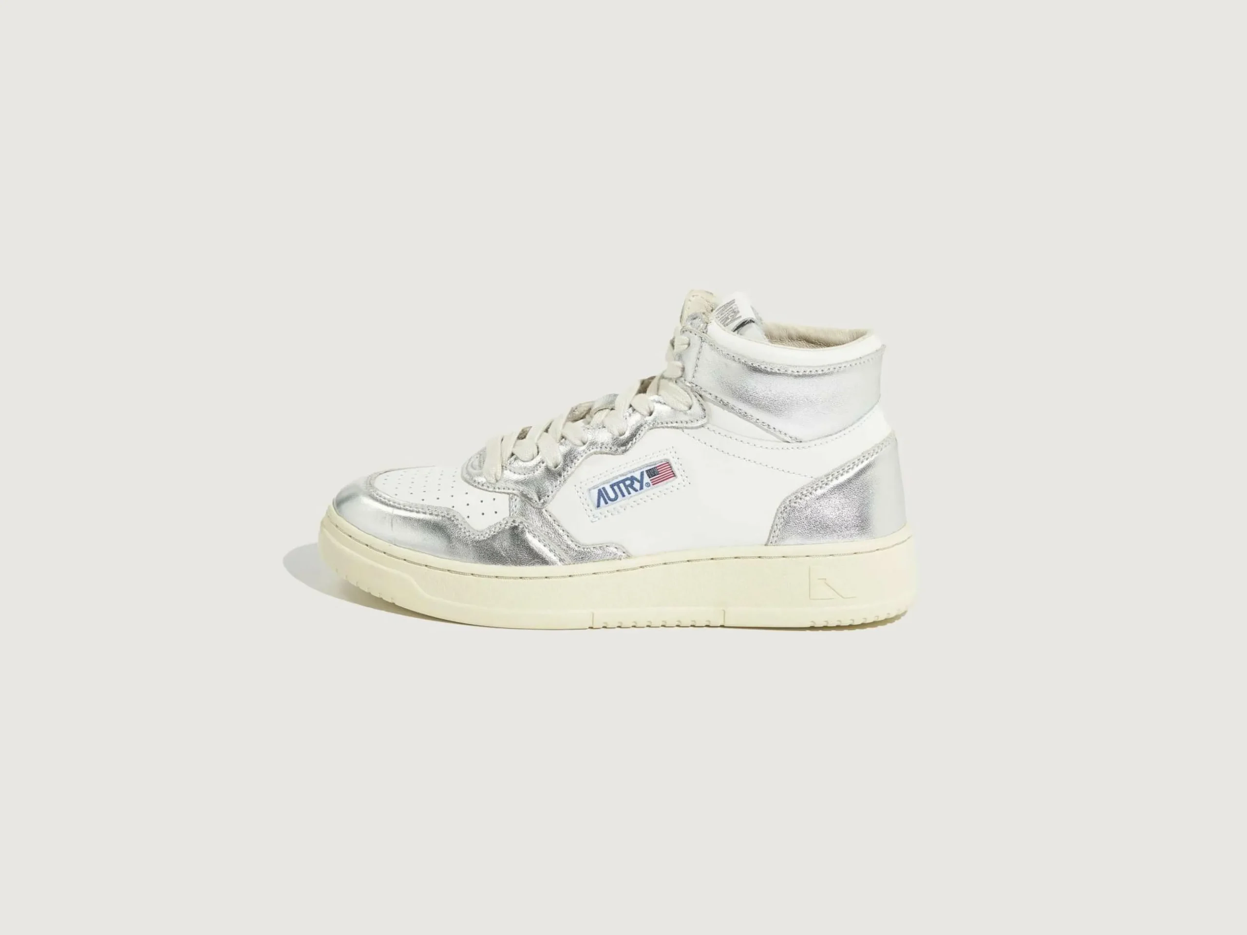 Les sneakers Autry Medalist Mid Bicolor montante possèdent une tige en cuir laminé argenté et blanc et une semelle en caoutchouc naturel.
