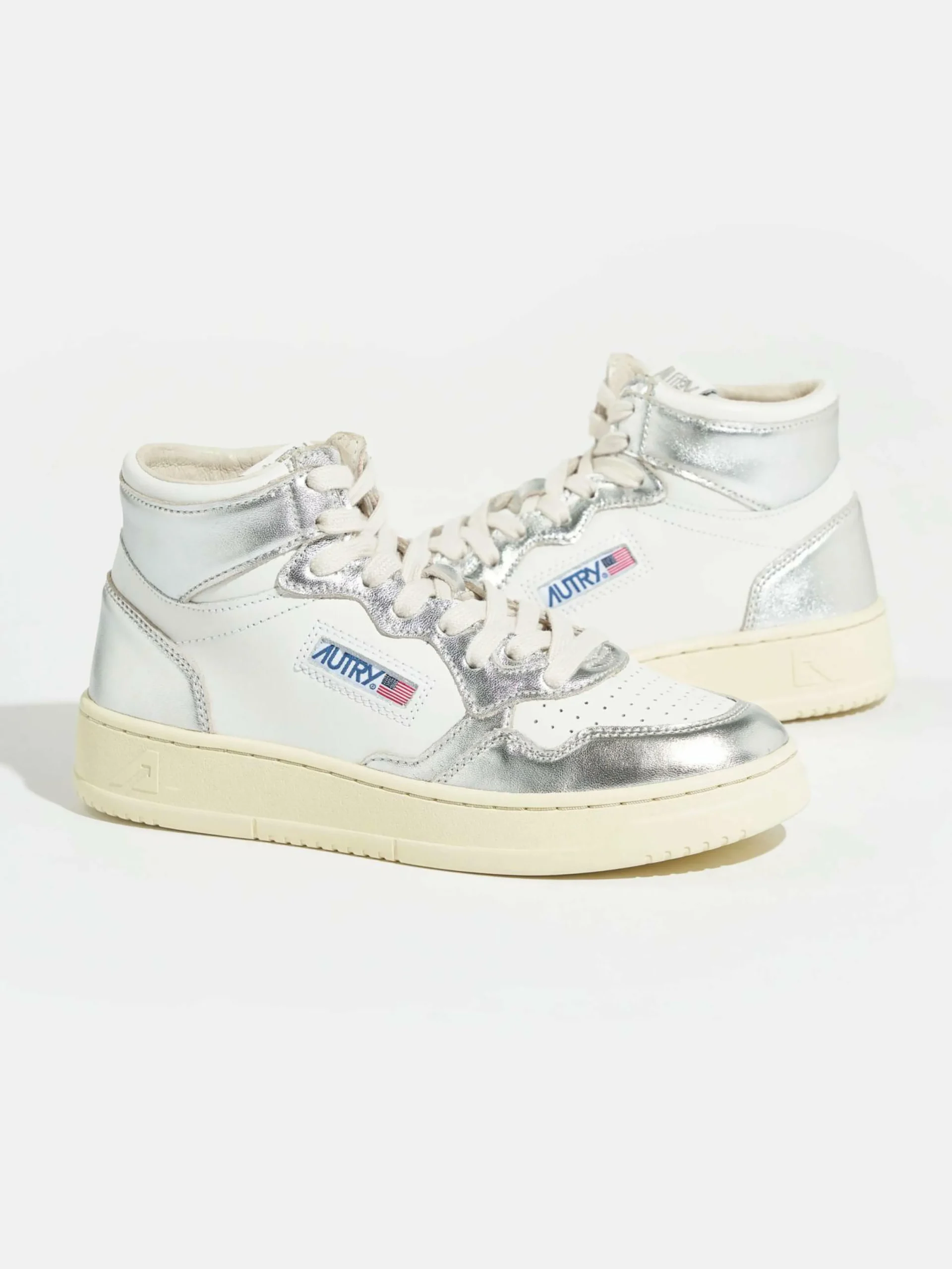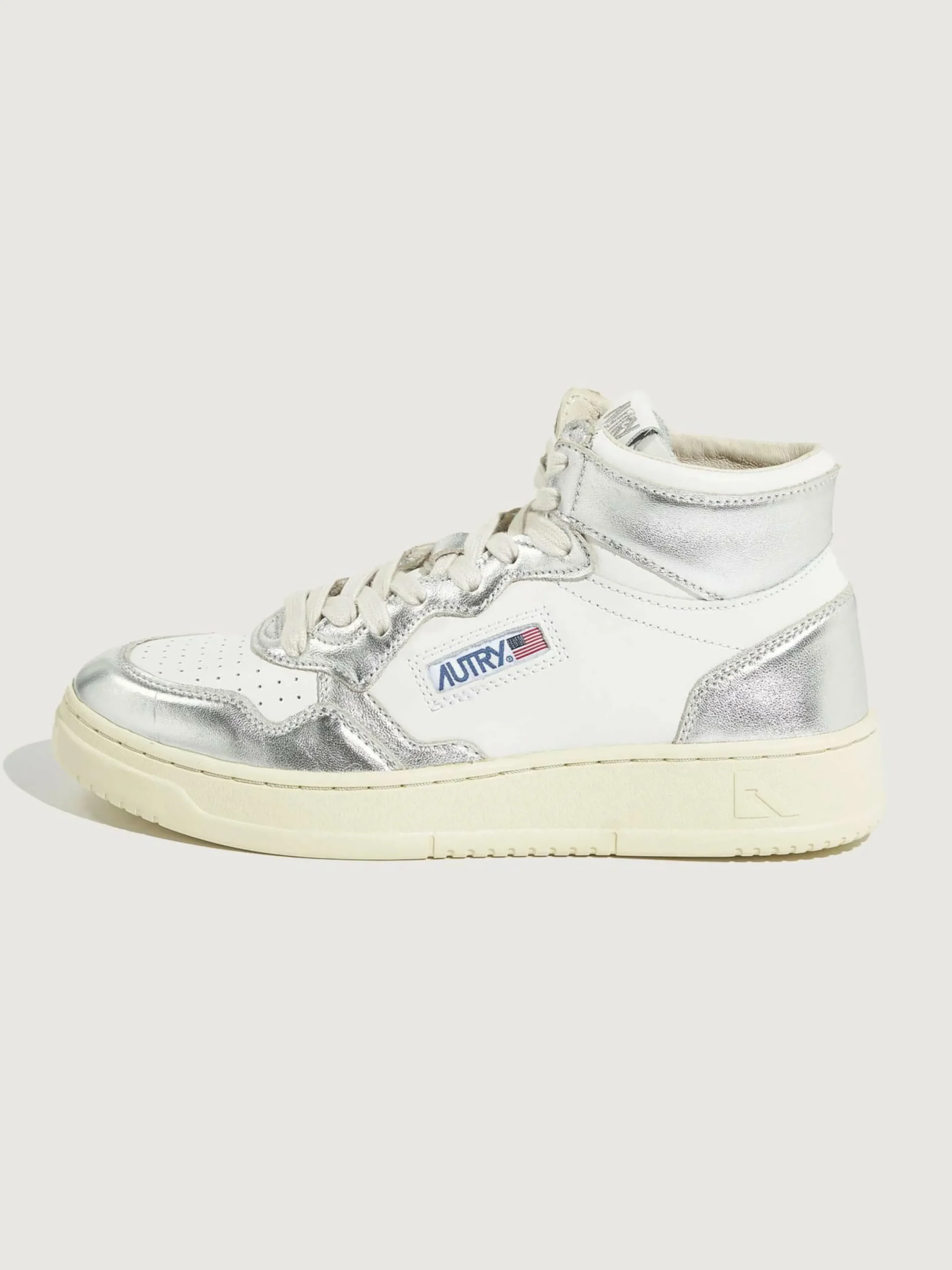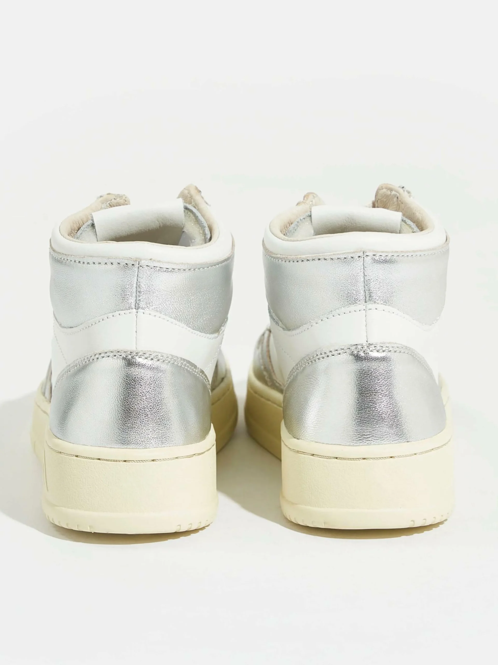 Les sneakers Autry Medalist Mid Bicolor montante possèdent une tige en cuir laminé argenté et blanc et une semelle en caoutchouc naturel.