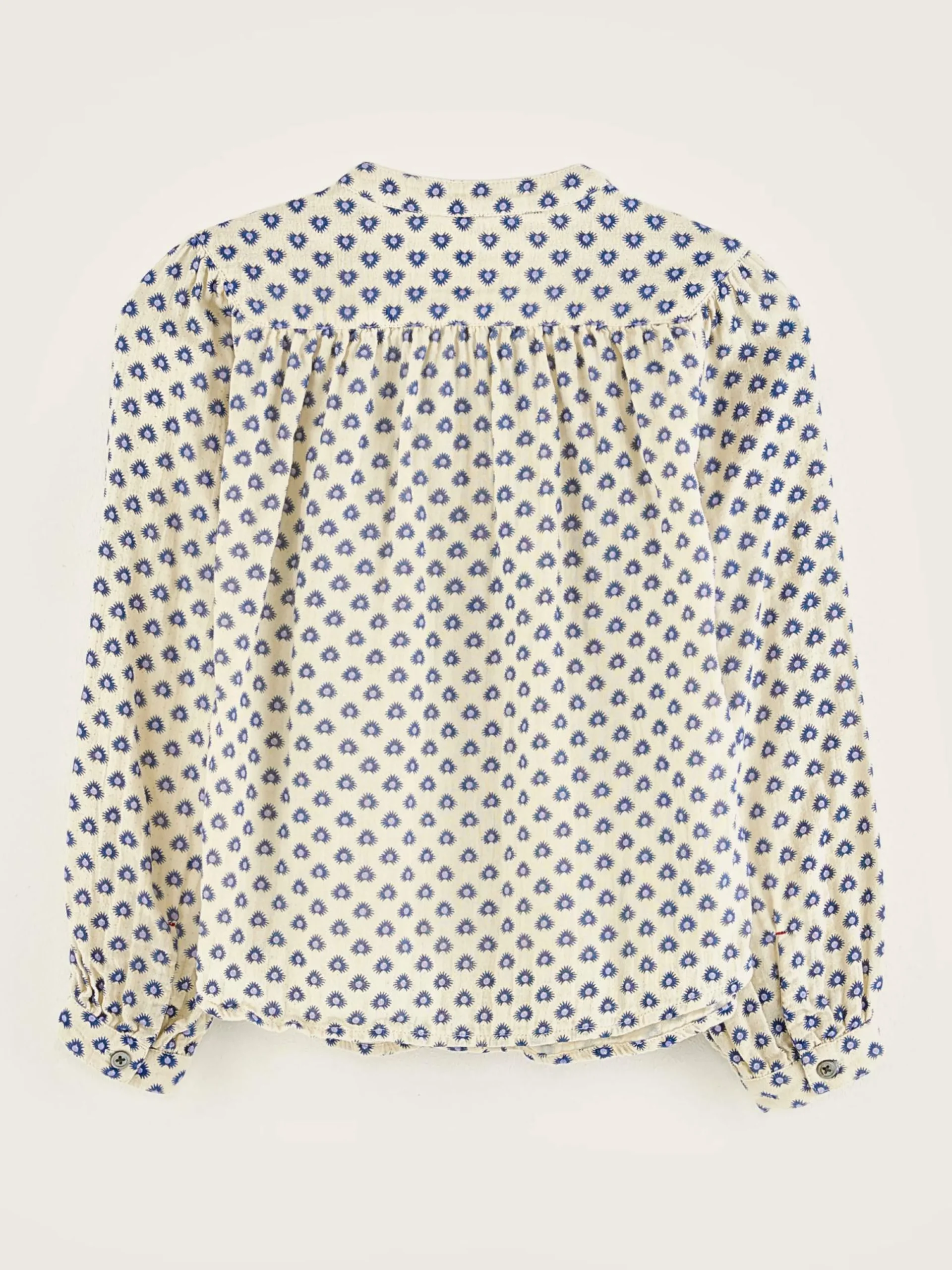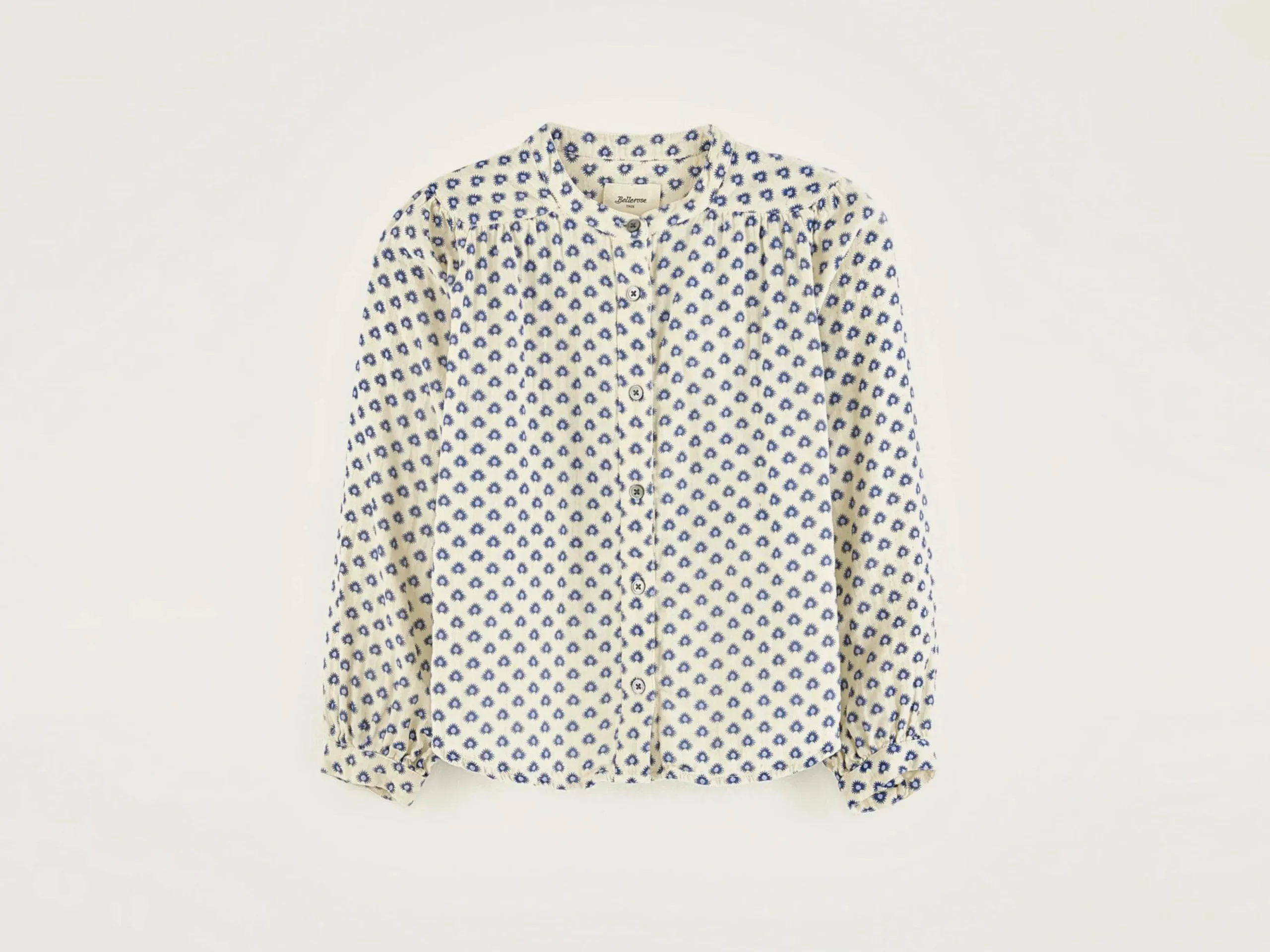 Blouse classique en coton tubique avec imprimé bleu et or.