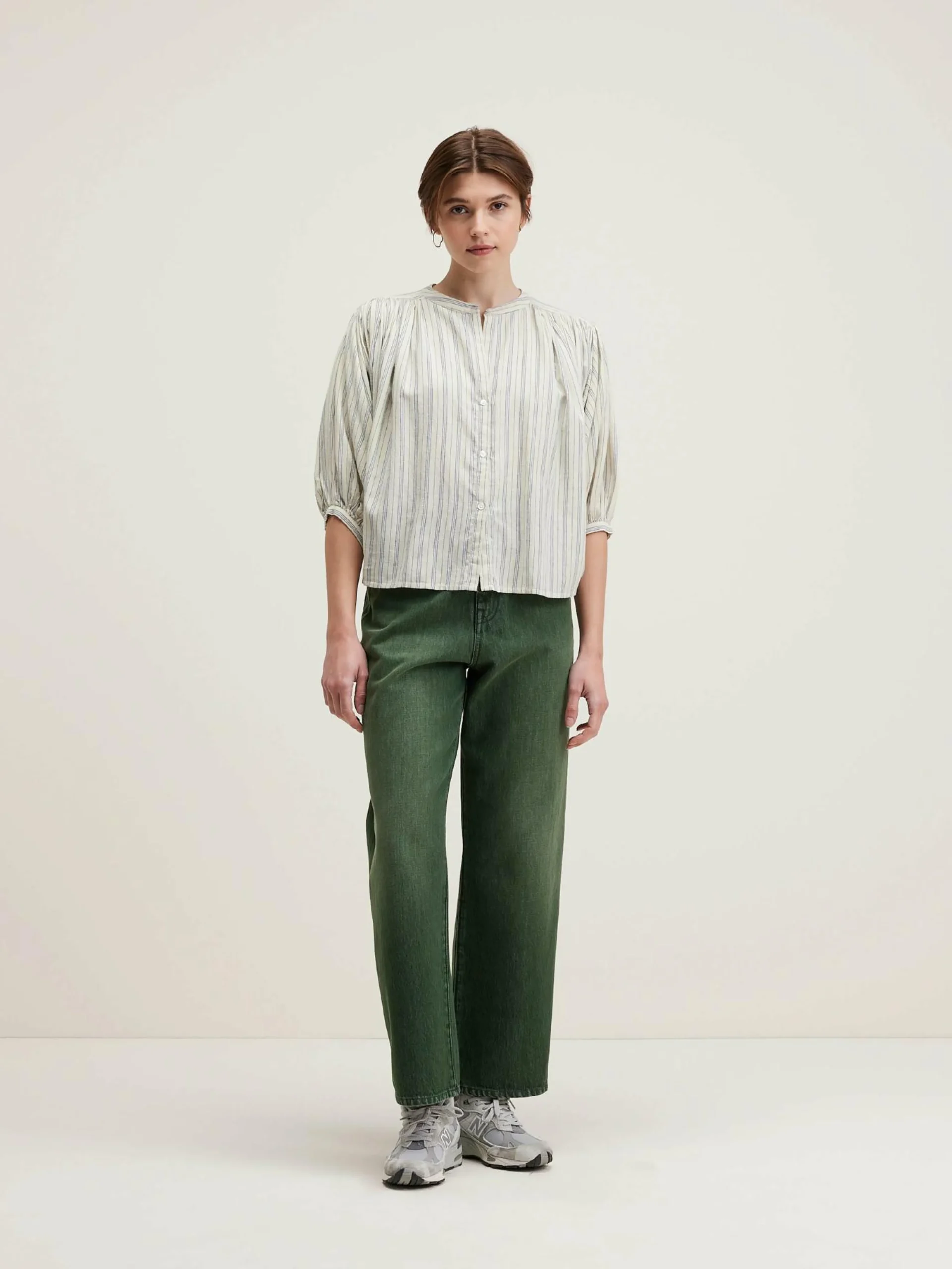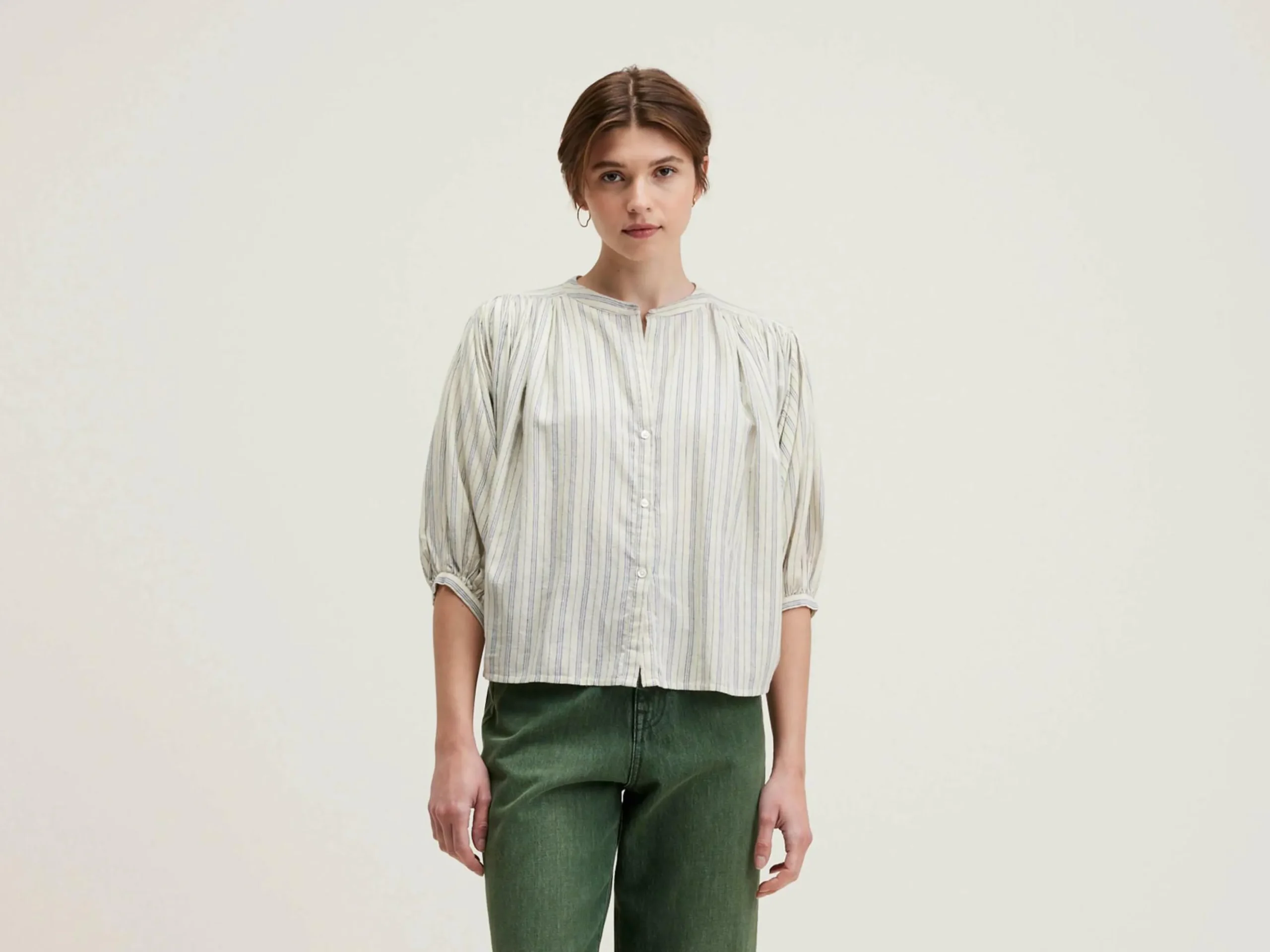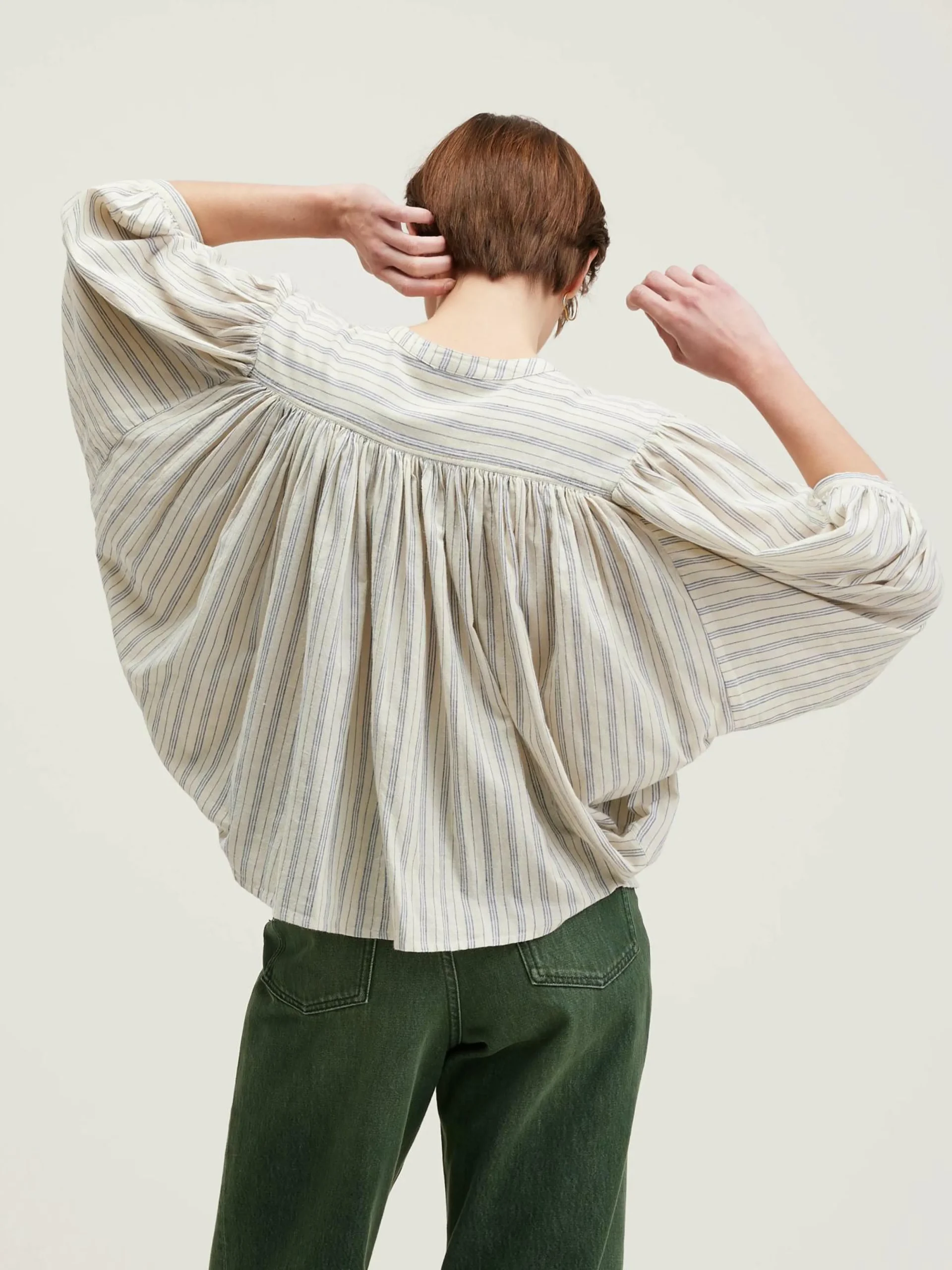 Blouse courte et oversize en coton rayé, accentuée de détails de fronces.