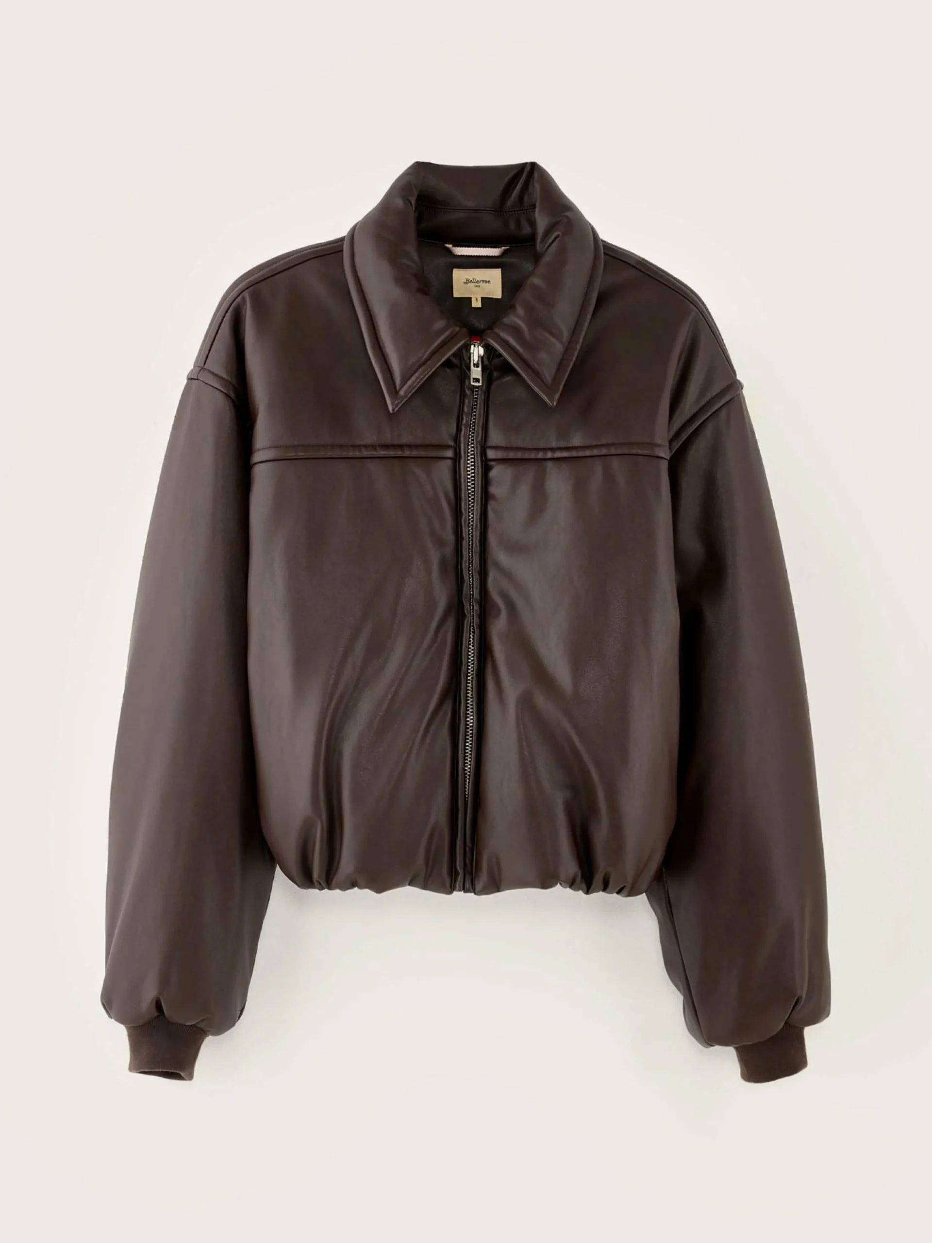 Bomber rembourré en faux cuir marron foncé avec col classique et finitions bords côtes.