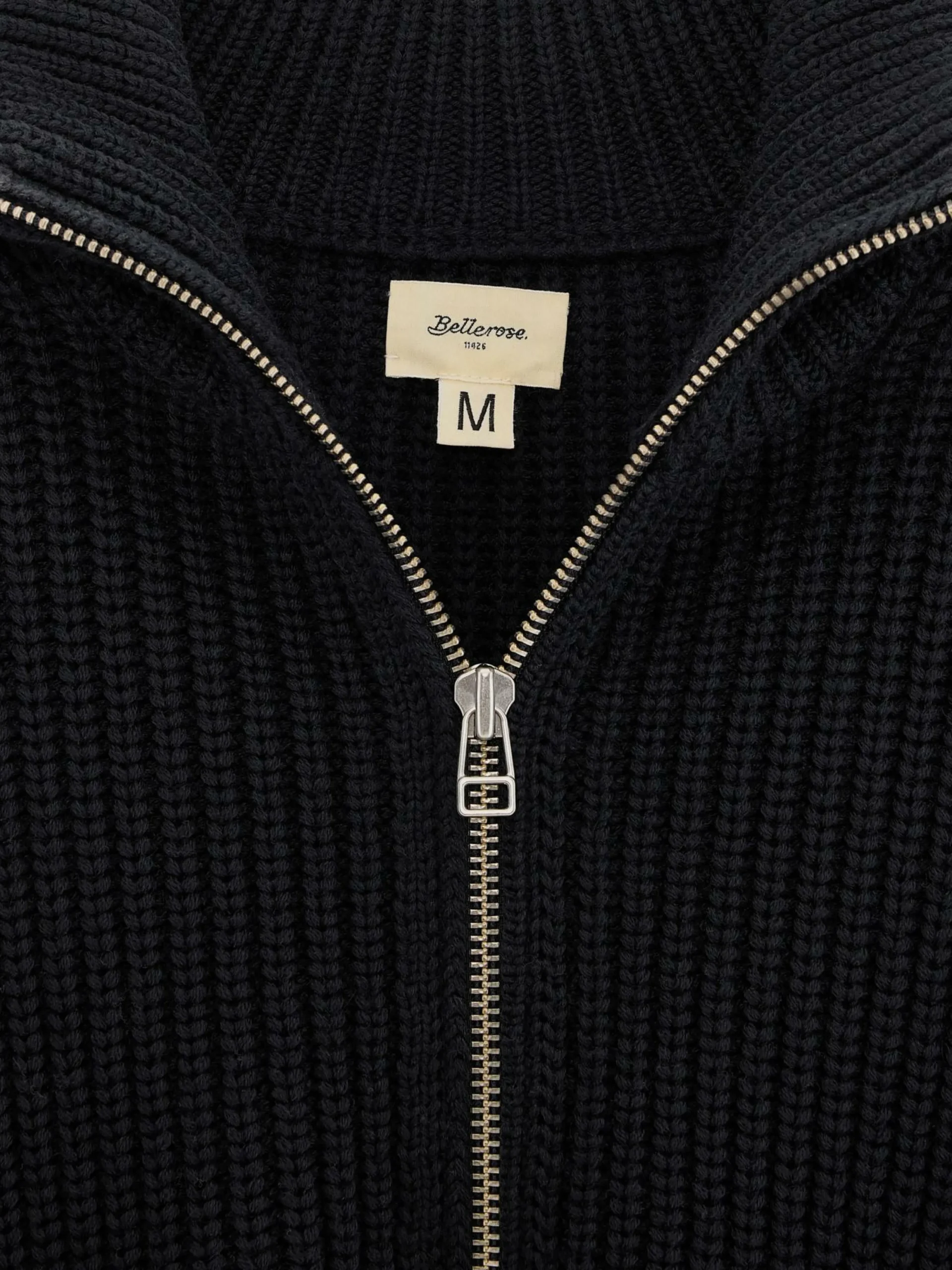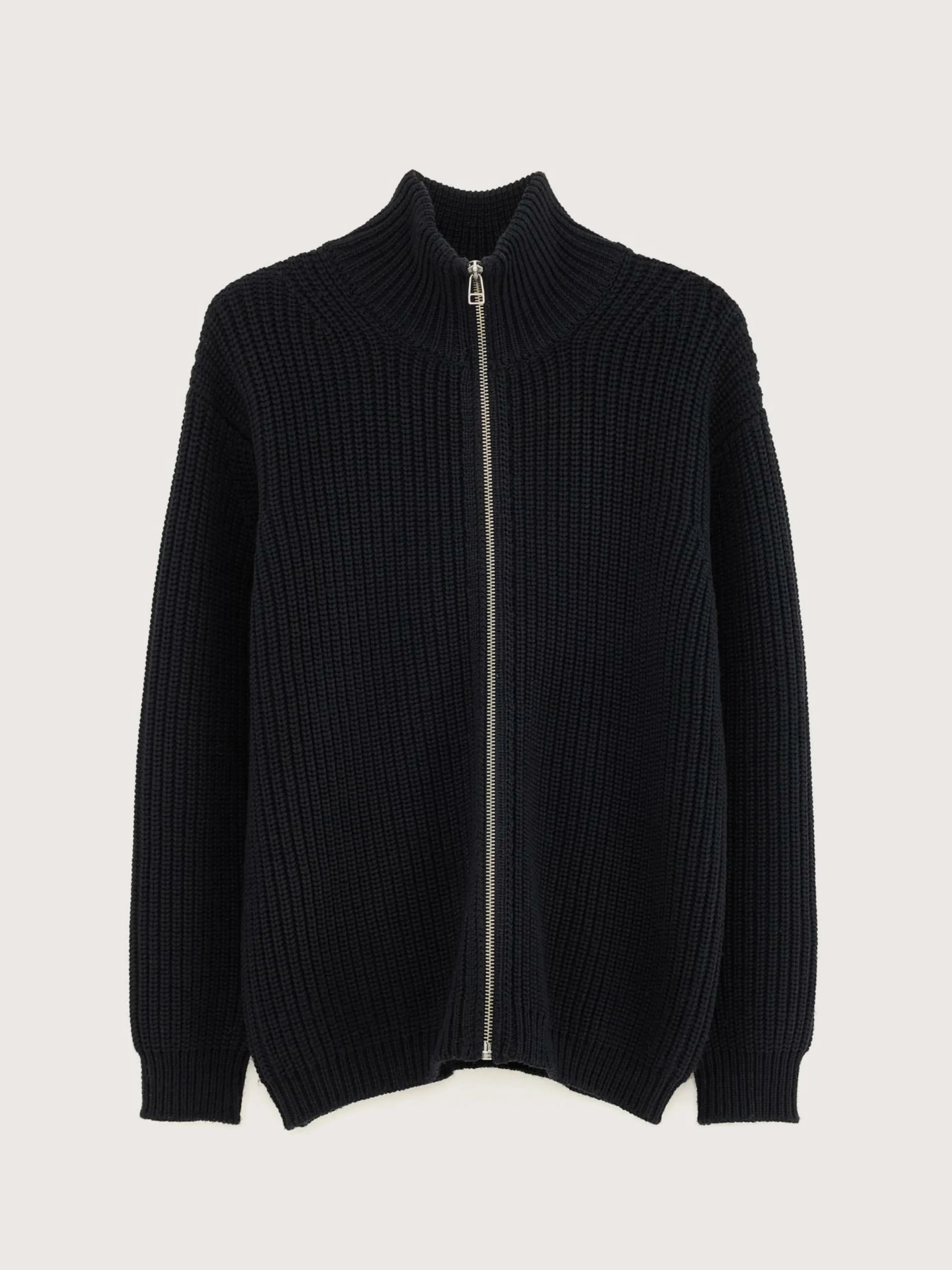 Cardigan décontracté en laine épaisse bleu marine.