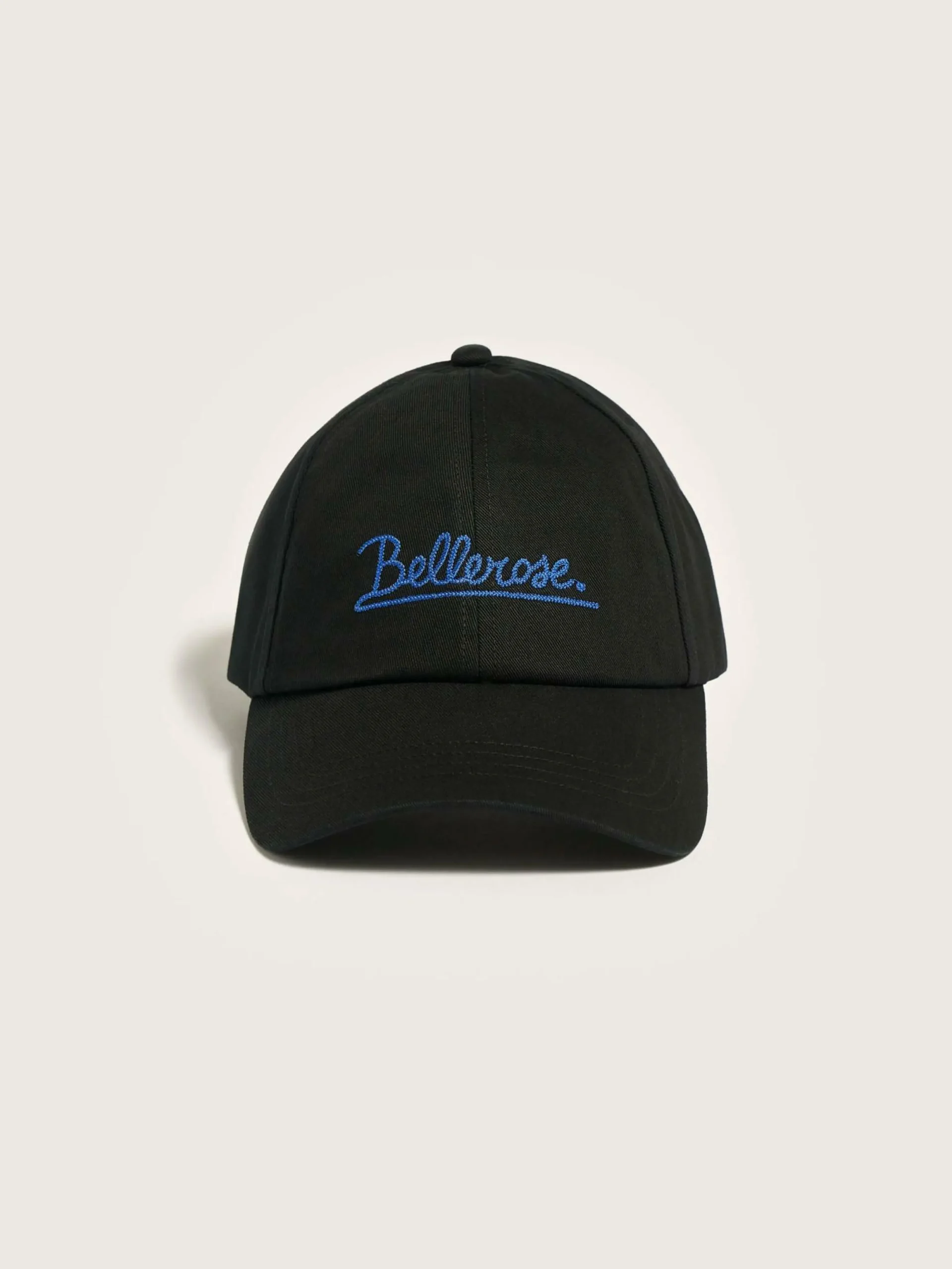 Casquette classique à 6 panneaux en coton noir avec broderie Bellerose bleu à l’avant.