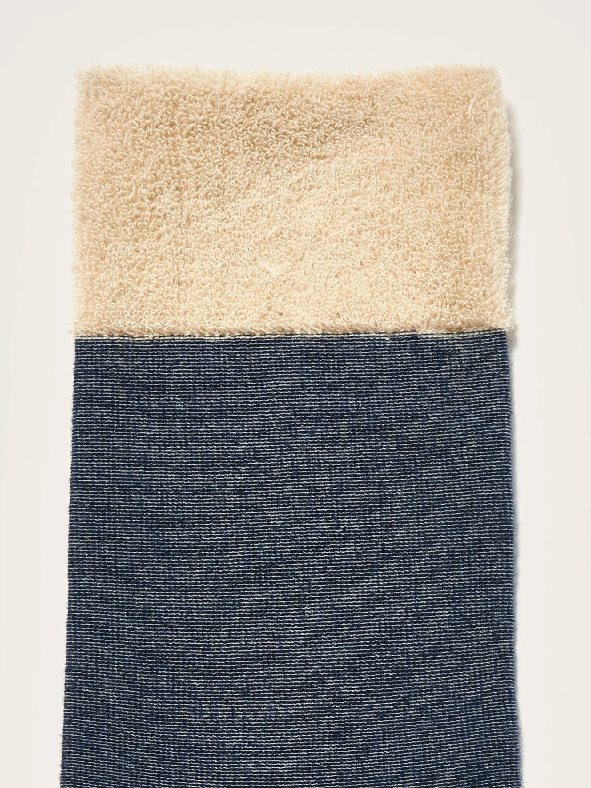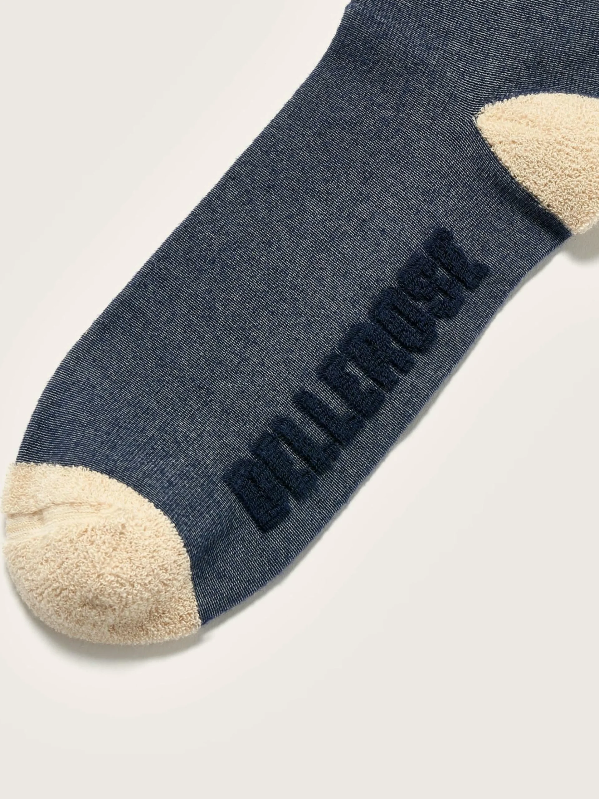 Chaussettes classiques bleues avec signature Bellerose en maille éponge sur la semelle.