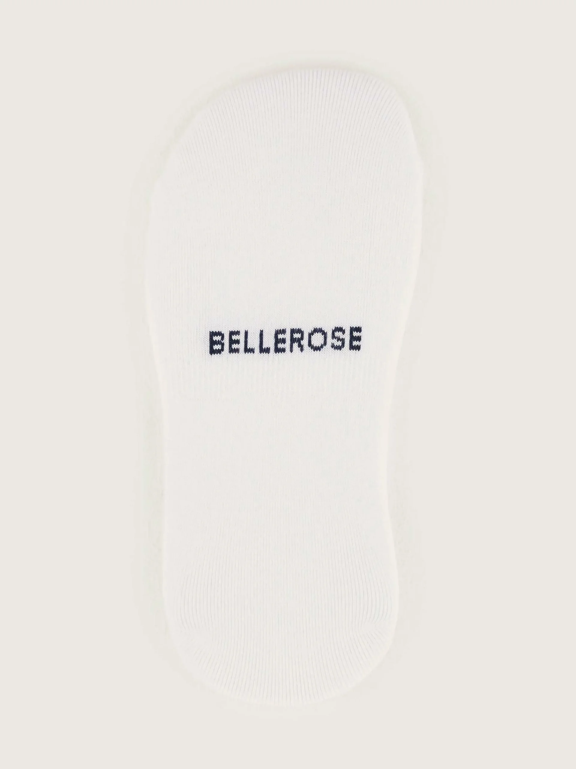 Chaussettes courtes blanches en tricot côtelé autour du pied et gomme antidérapante derrière le talon.