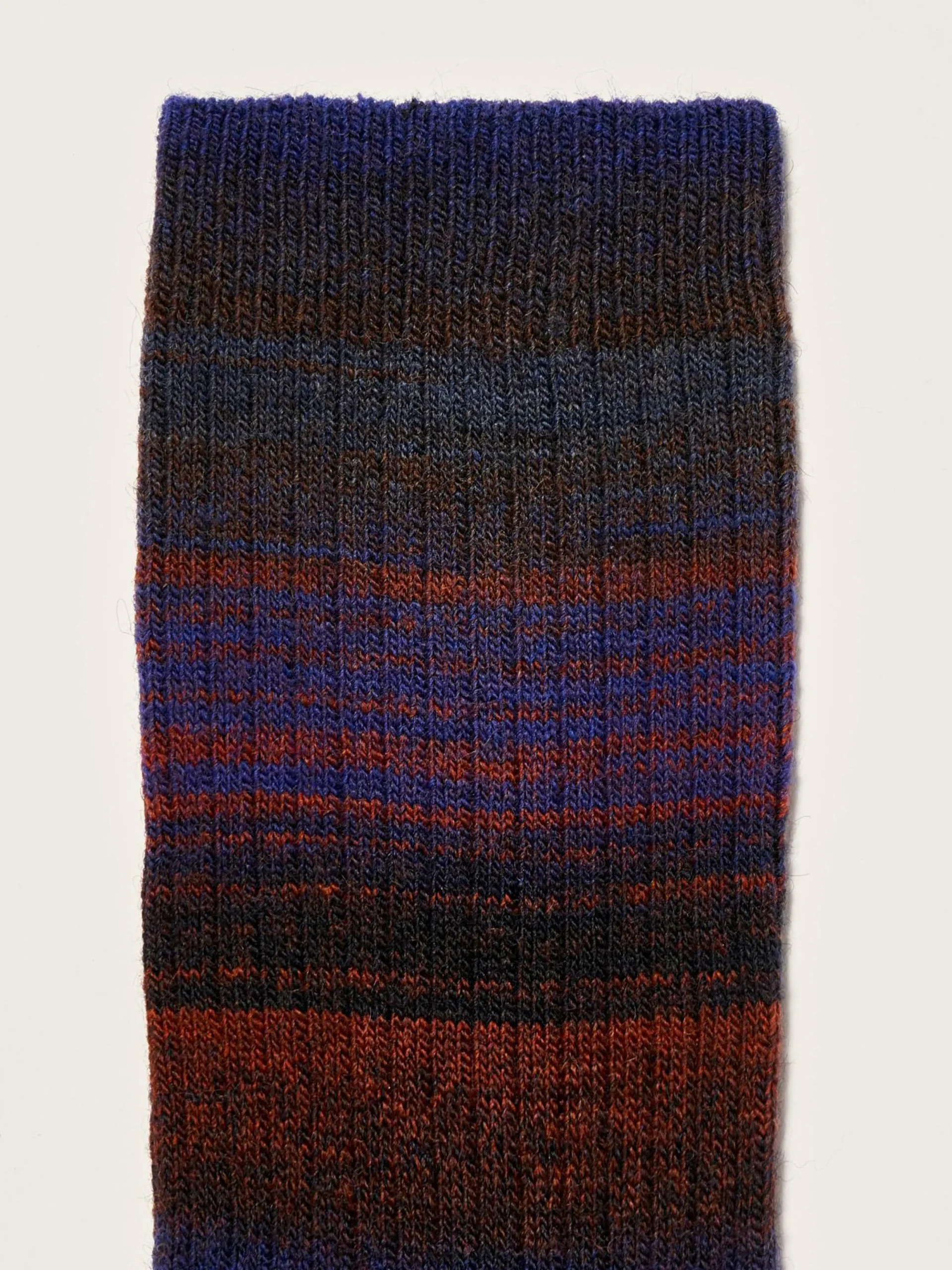 Chaussettes en maille côtelée tricotées en fil imprimé dans des tons violets, avec pointes et talons contrastés.