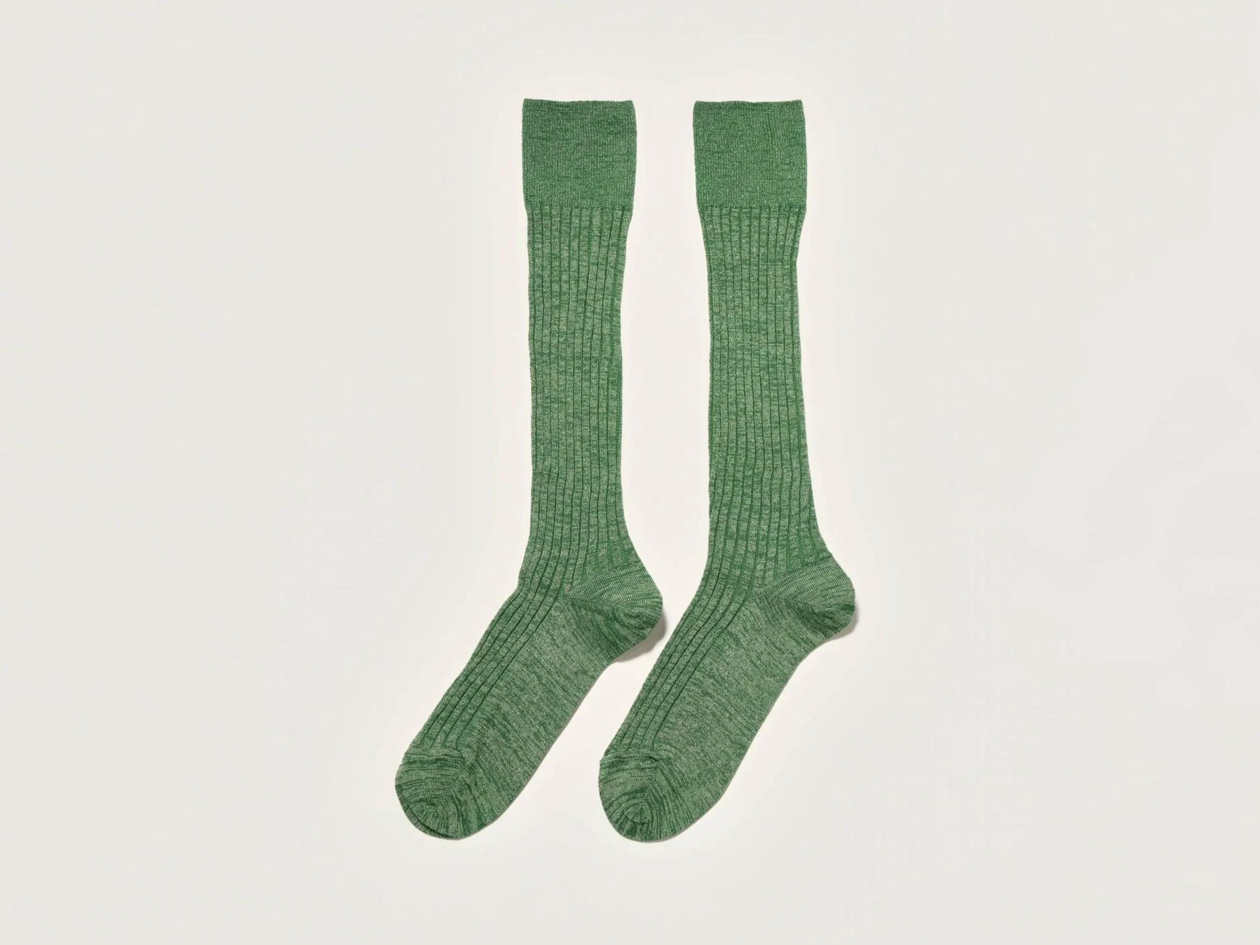 Chaussettes montantes en maille côtelée couleur vert chlorophyle et fil lurex.