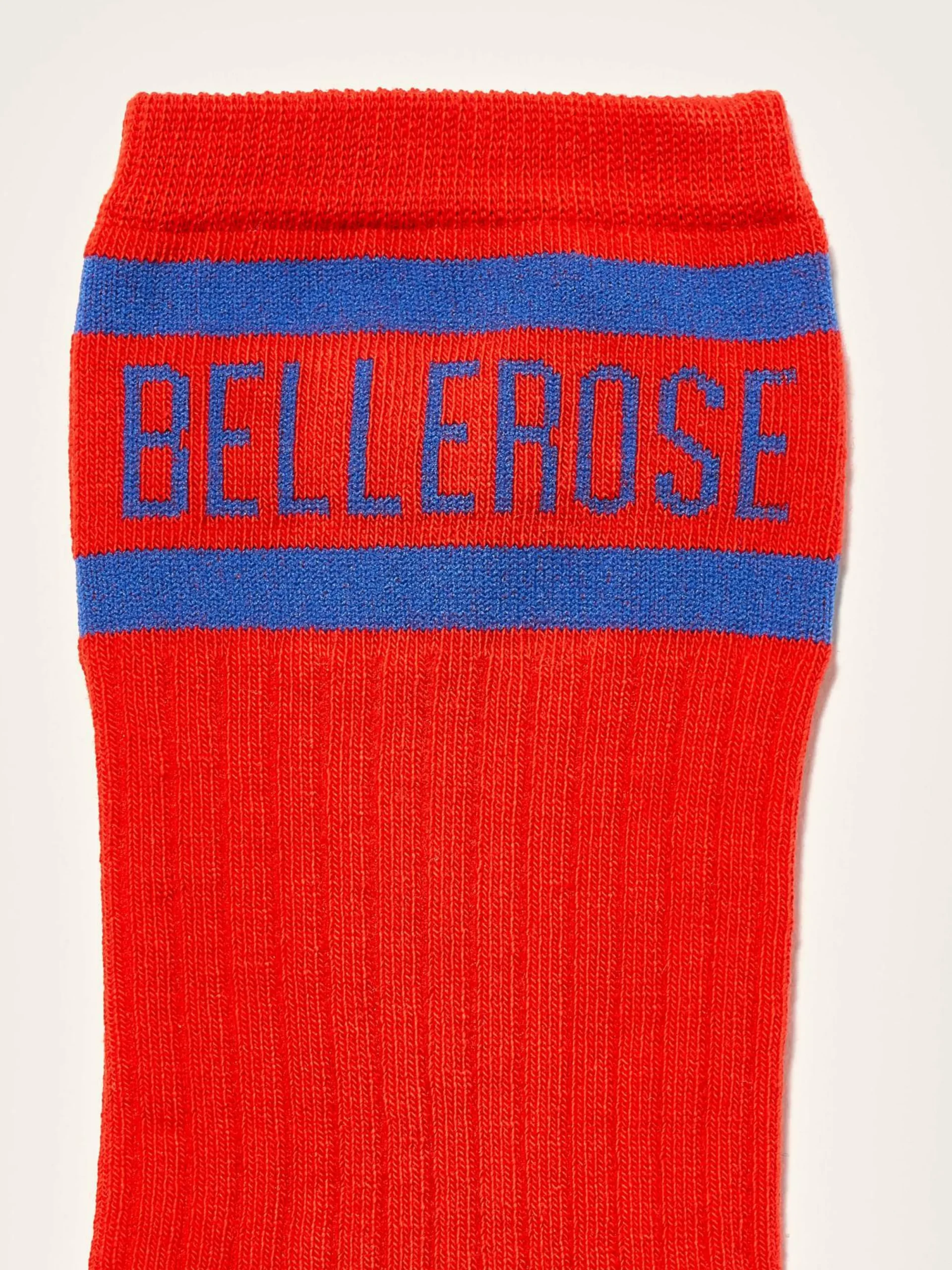 Chaussettes classiques rouges avec logo Bellerose bleu sur la cheville.
