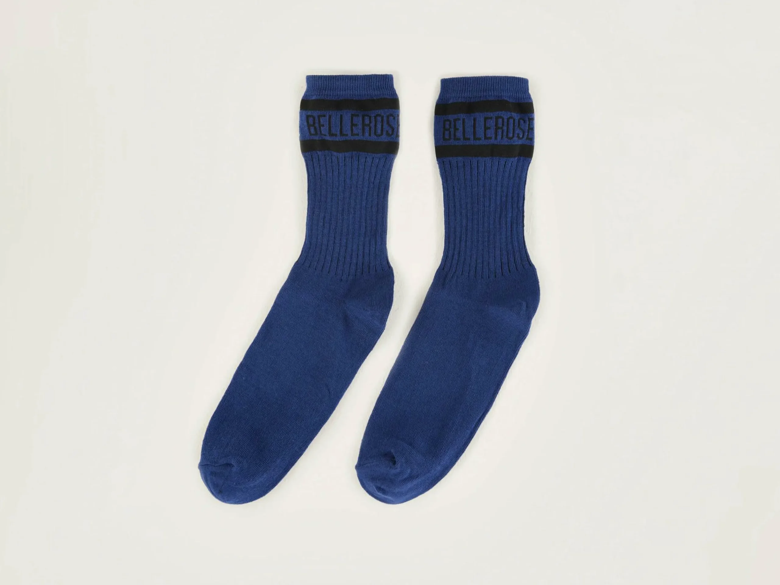 Chaussettes classiques en bleu avec le logo Bellerose en noir sur la cheville.