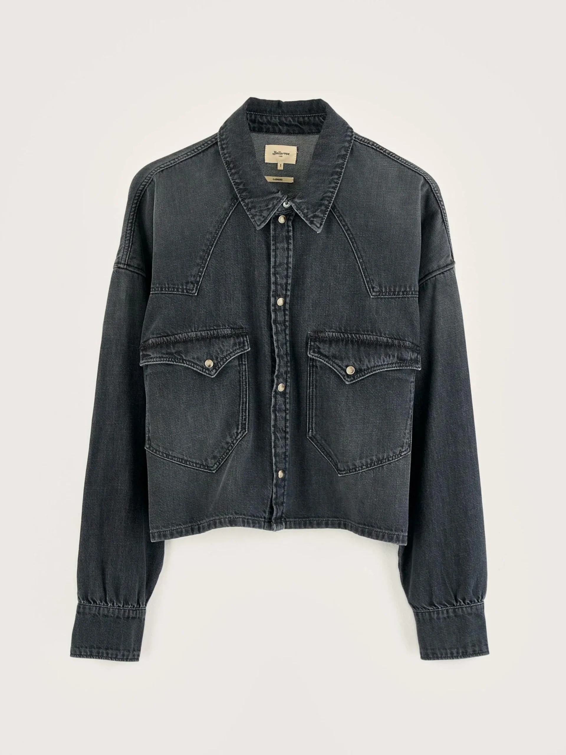 Chemise d’inspiration western, oversize et cropped, en denim de coton noir usé.