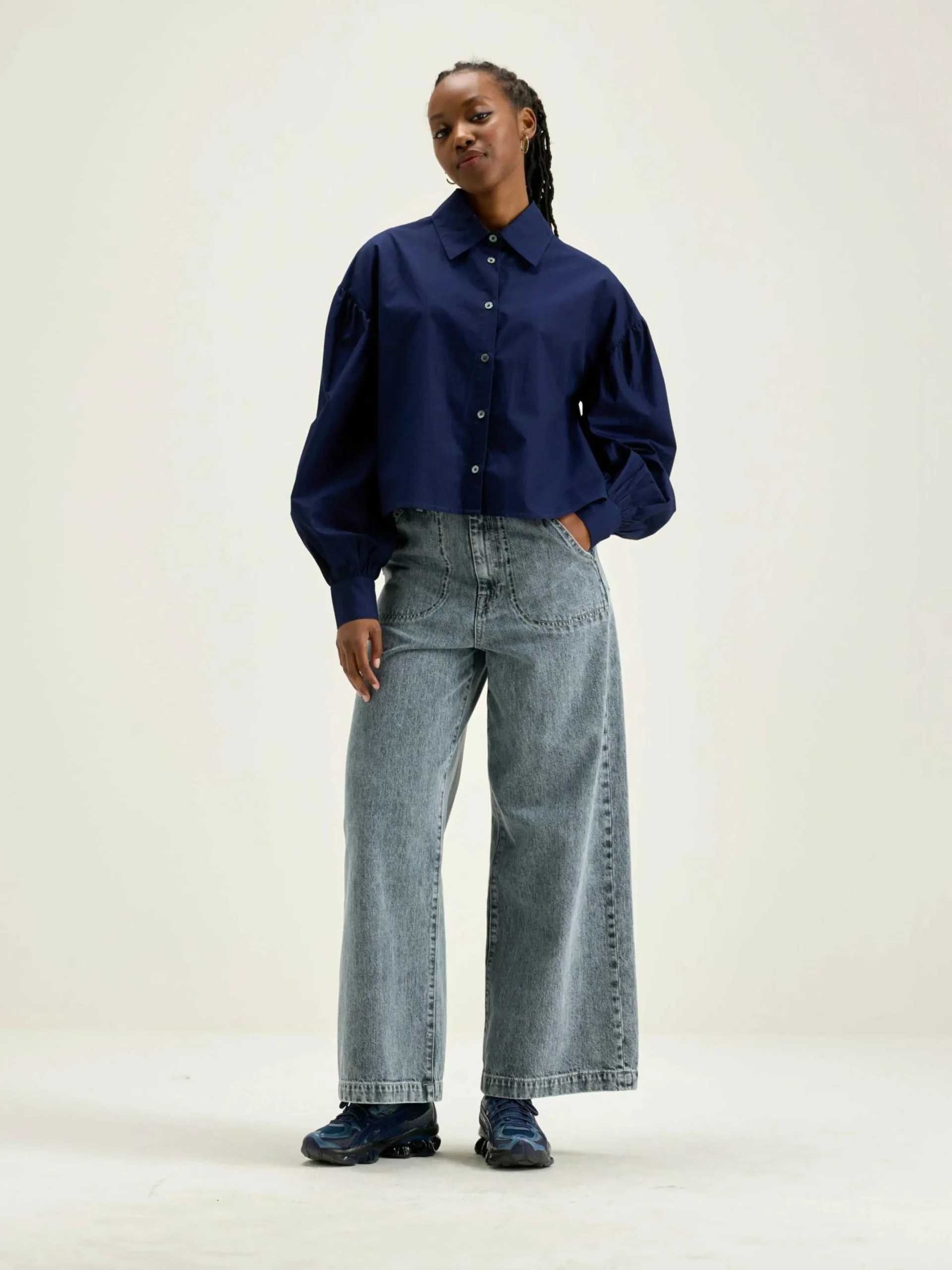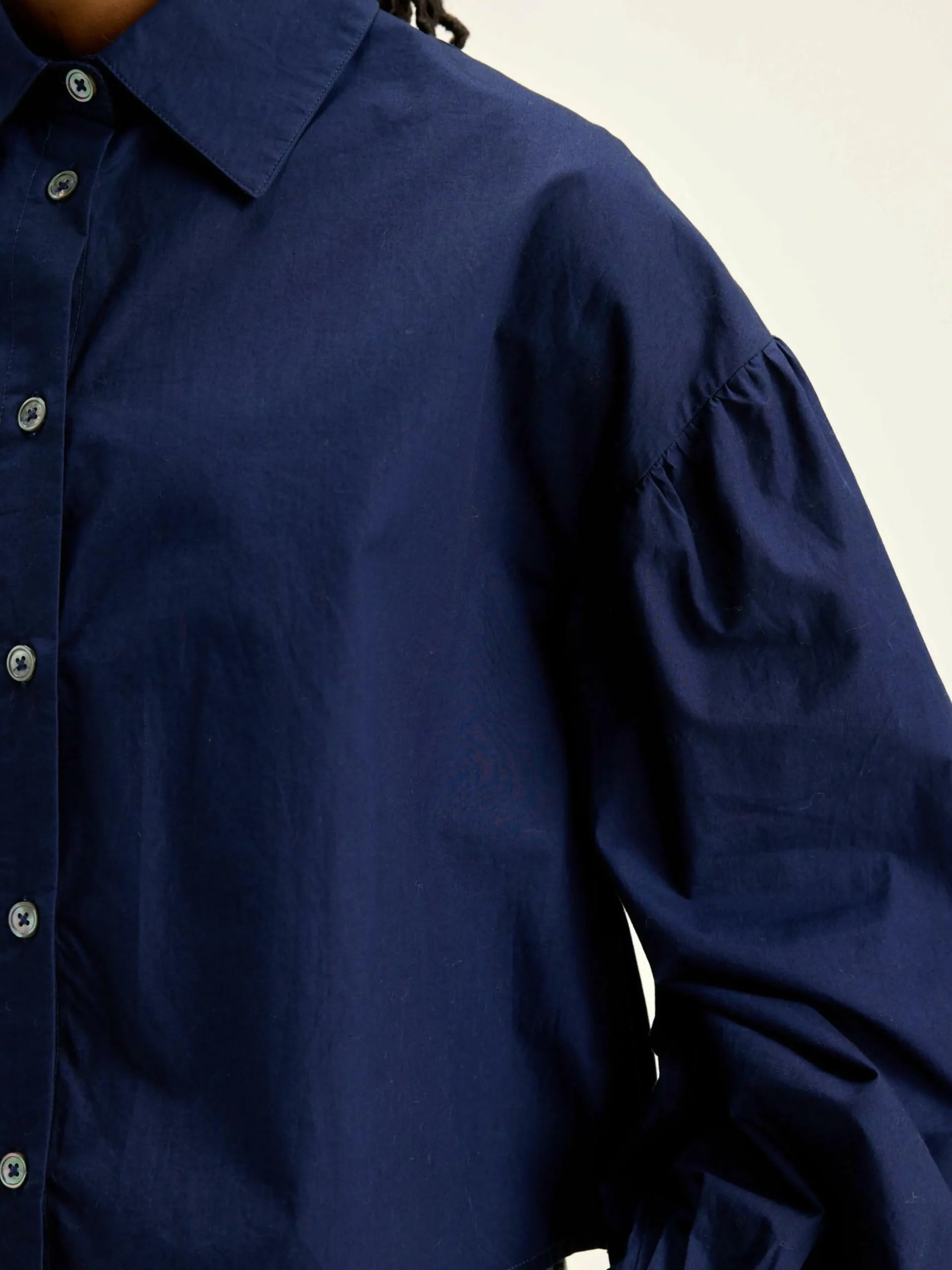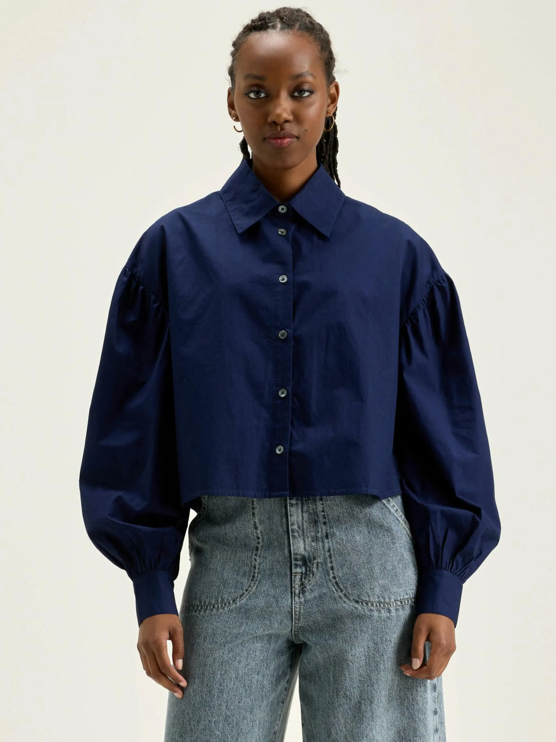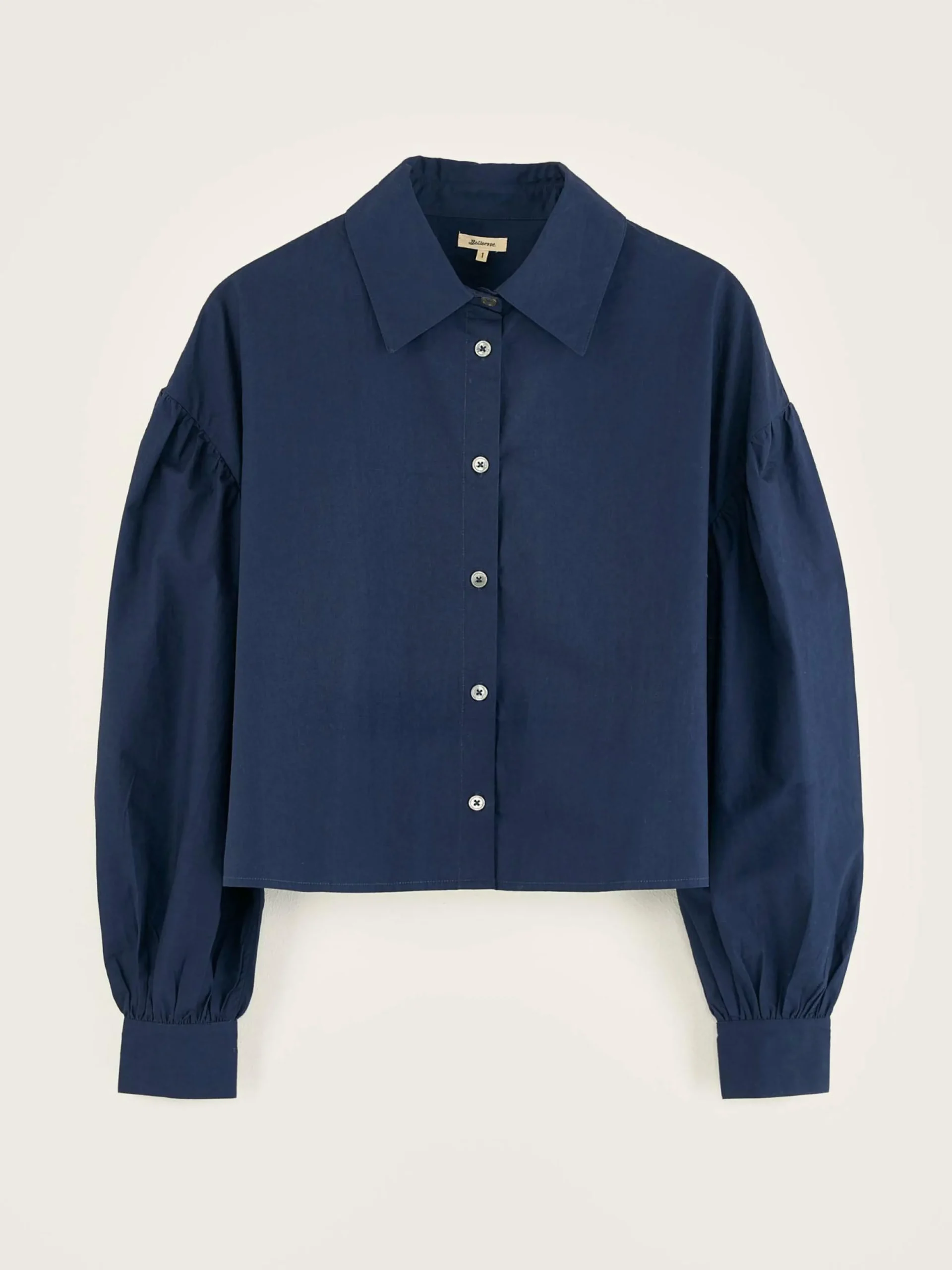 Chemise courte en popeline de coton bleu marine avec manches bouffantes.