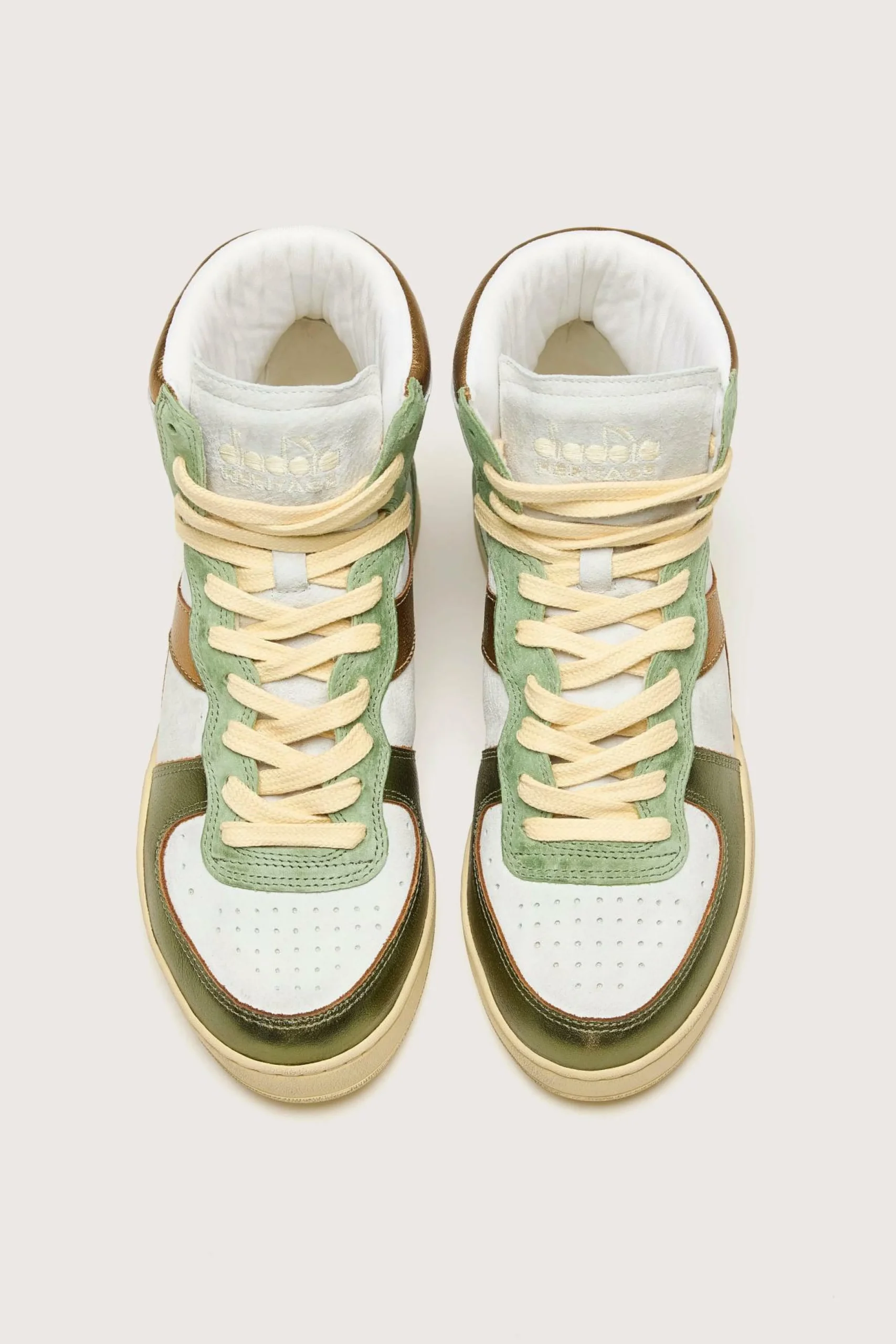 Les sneakers Diadora Mi Basket Metal Pigskin Used héritage présentent un cuir métallisé avec un traitement vieilli et délavé à la pierre.