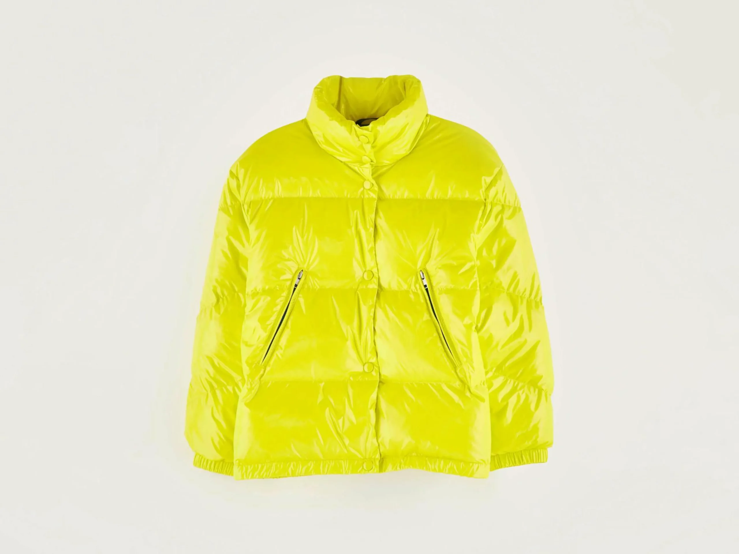 Doudoune jaune fluo avec zip avant et boutons-pression dans le bas permettant d’ajuster la longueur d’une coupe classique à une coupe courte.