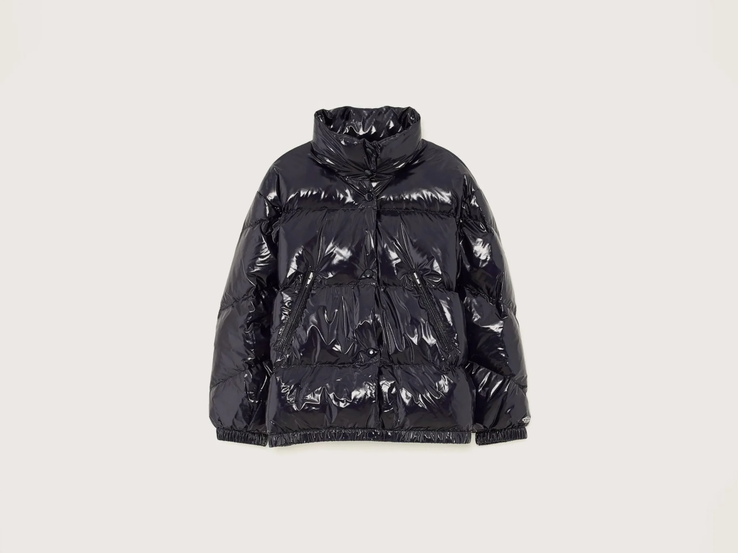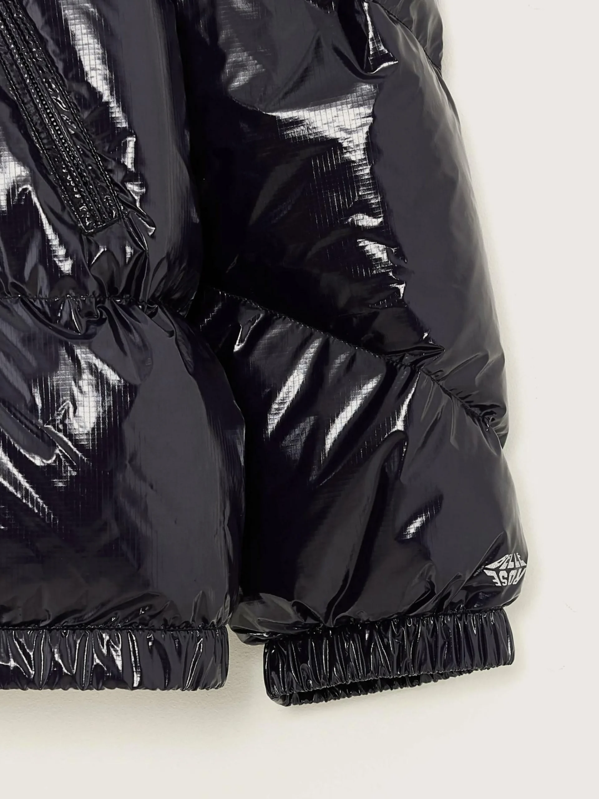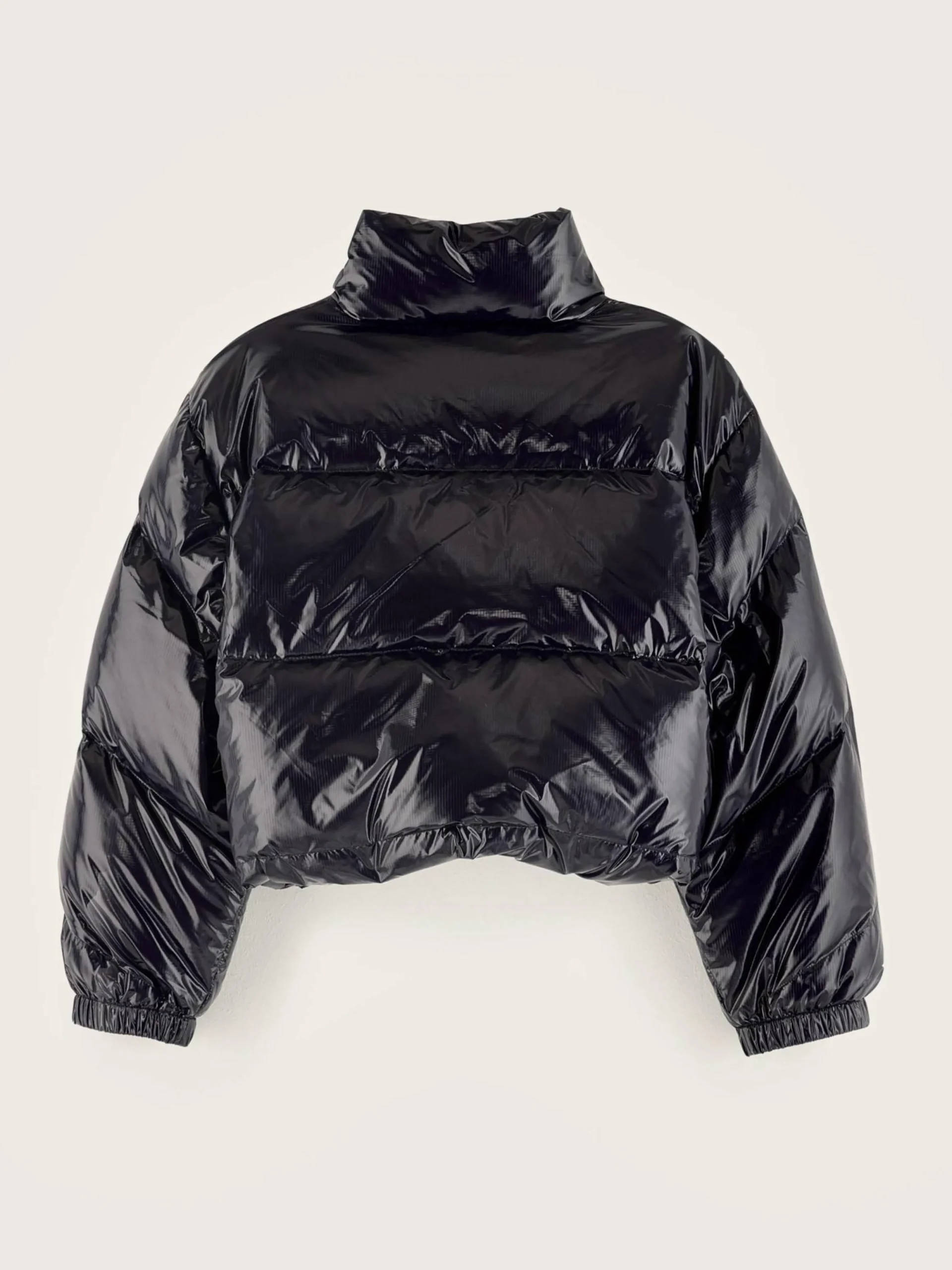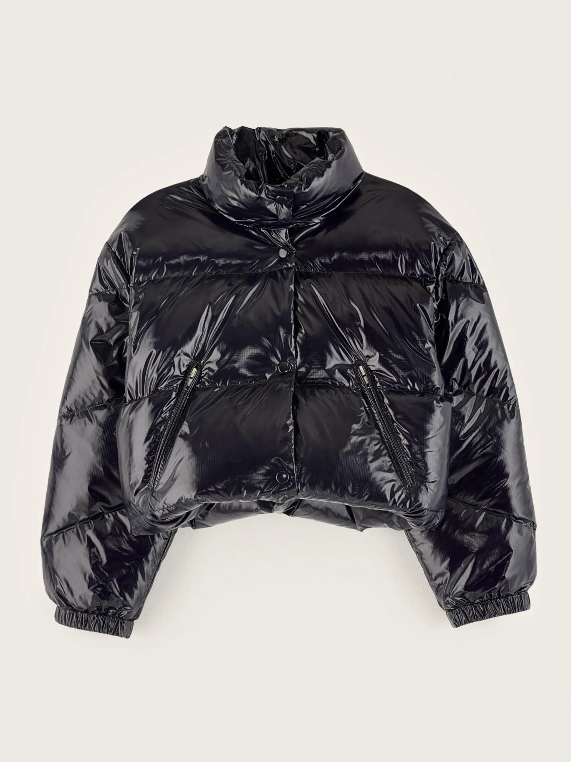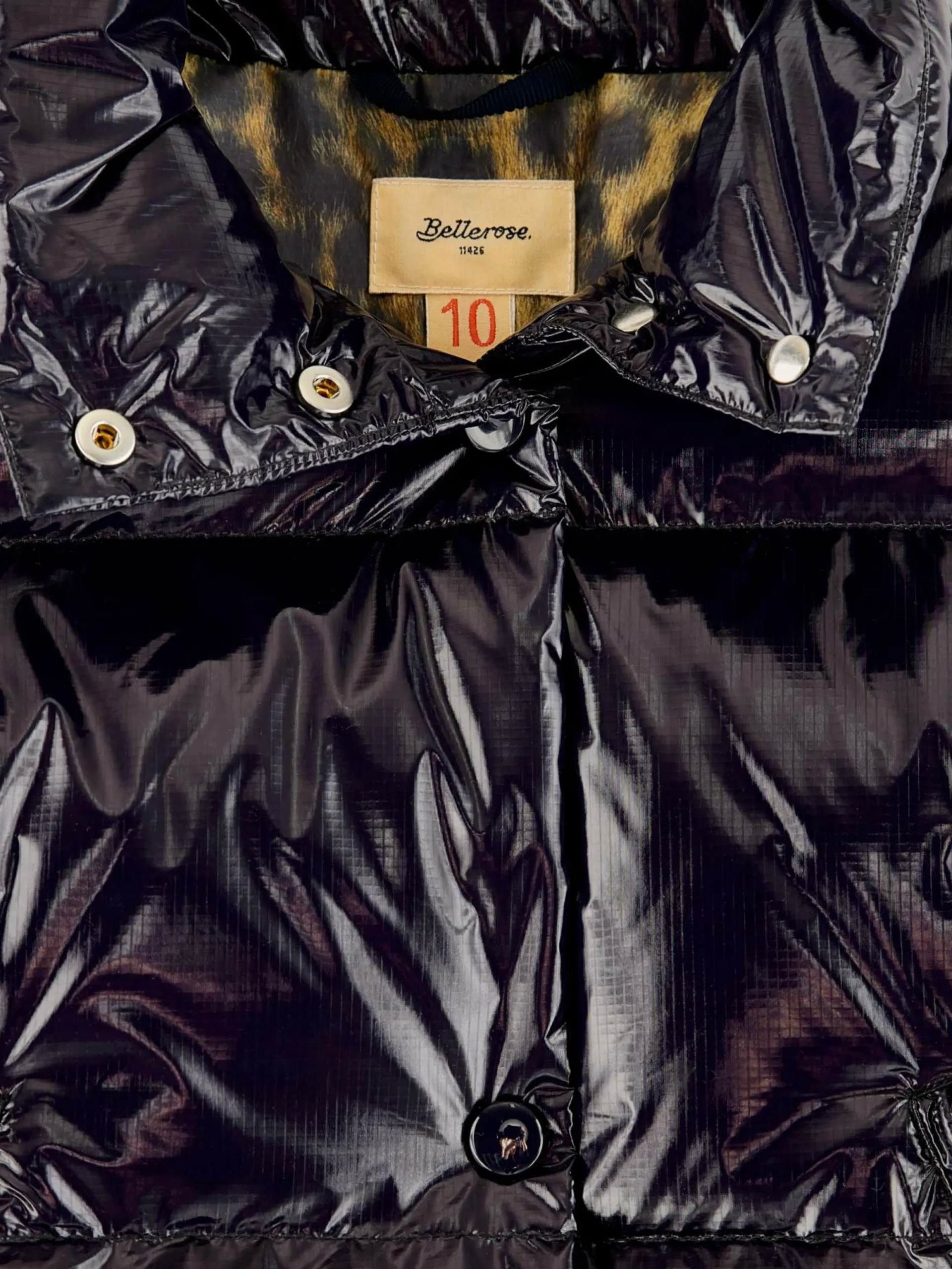 Doudoune bleue avec zip avant et boutons-pression dans le bas permettant d’ajuster la longueur d’une coupe classique à une coupe courte.