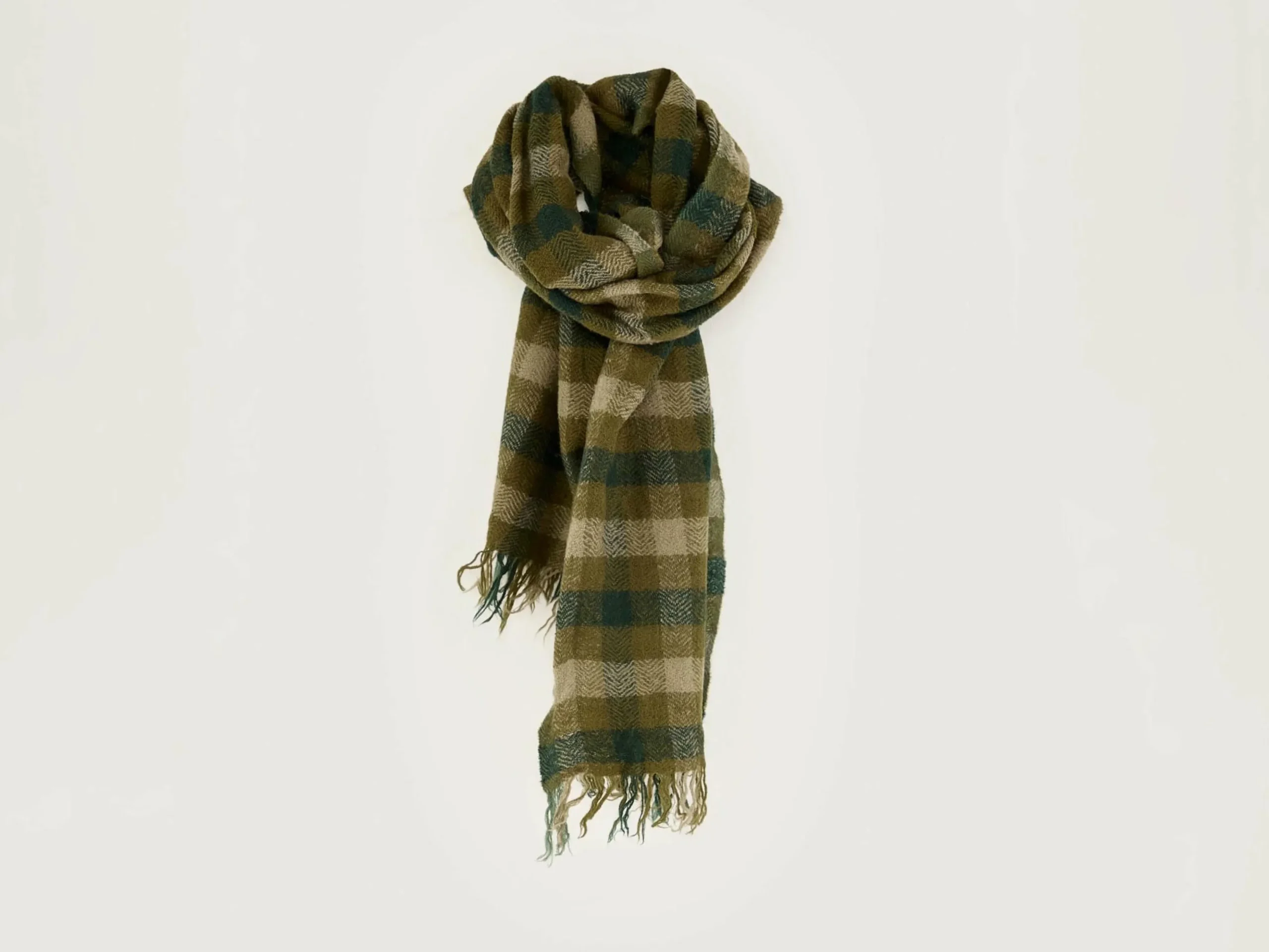 Écharpe à carreaux verts en laine tissée.