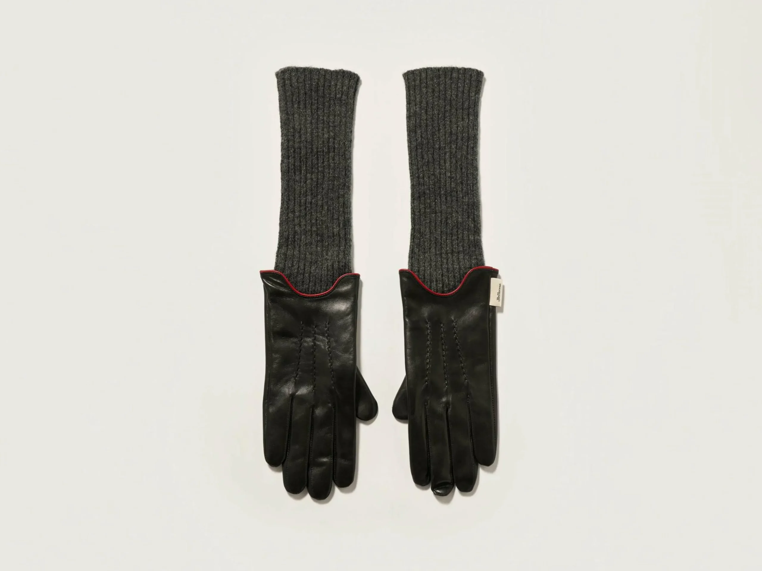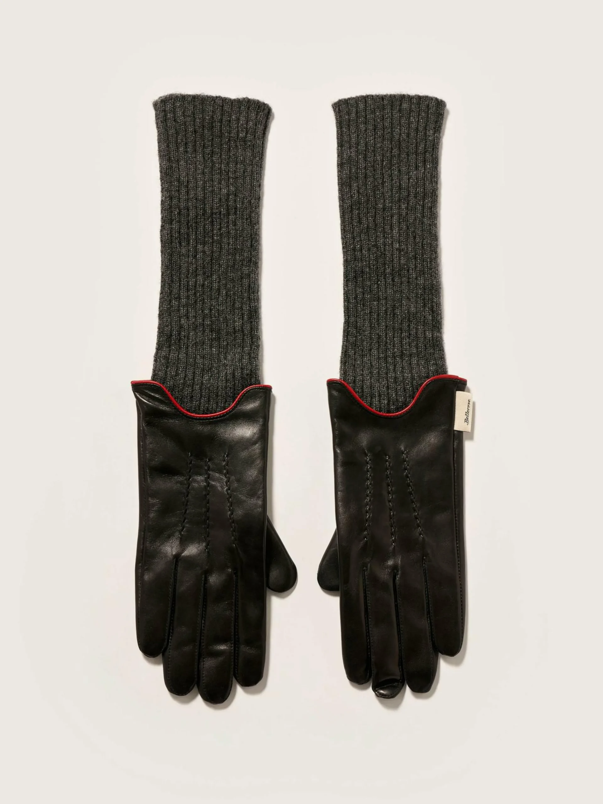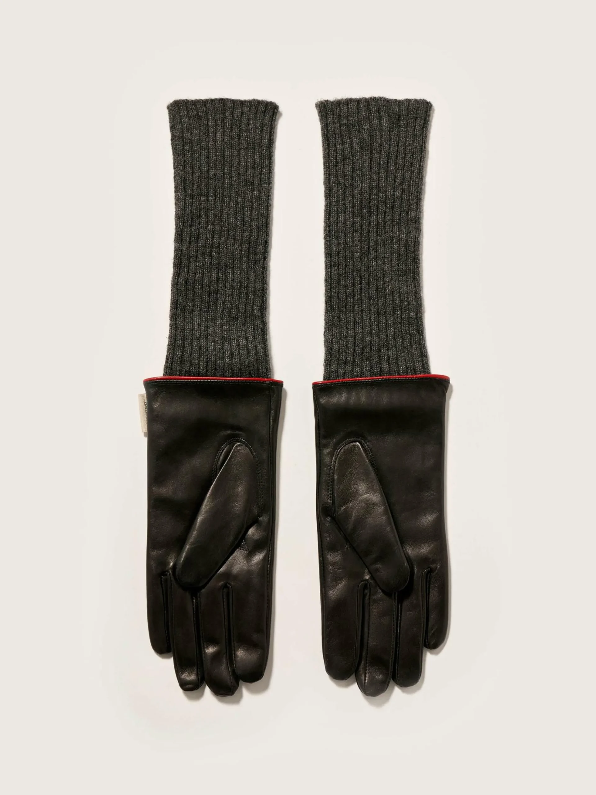 Gants en cuir noir avec poignets en maille côtelée grise.