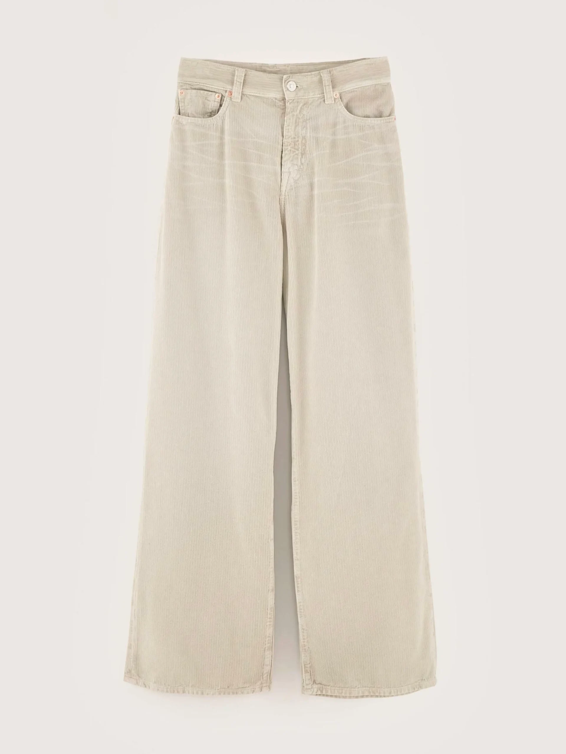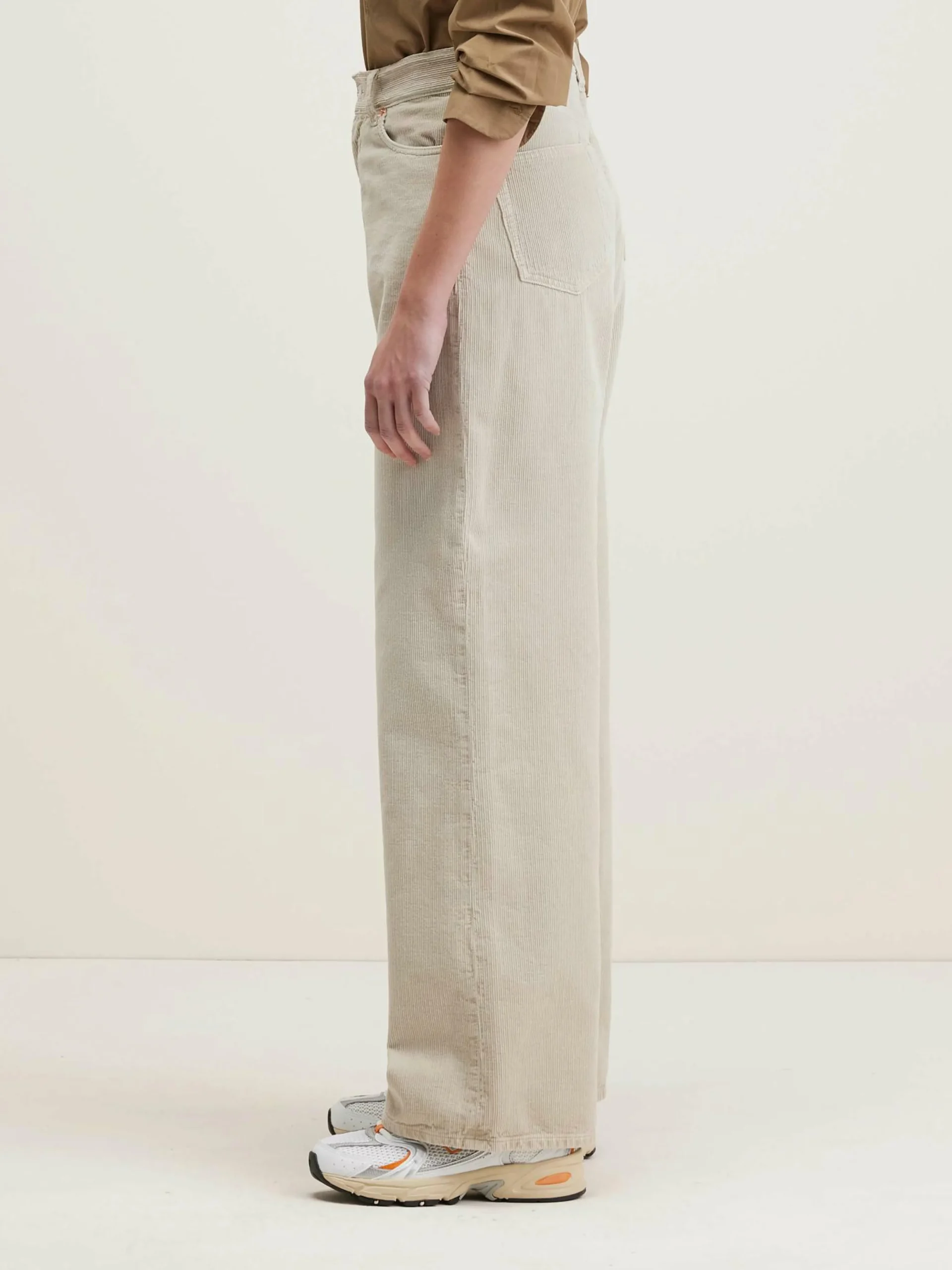 Jean boyfriend taille haute, jambes larges en velours de coton côtelé couleur crème.