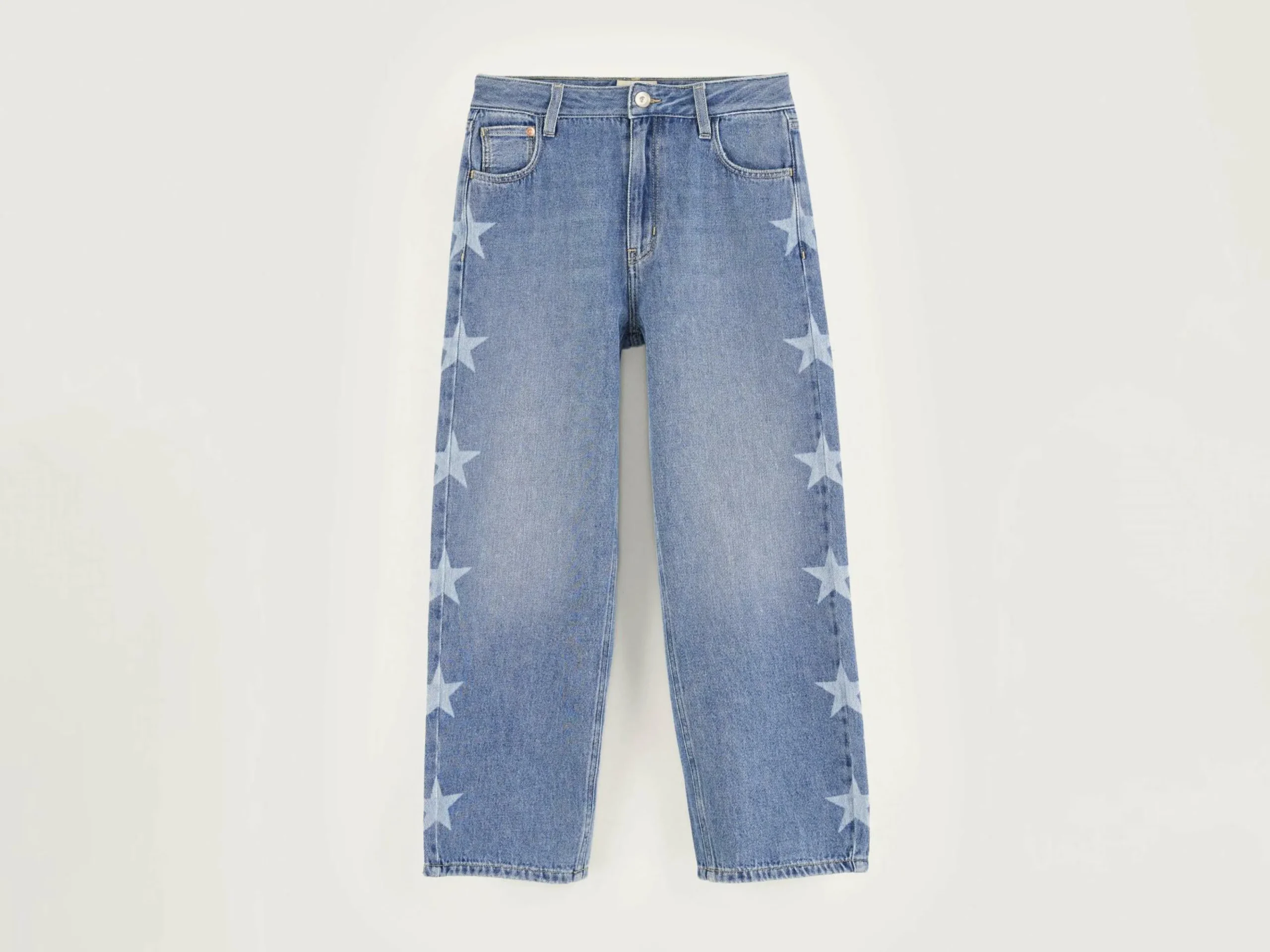 Jeans décontracté taille basse, lavage mid-blue imprimé au laser avec des étoiles sur les coutures côtés.