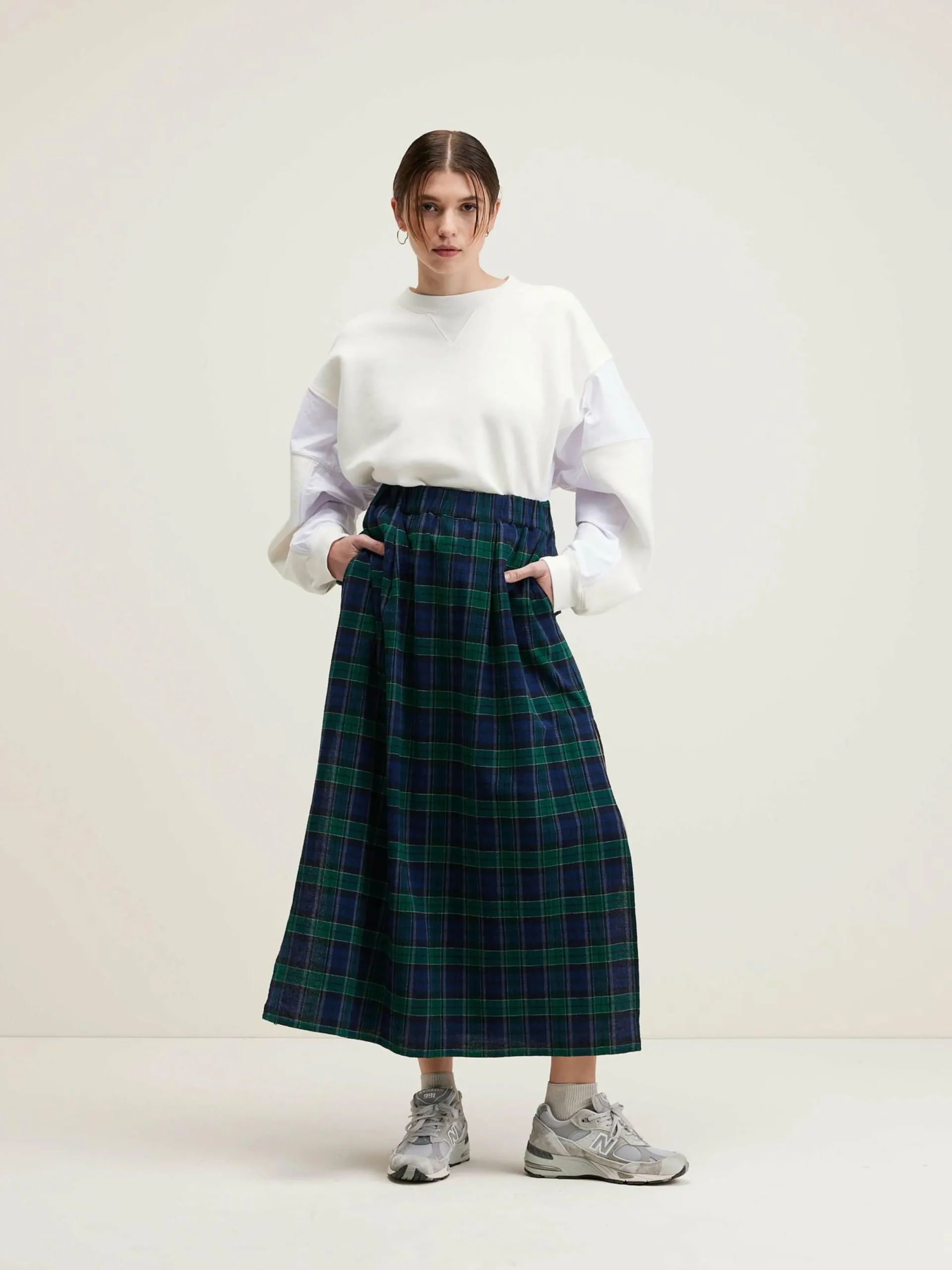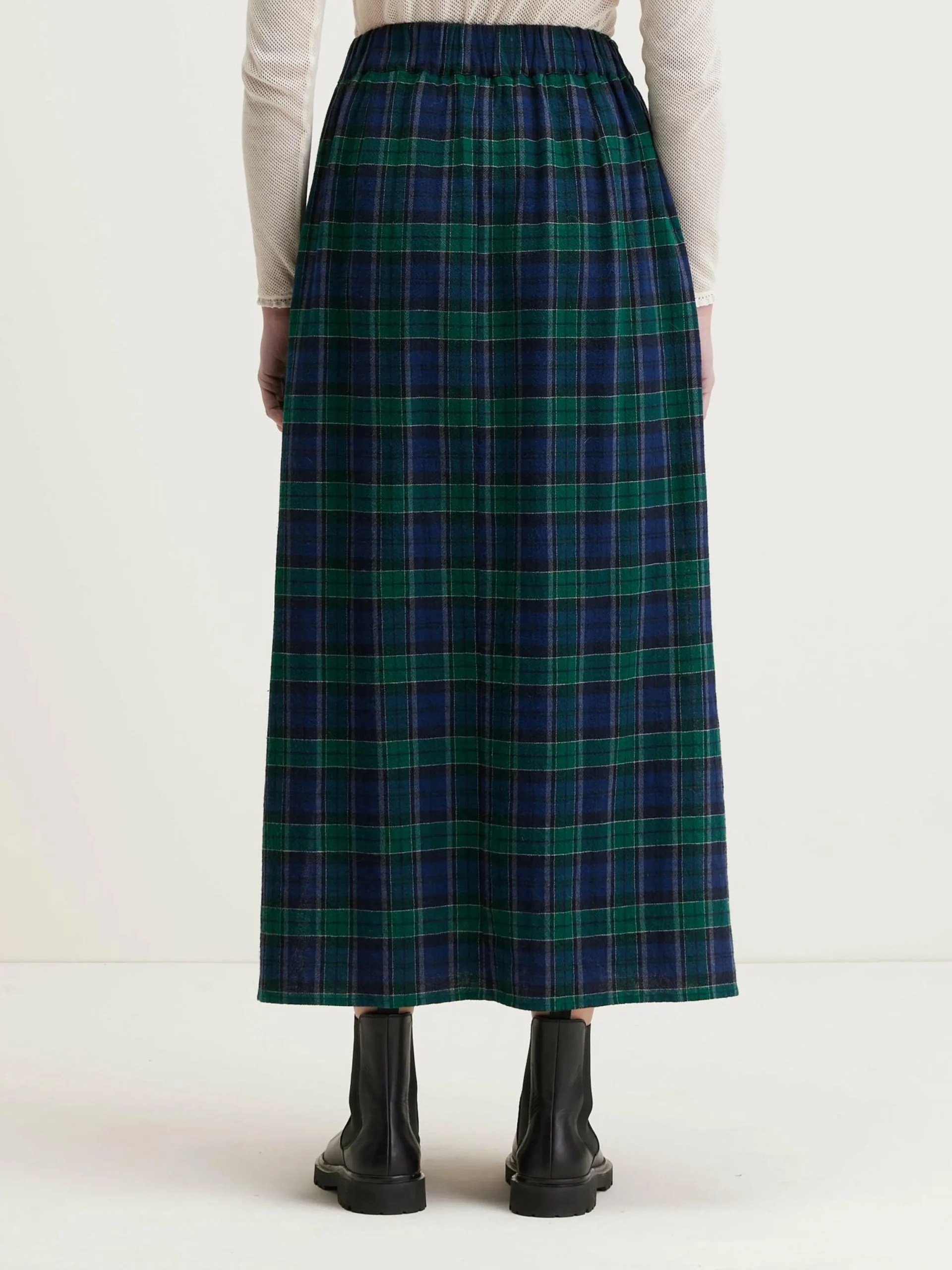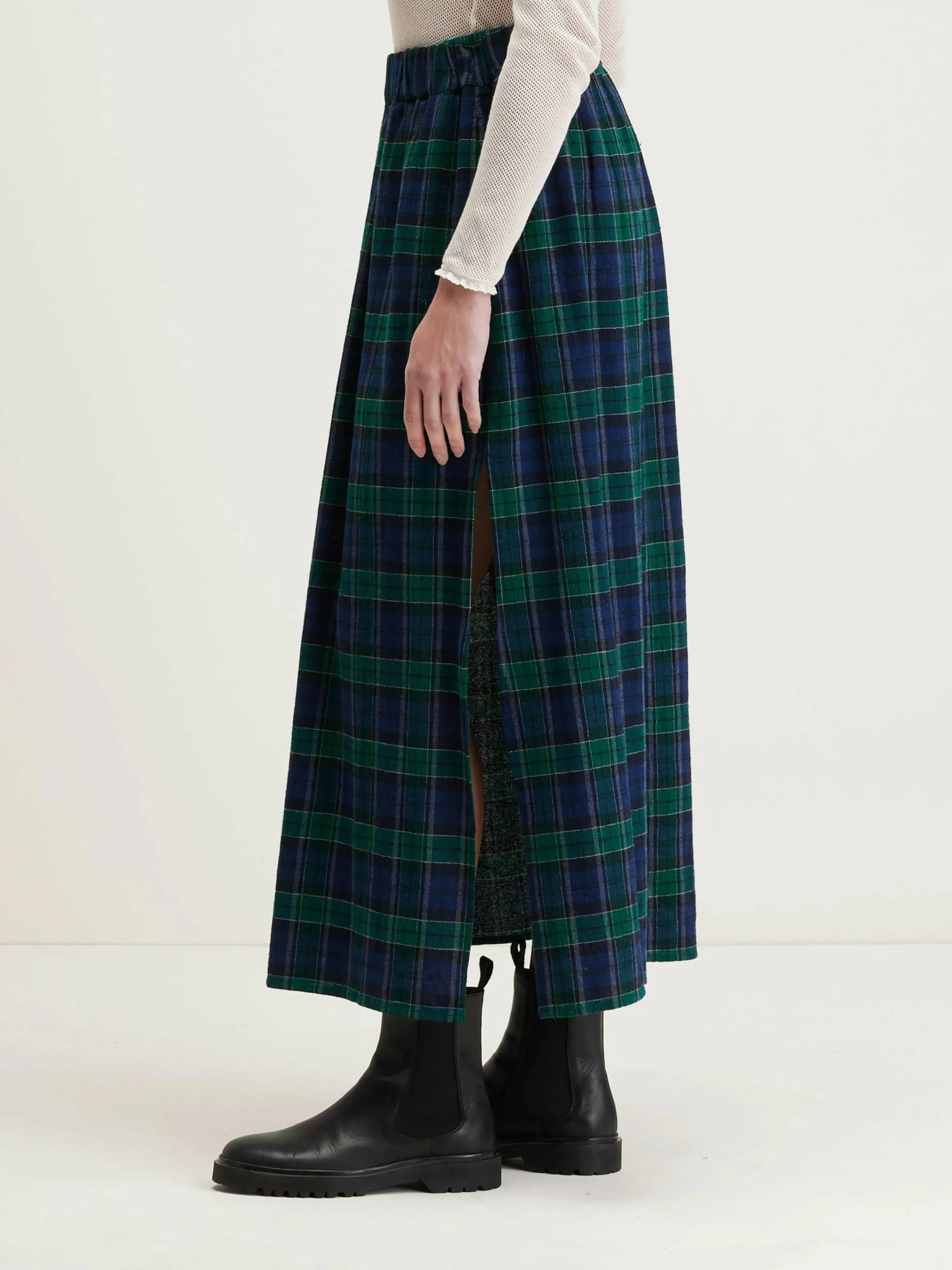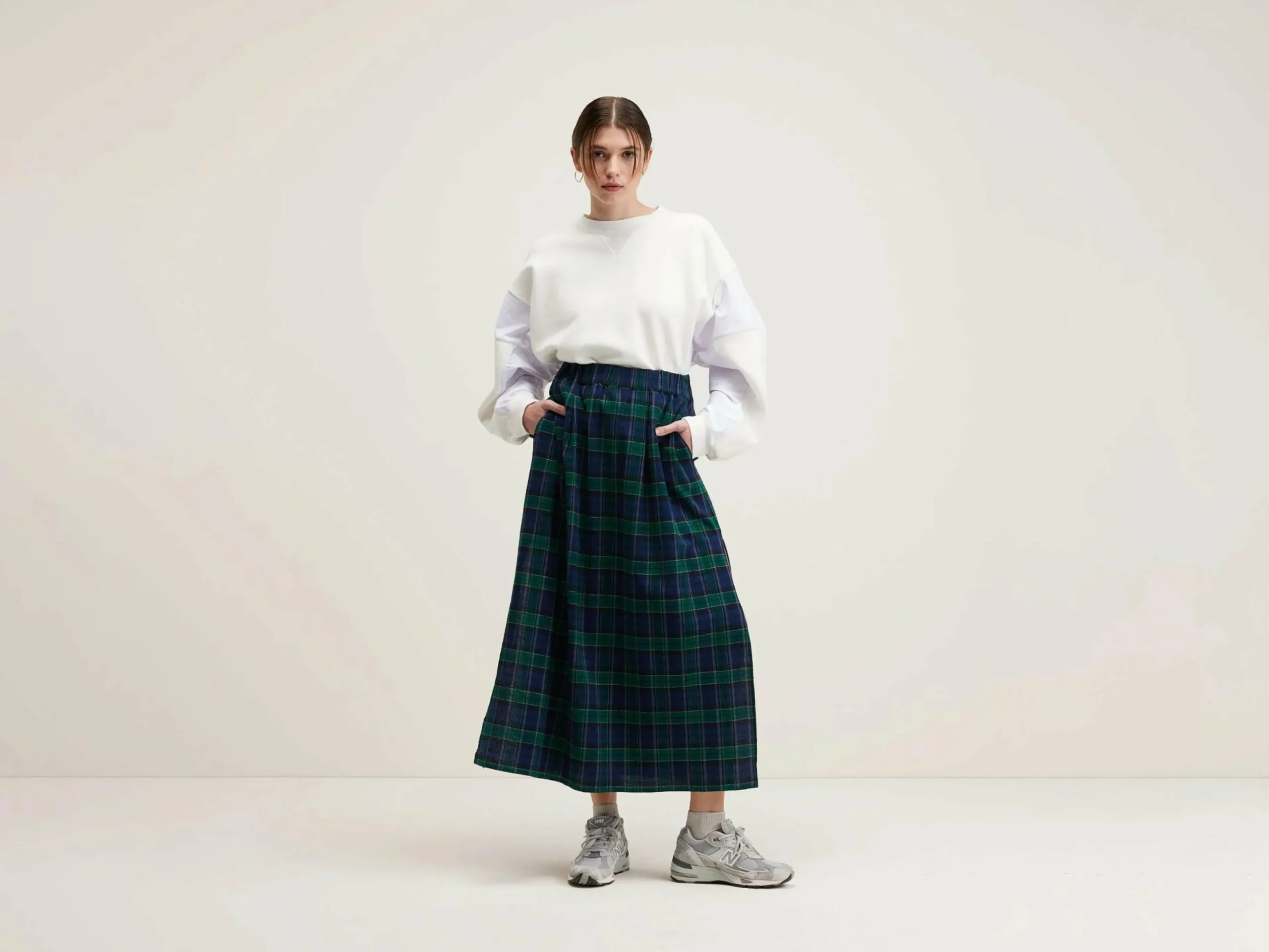 Jupe longue à carreaux bleus et verts en voile de coton avec taille élastique et grandes fentes latérales.