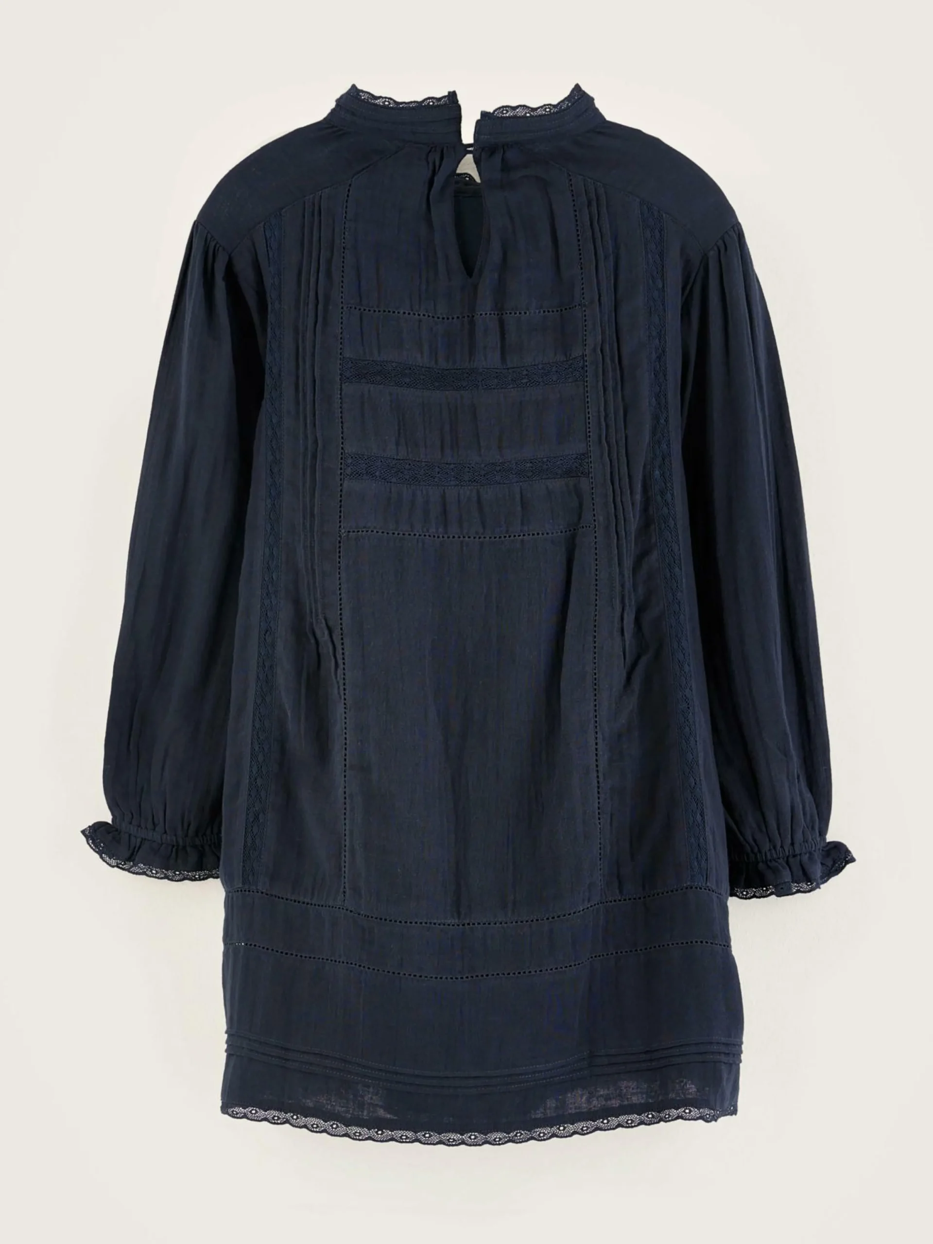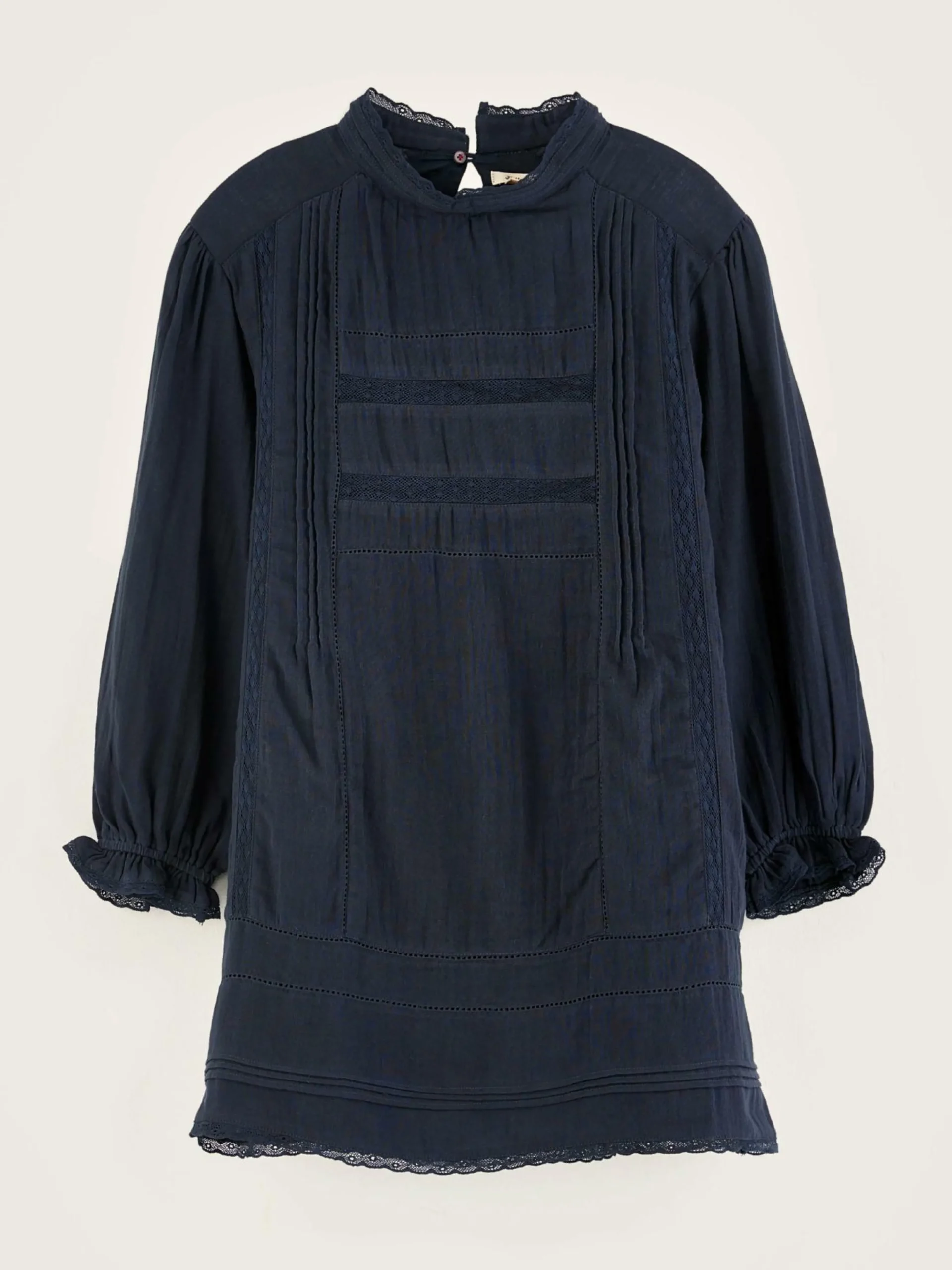 Mini robe romantique en coton tubique bleu foncé avec détails de dentelle incrustés.