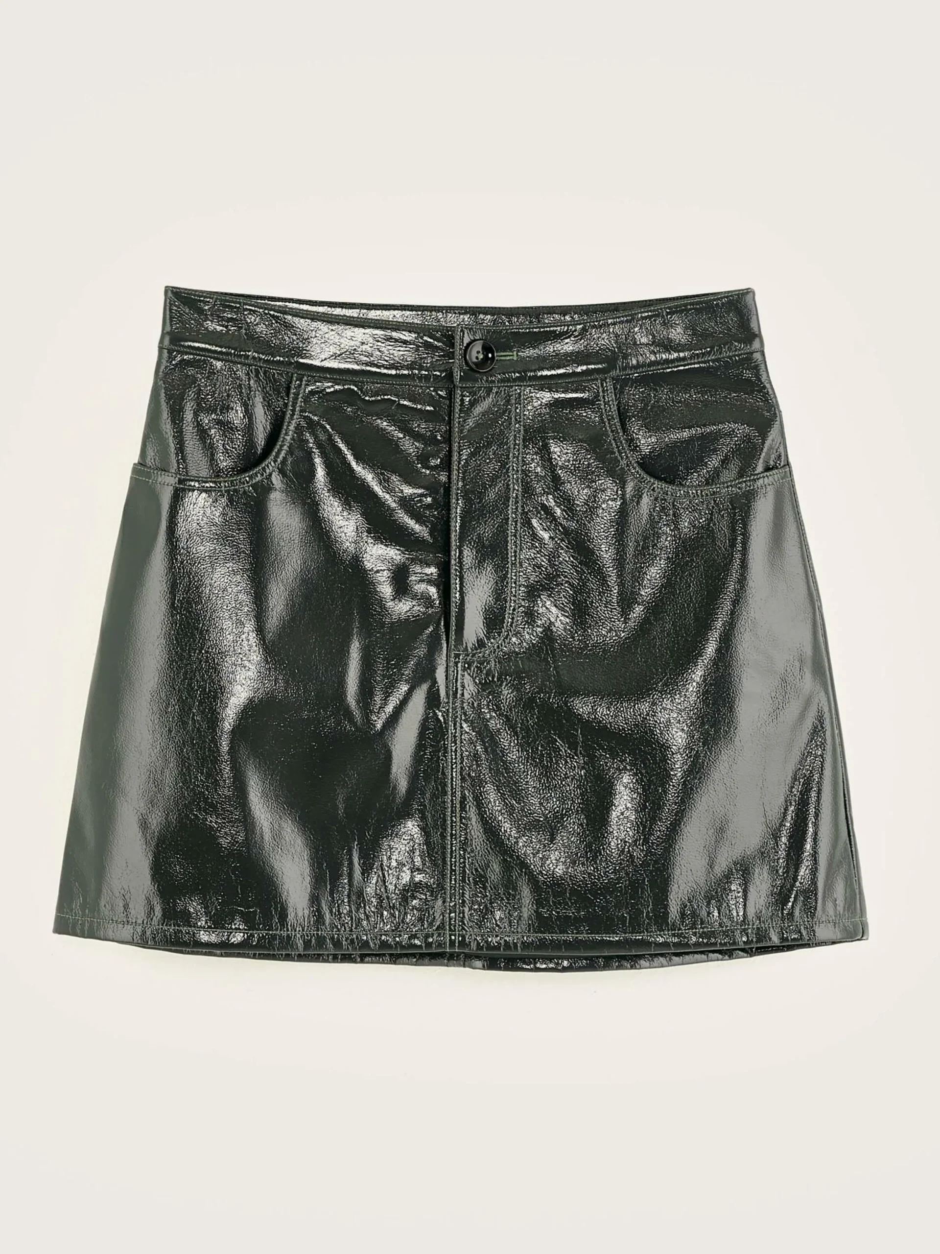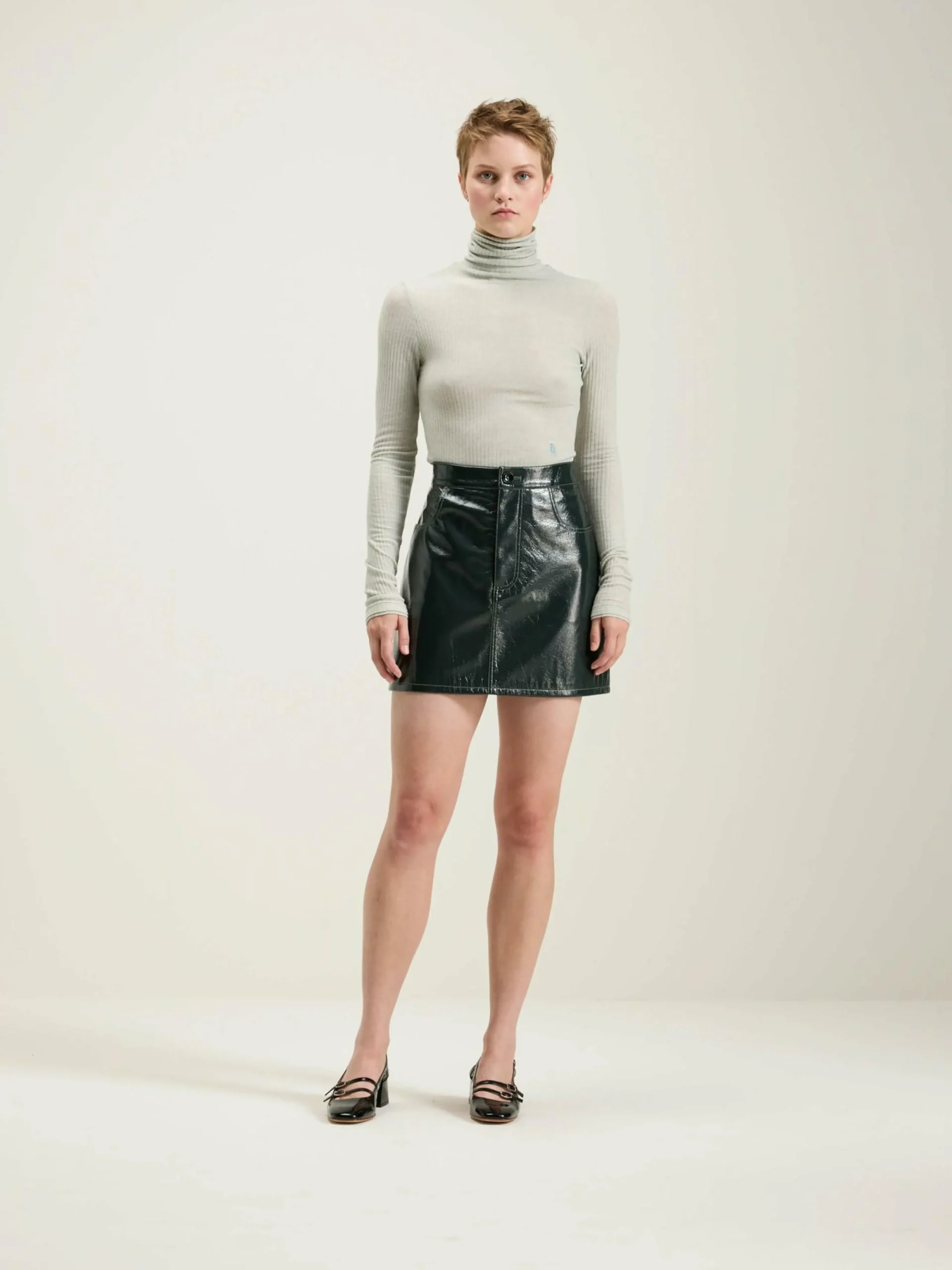 Minijupe en vinyl gris, forme trapèze et style 5 poches.