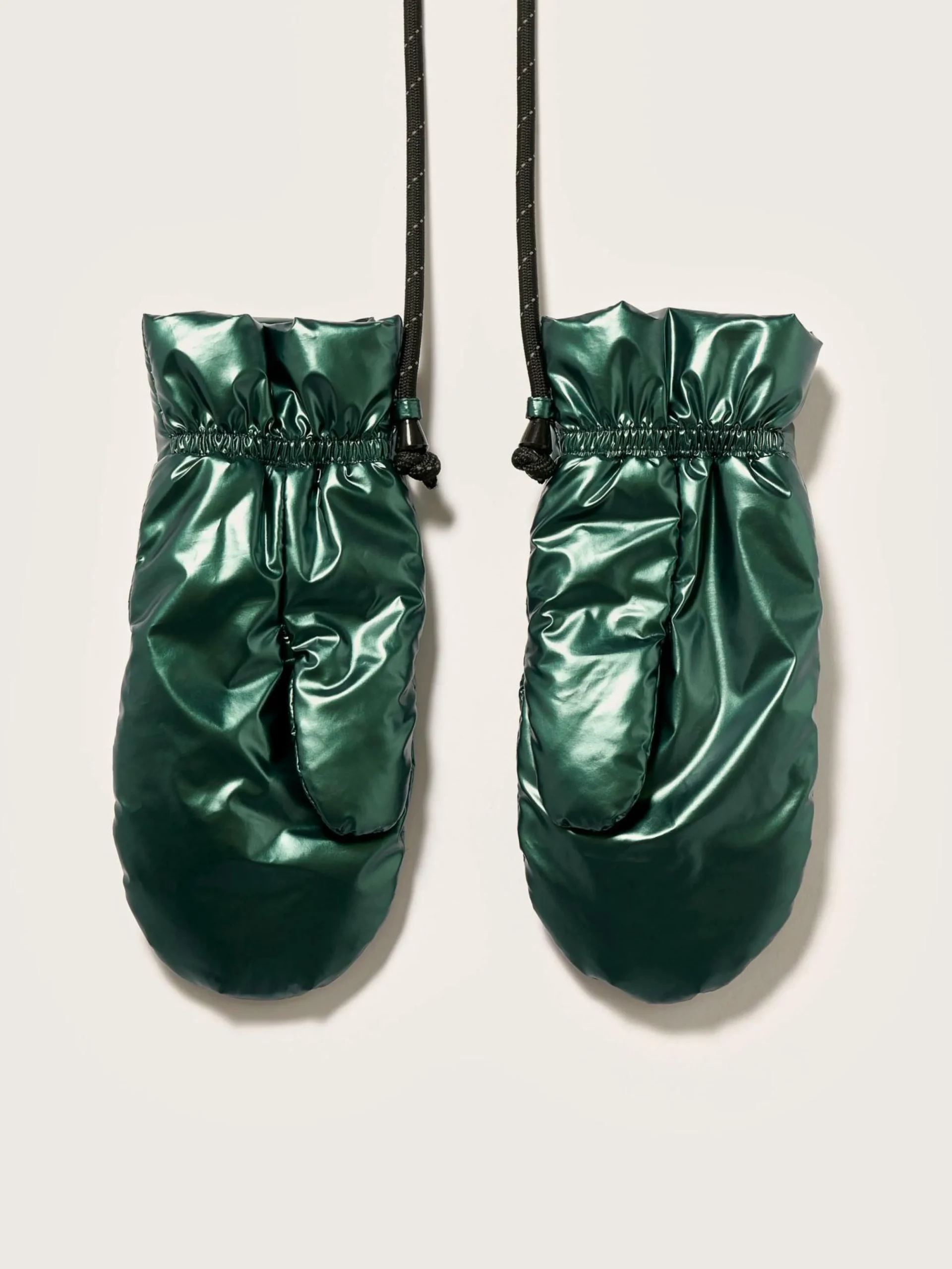 Moufles vert foncé avec cordon d’attache réfléchissant.
