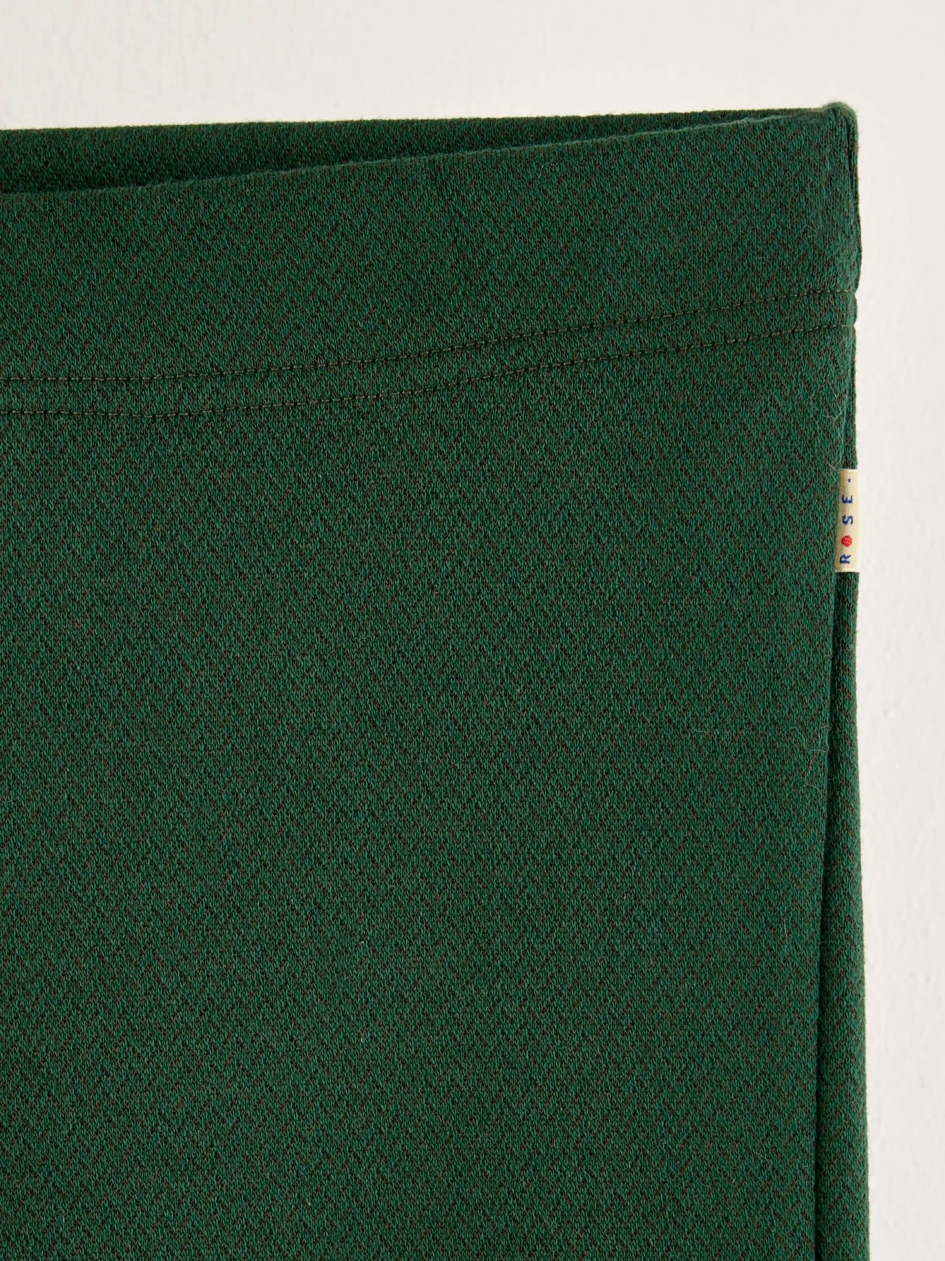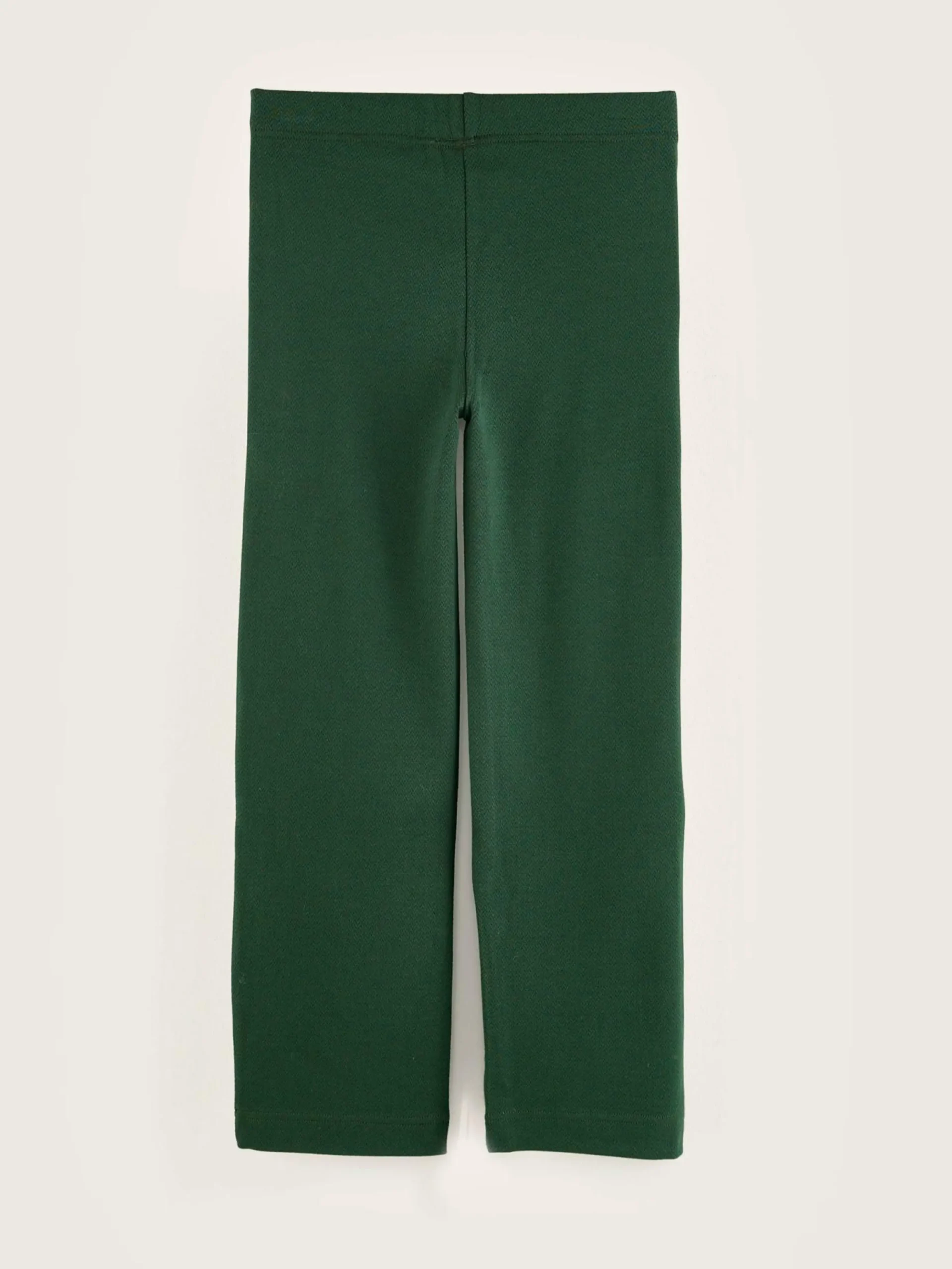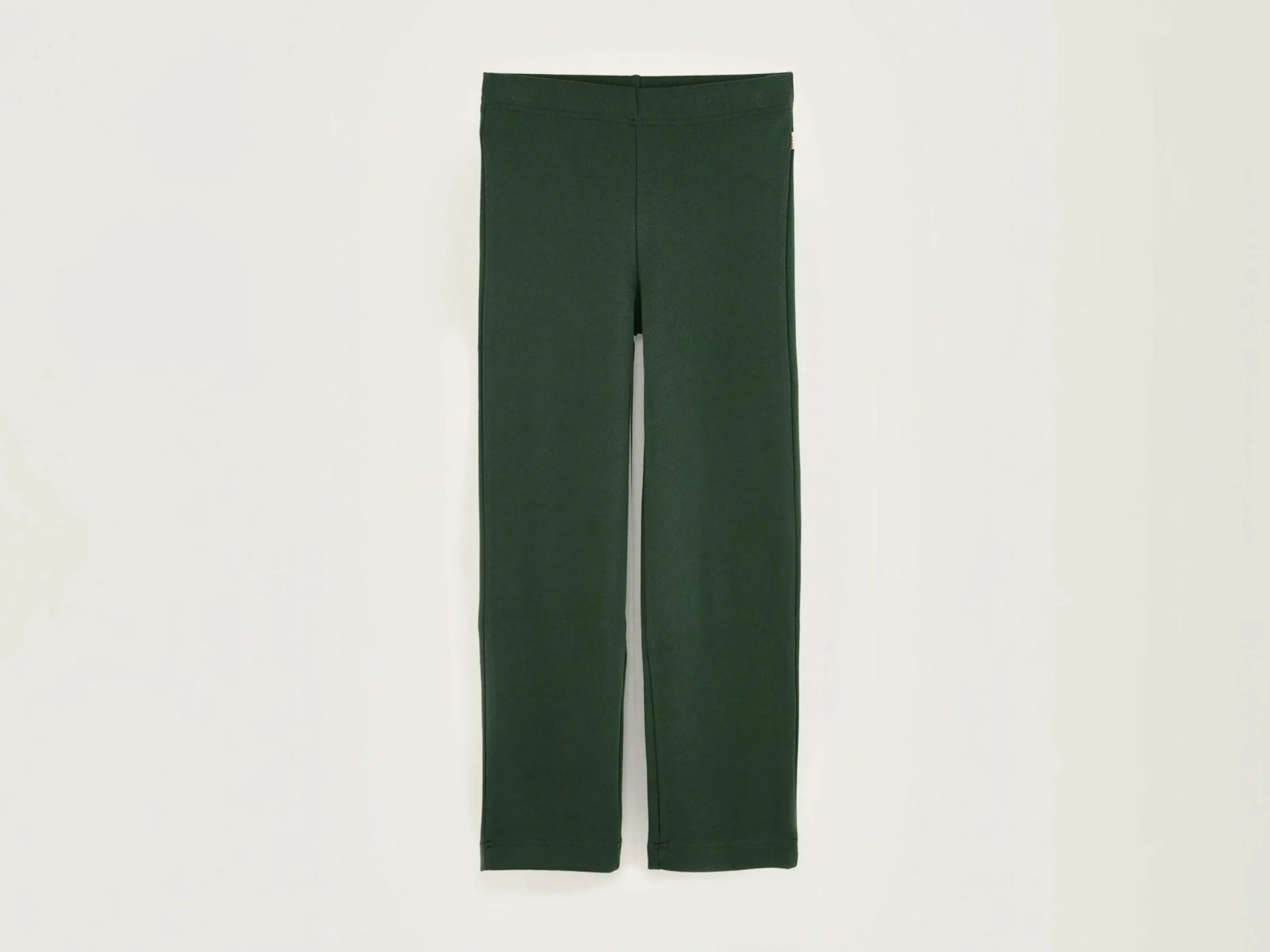 Pantalon vert bouteille à taille élastique et jambes évasées.