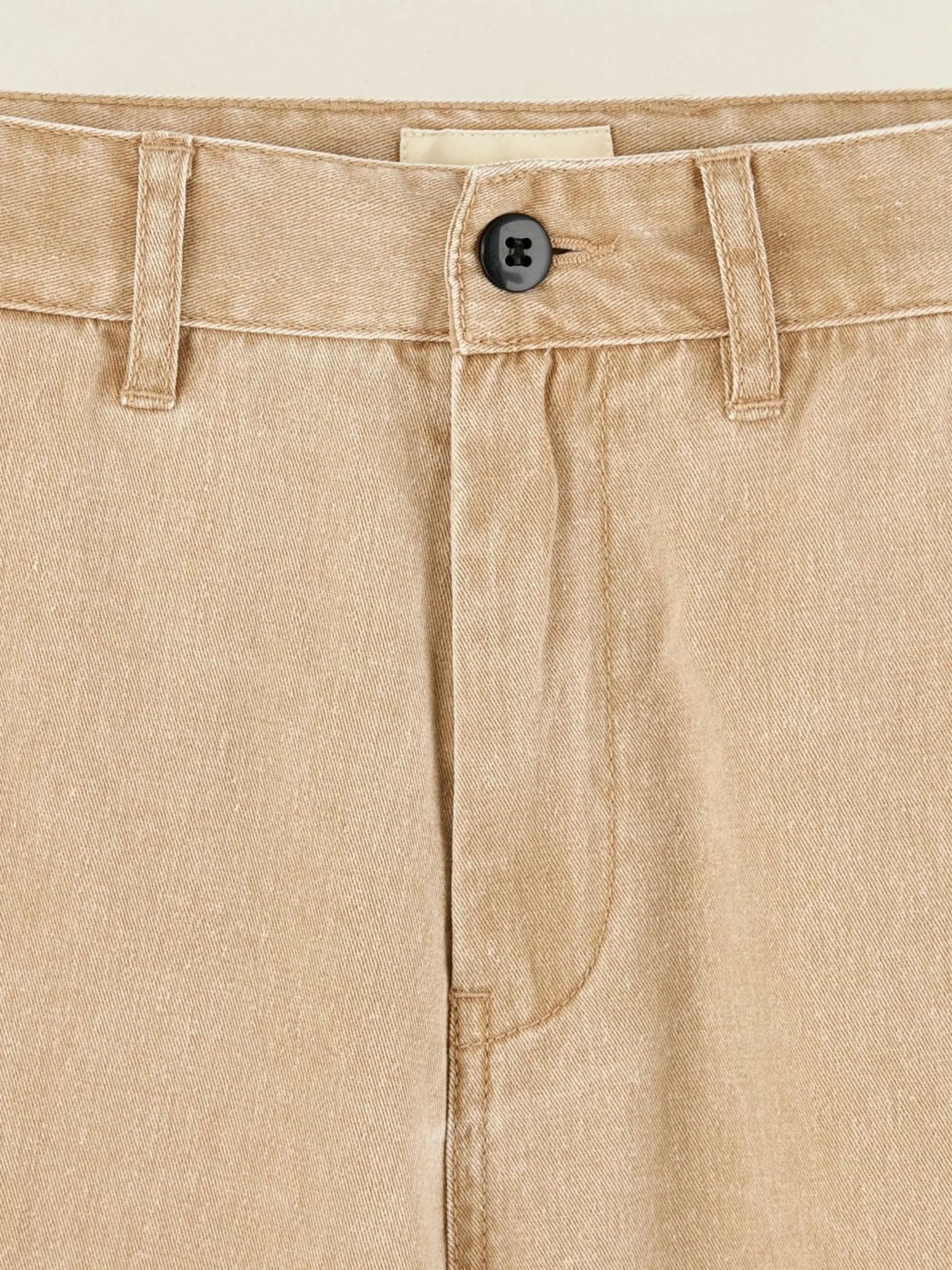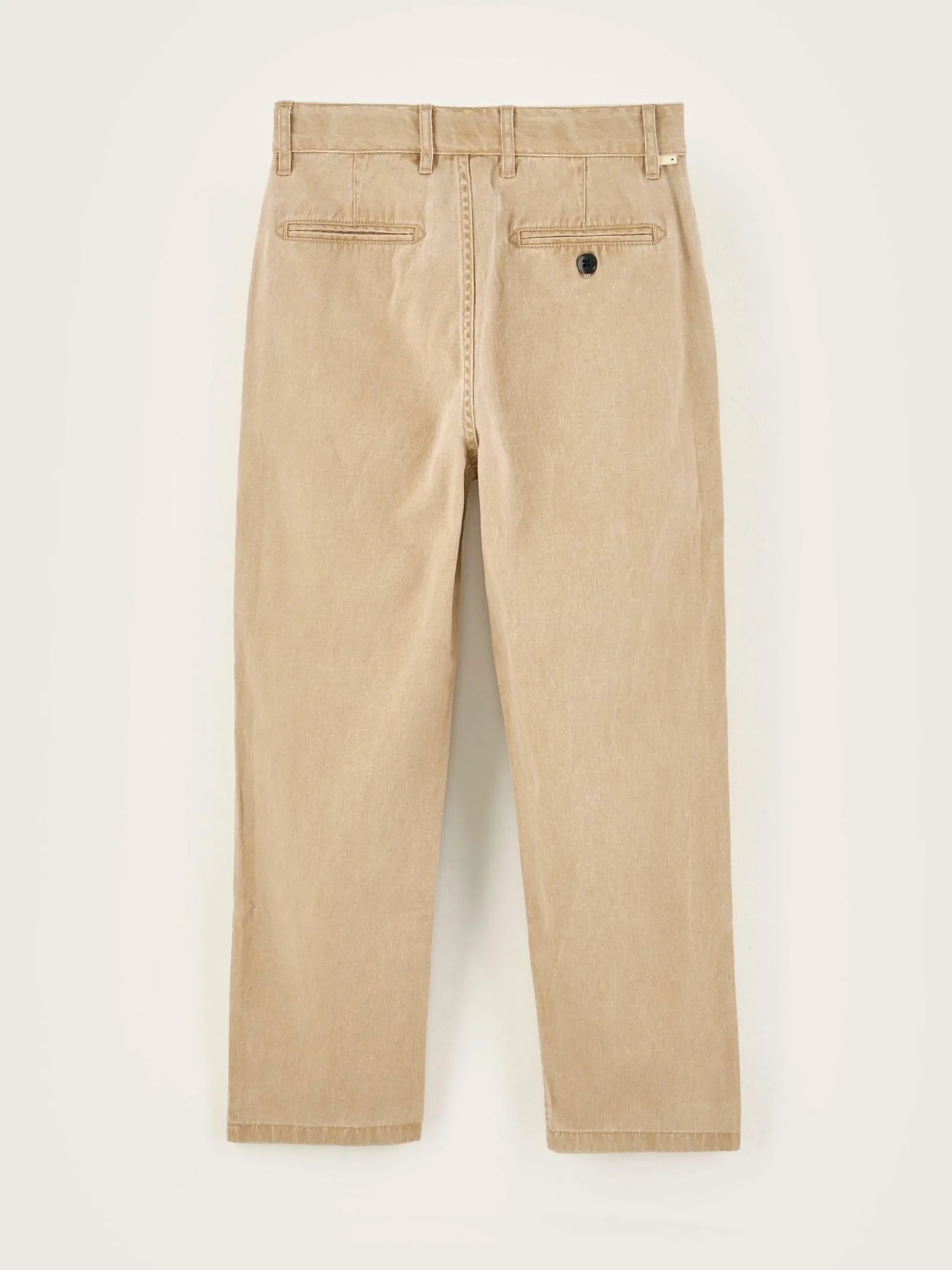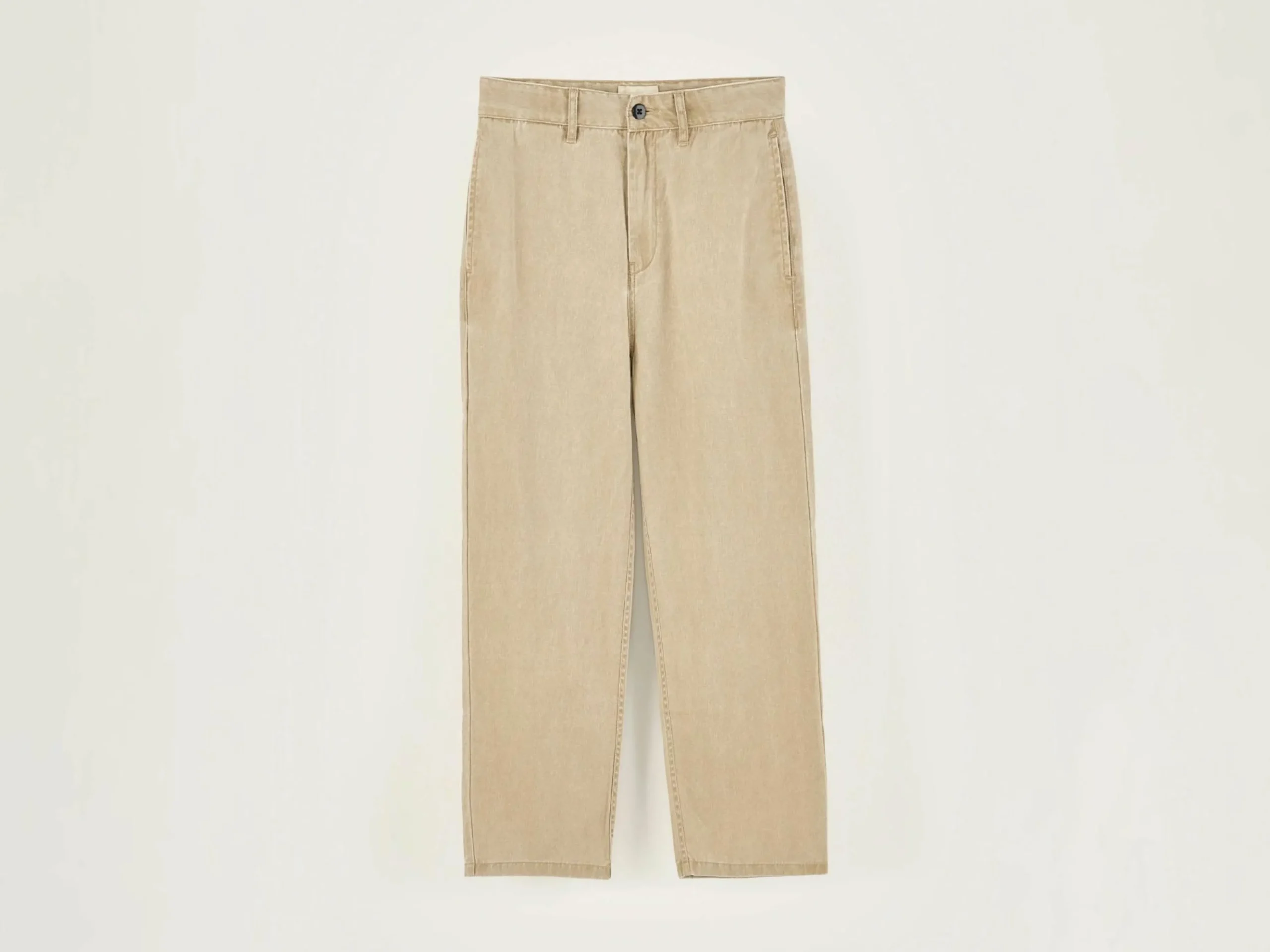 Pantalon classique à jambes larges en toile de coton couleur grège.