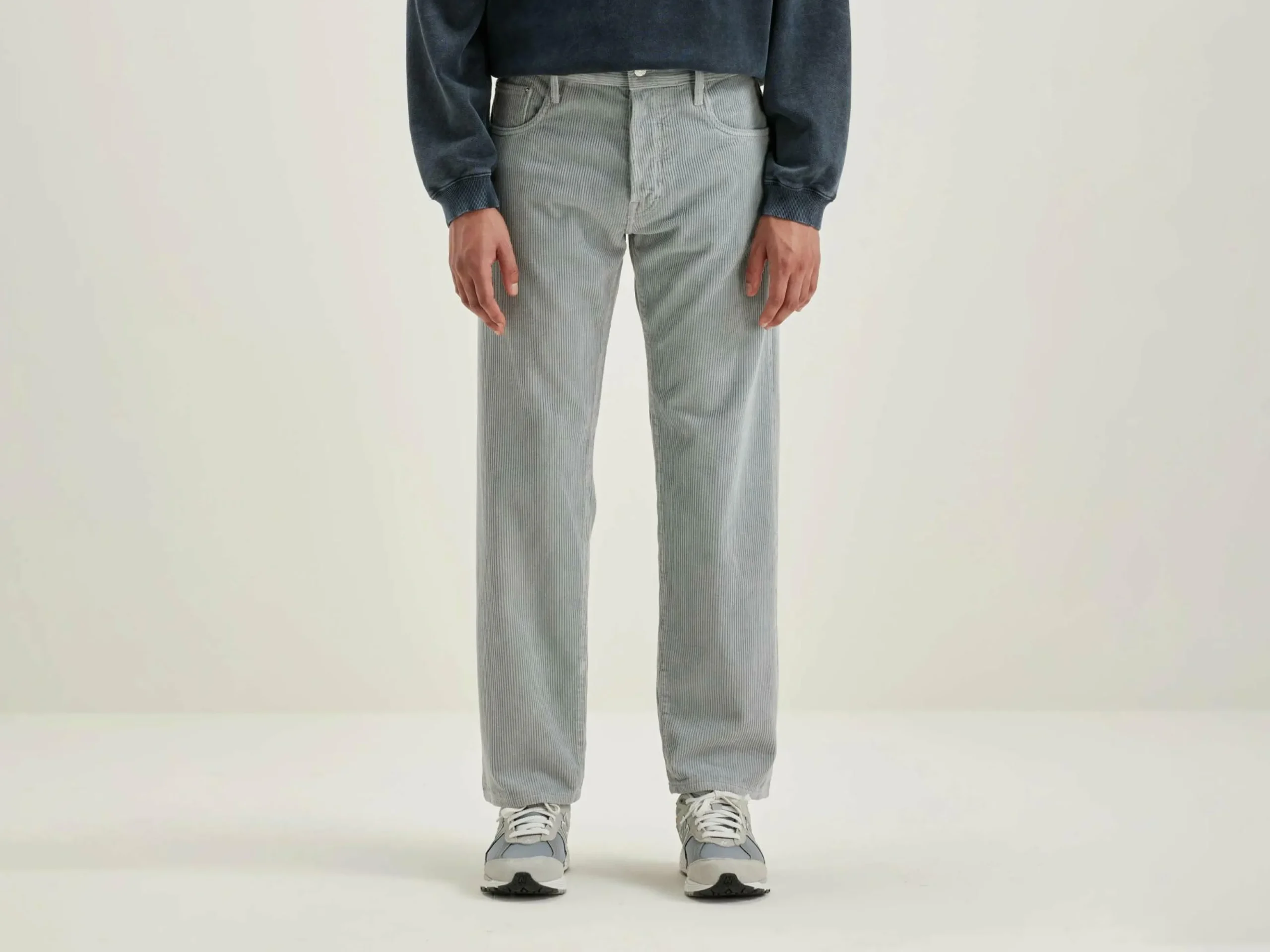 Pantalon 5 poches « dad style », taille basse et jambes droites, en velours de coton côtelé couleur bleu-gris.