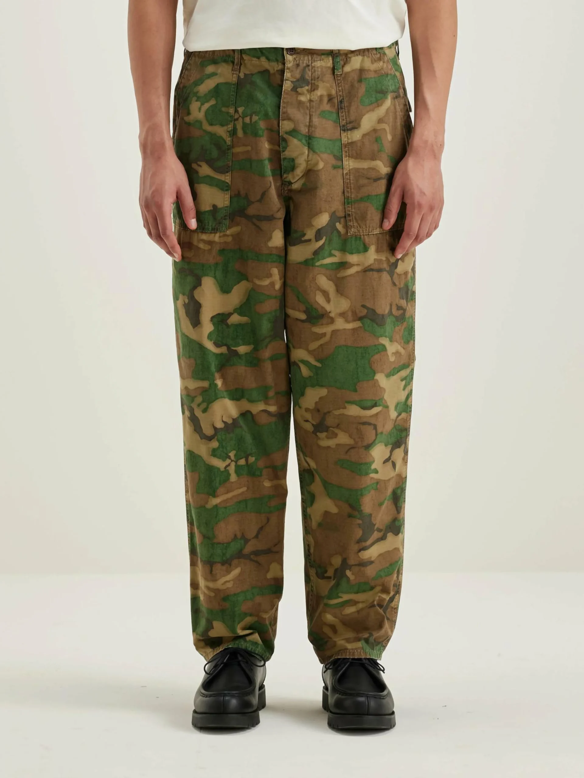 Pantalon fatigue, coupe décontractée et jambes fuselées, en coton japonais imprimé forêt.
