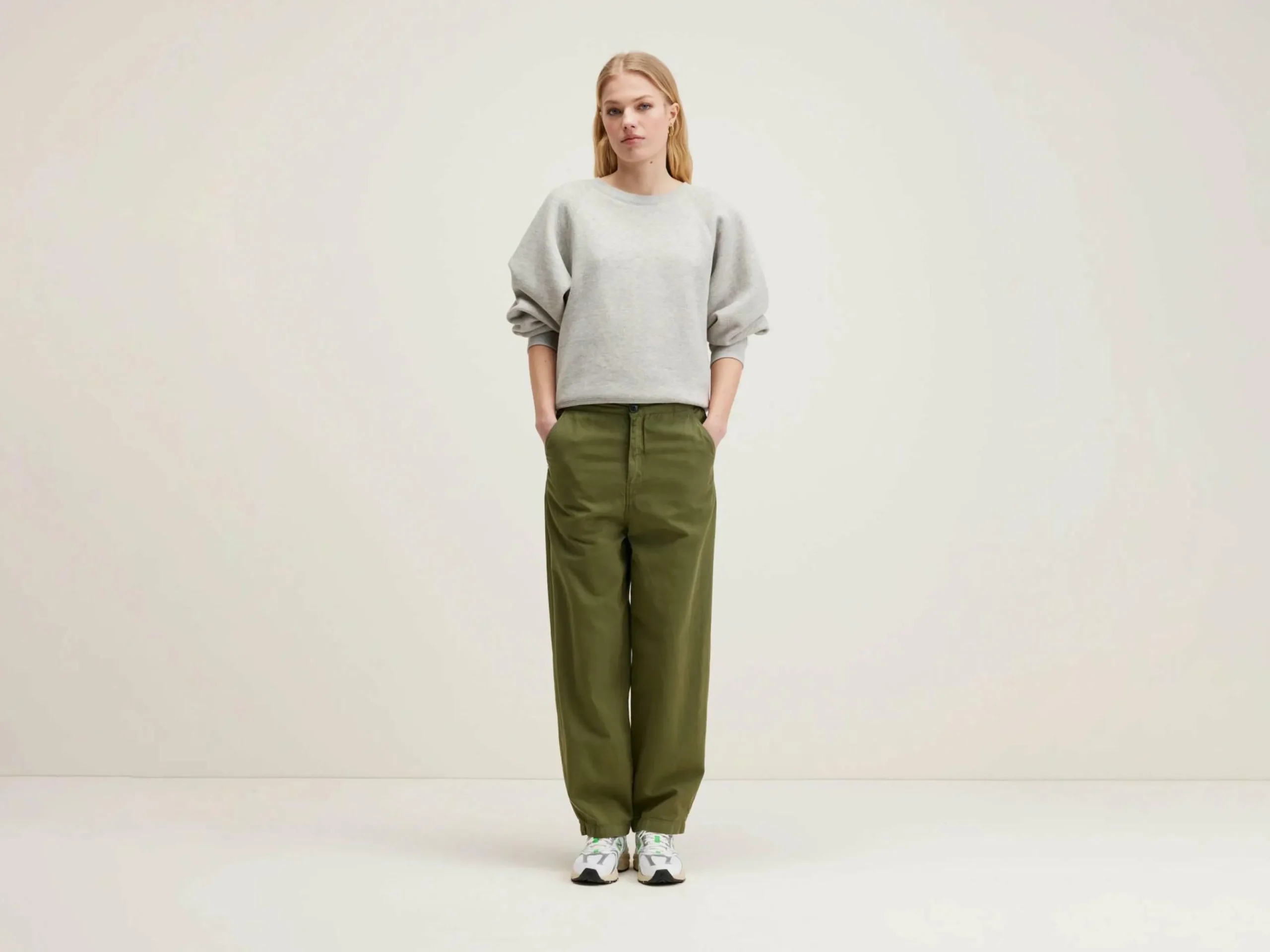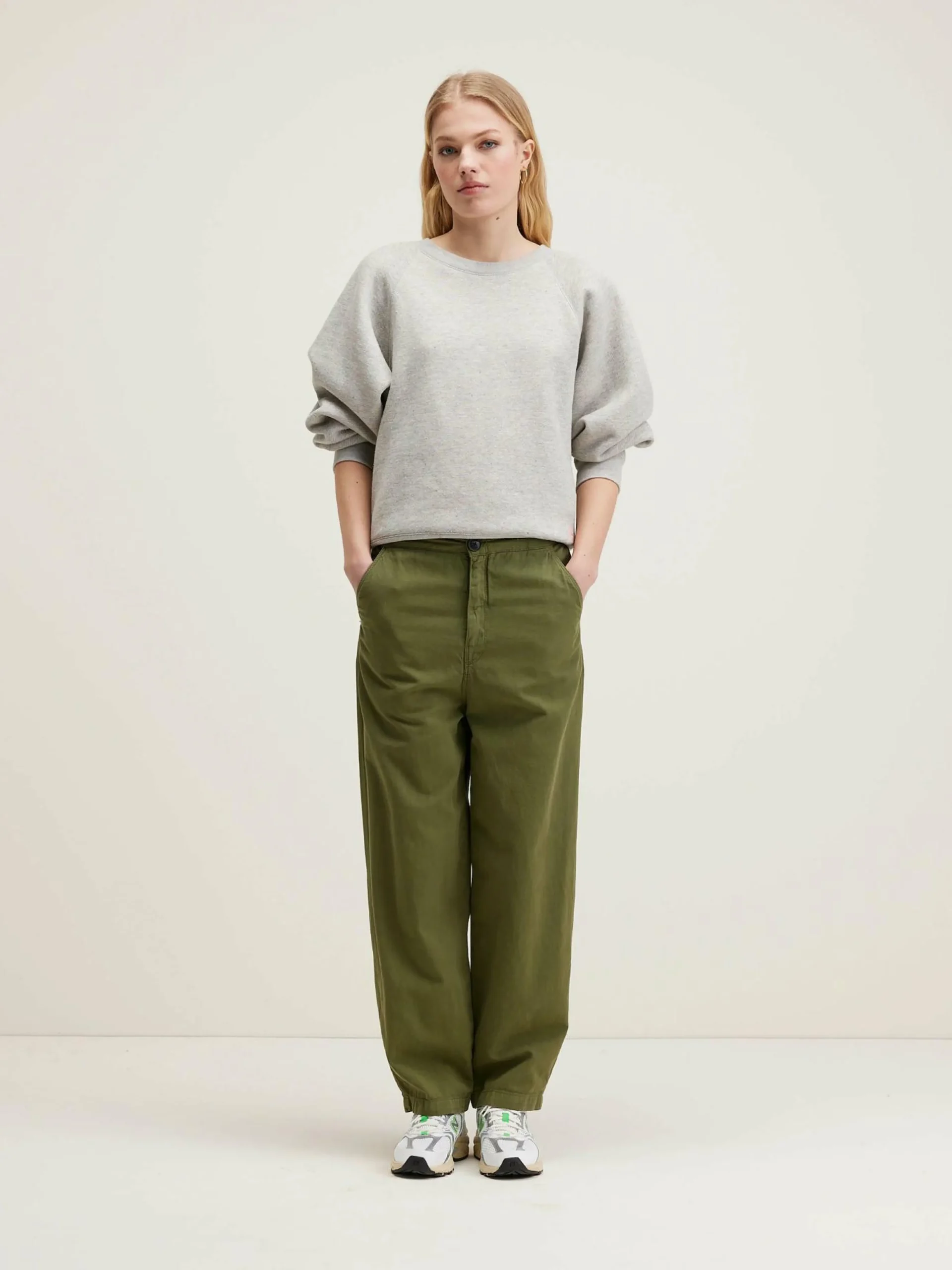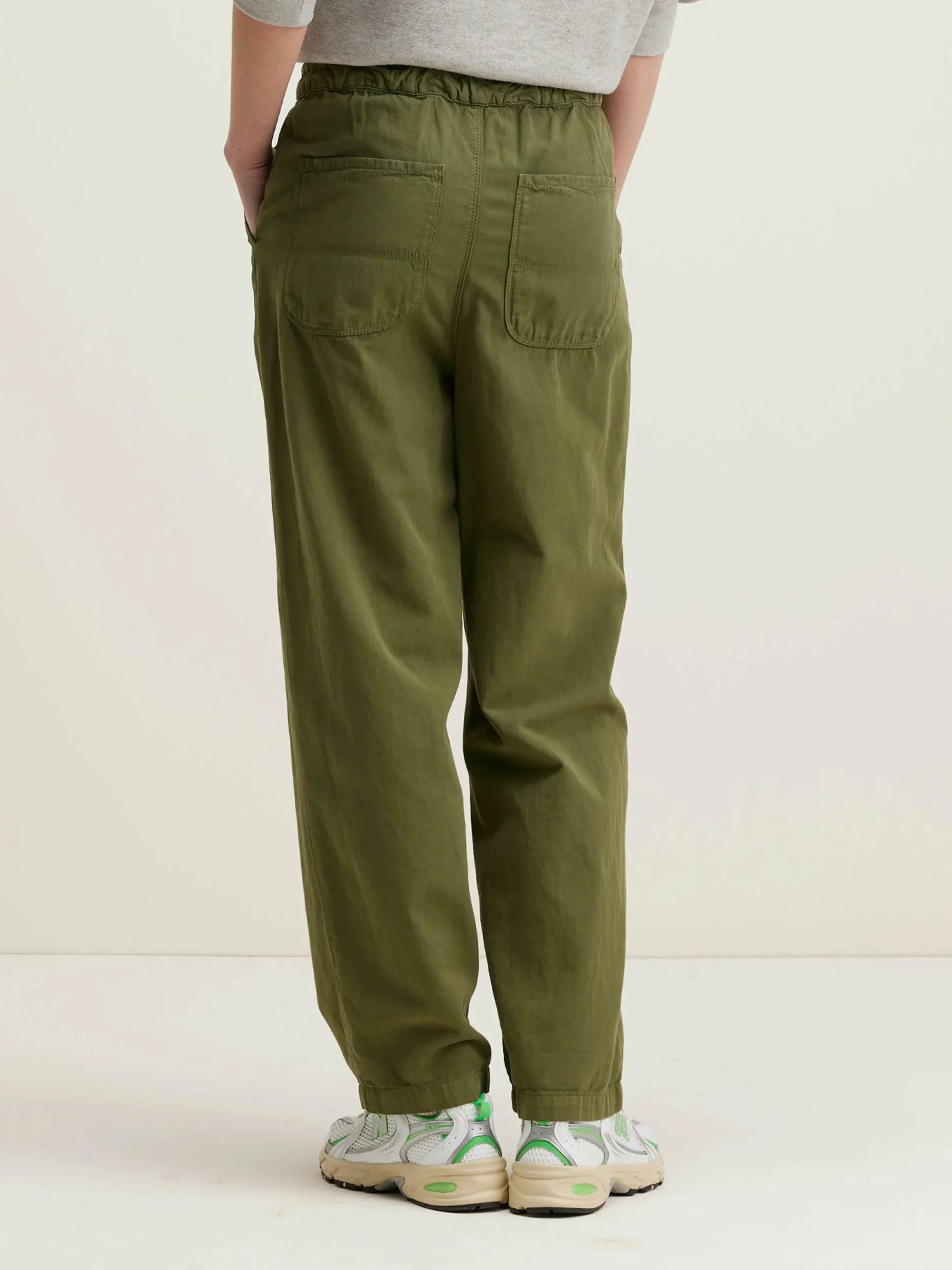 Pantalon décontracté avec taille élastique en coton et lin vert kaki.