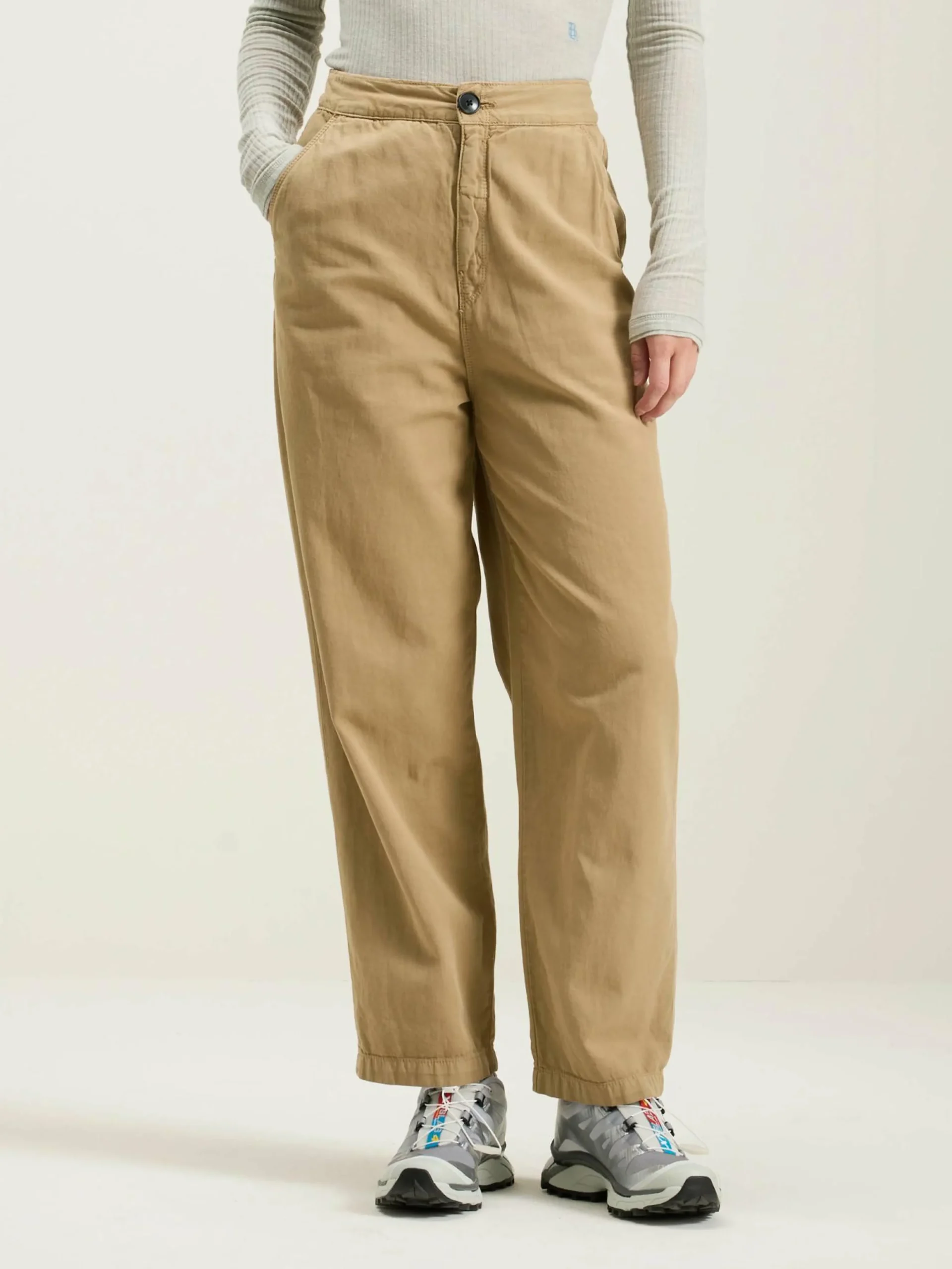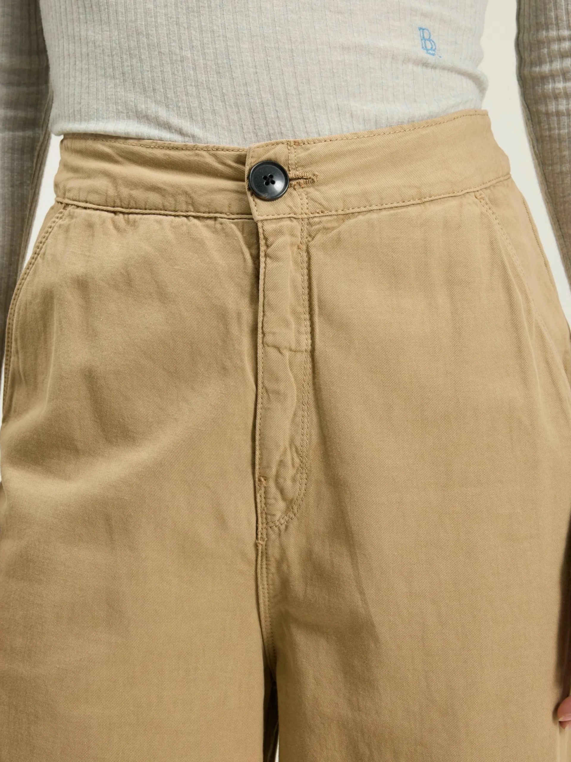 Pantalon décontracté avec taille élastique en coton et lin beige clair.
