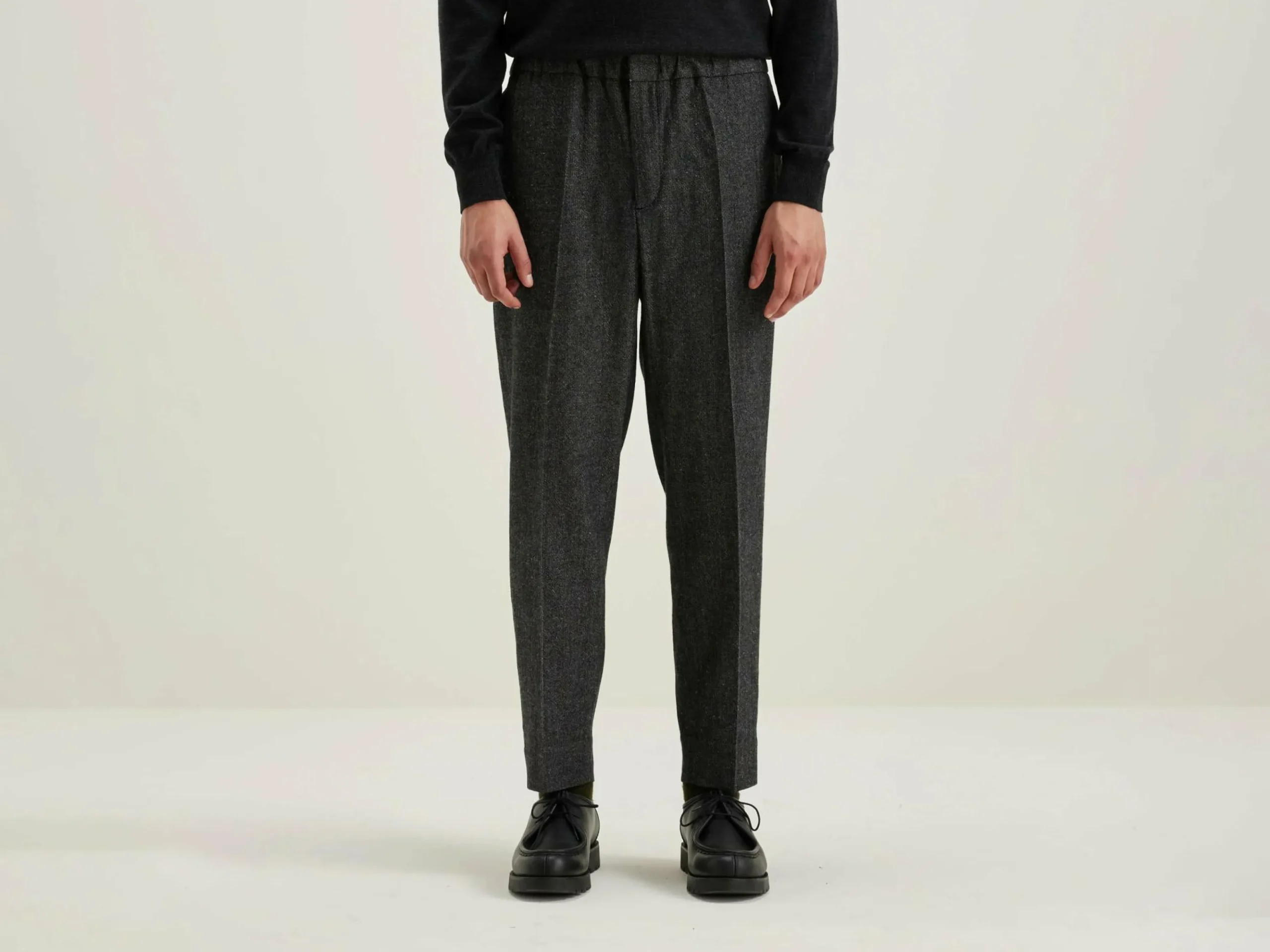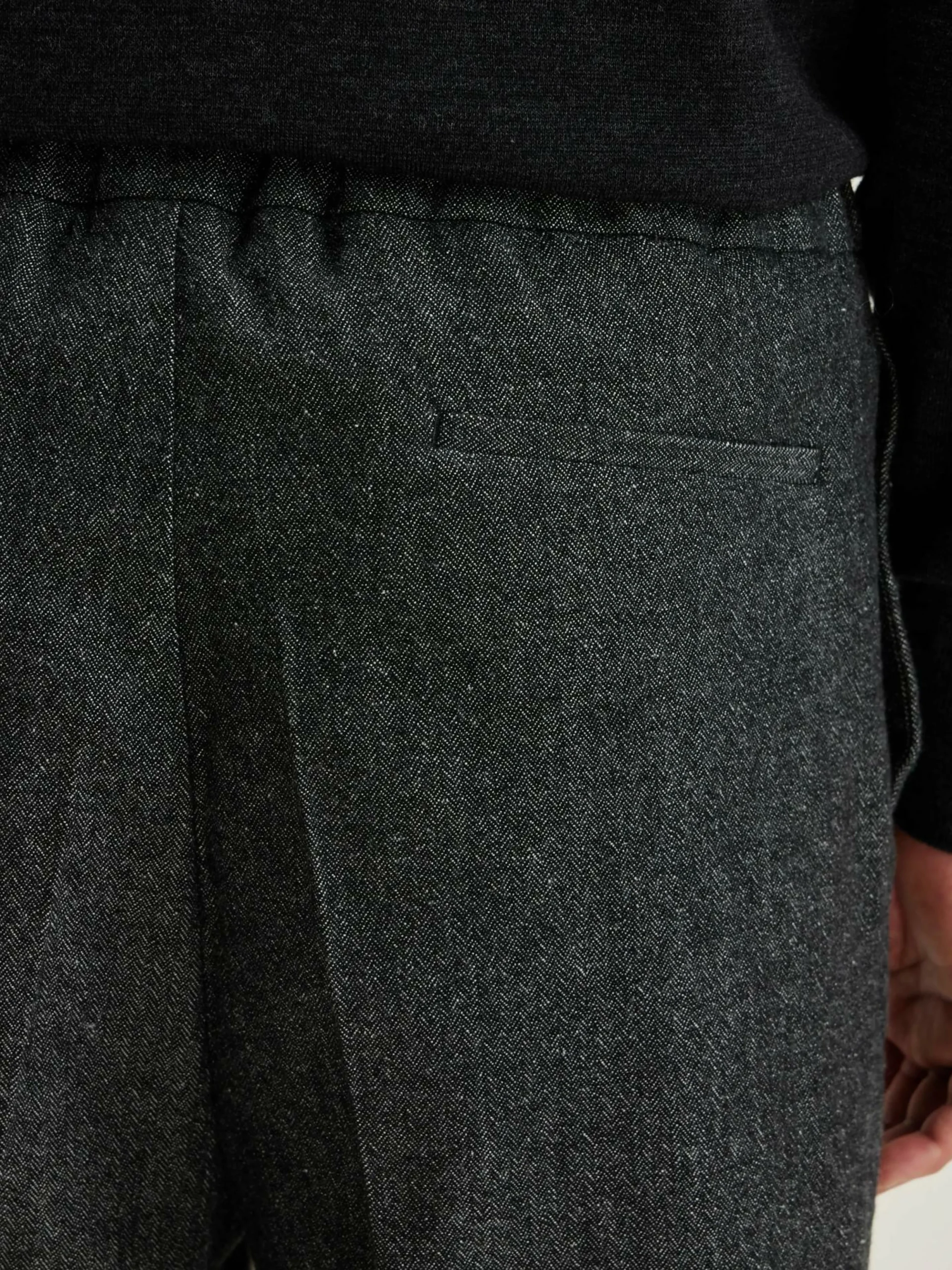 Pantalon décontracté, taille élastiquée et jambes larges et fuselées en tissu gris à motifs chevrons.