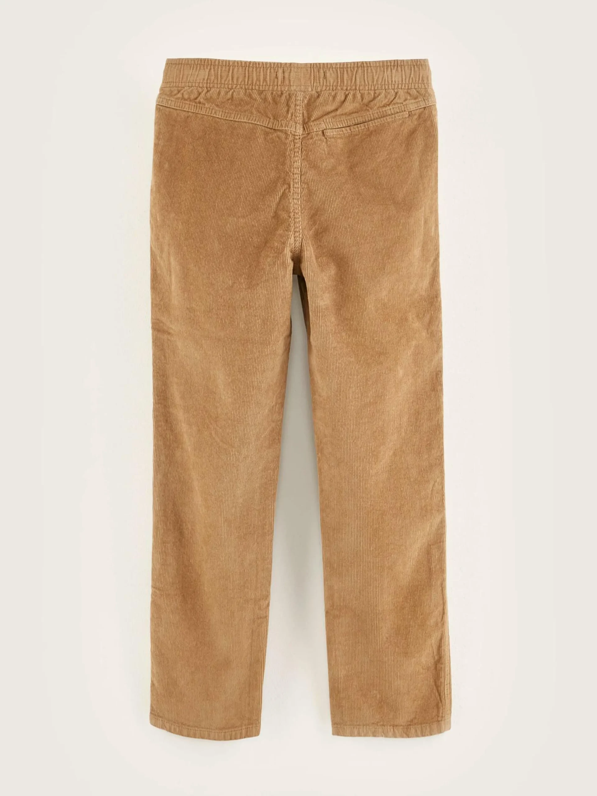 Pantalon décontracté en velours côtelé beige, jambes fuselées et cordon de serrage à la taille.