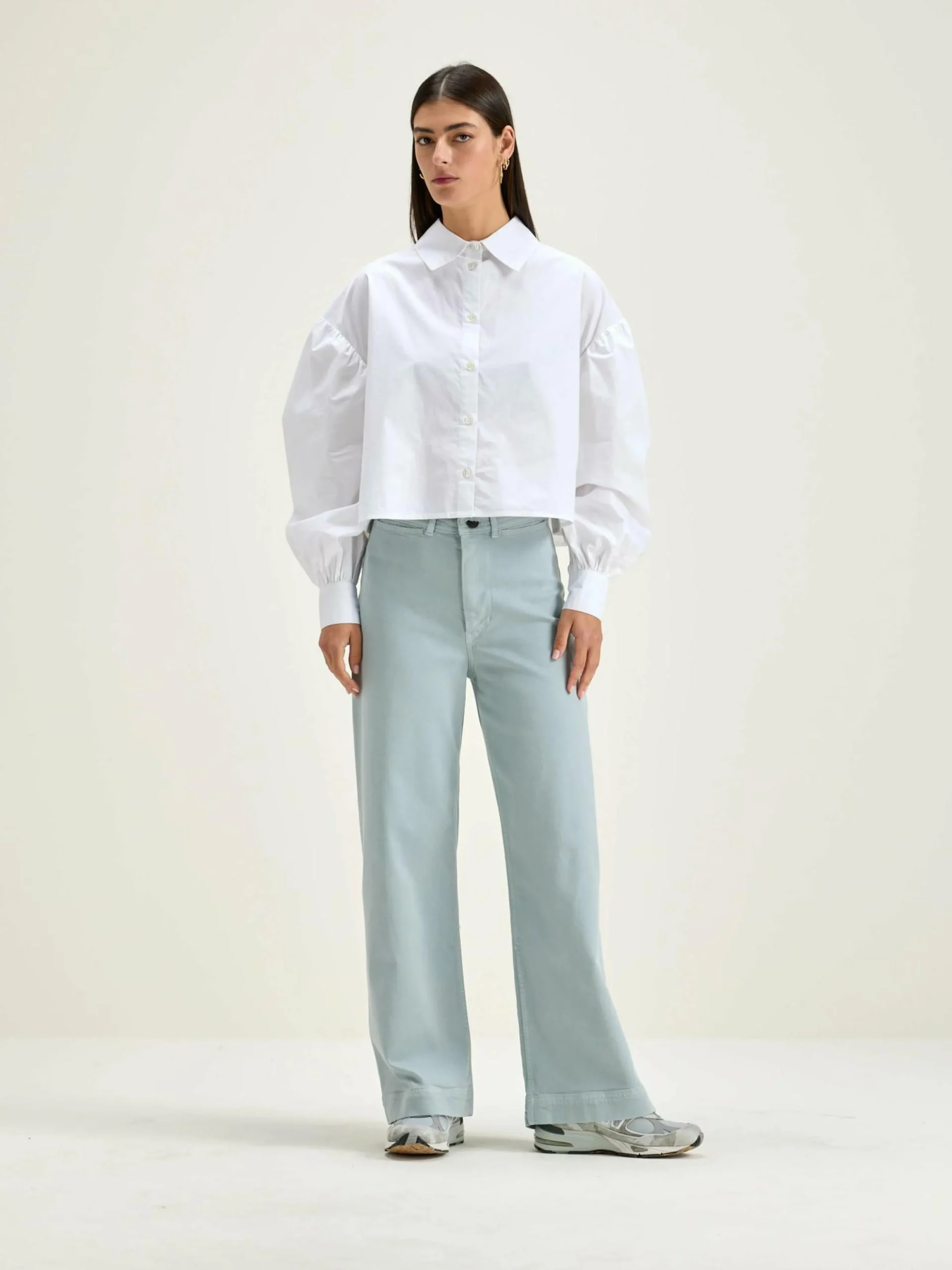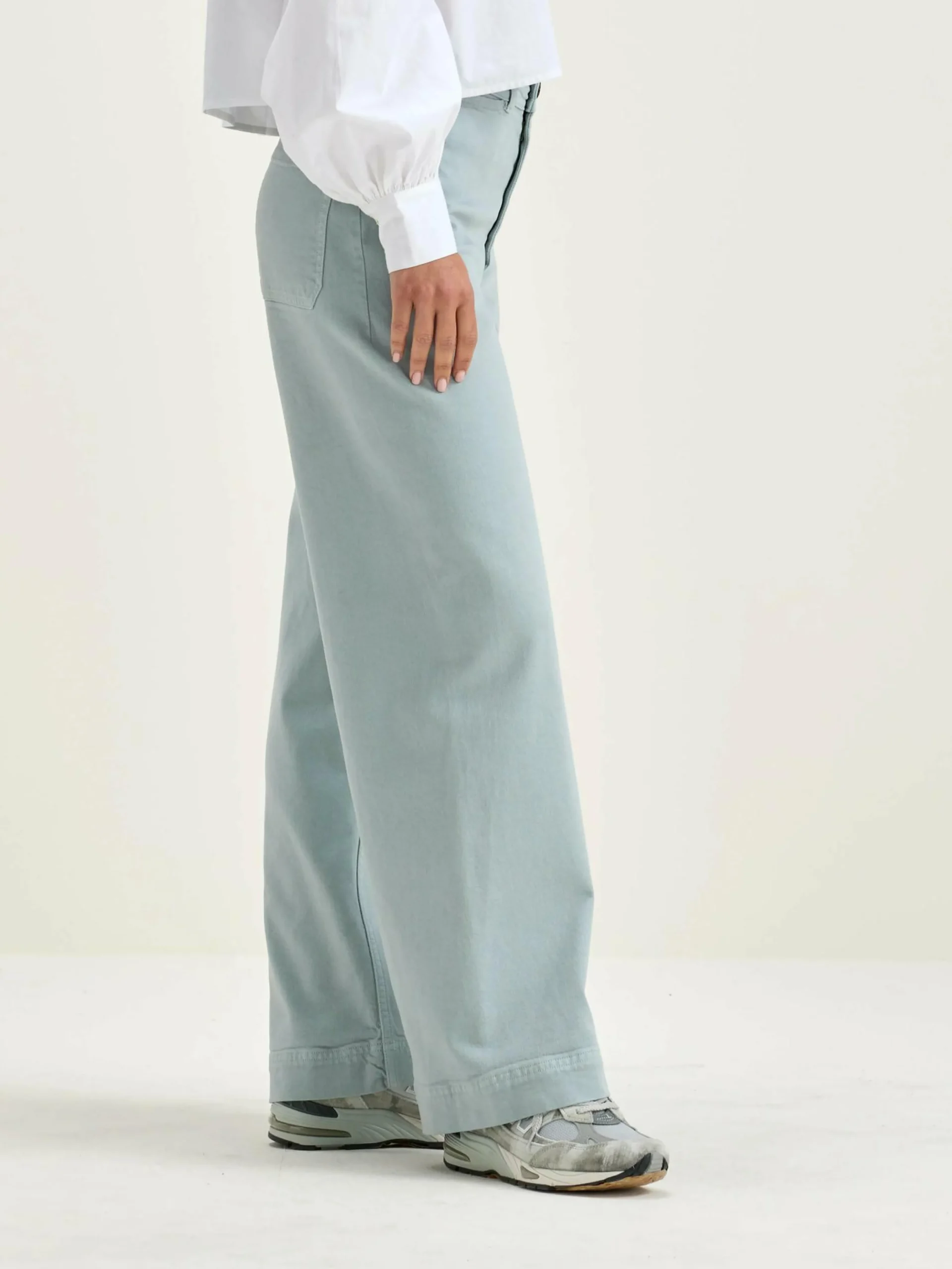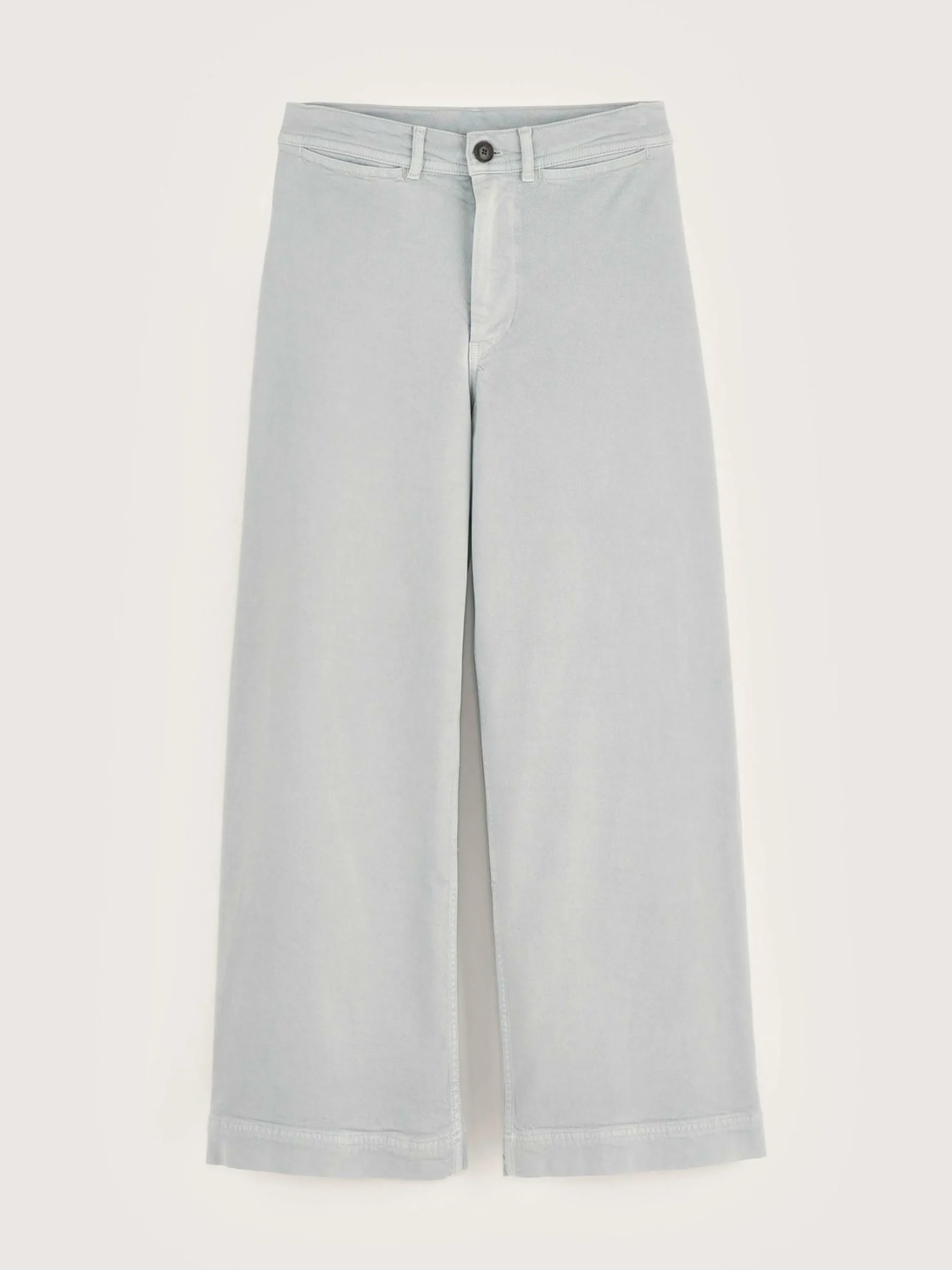 Pantalon taille haute, jambes larges, en sergé gris-bleu.