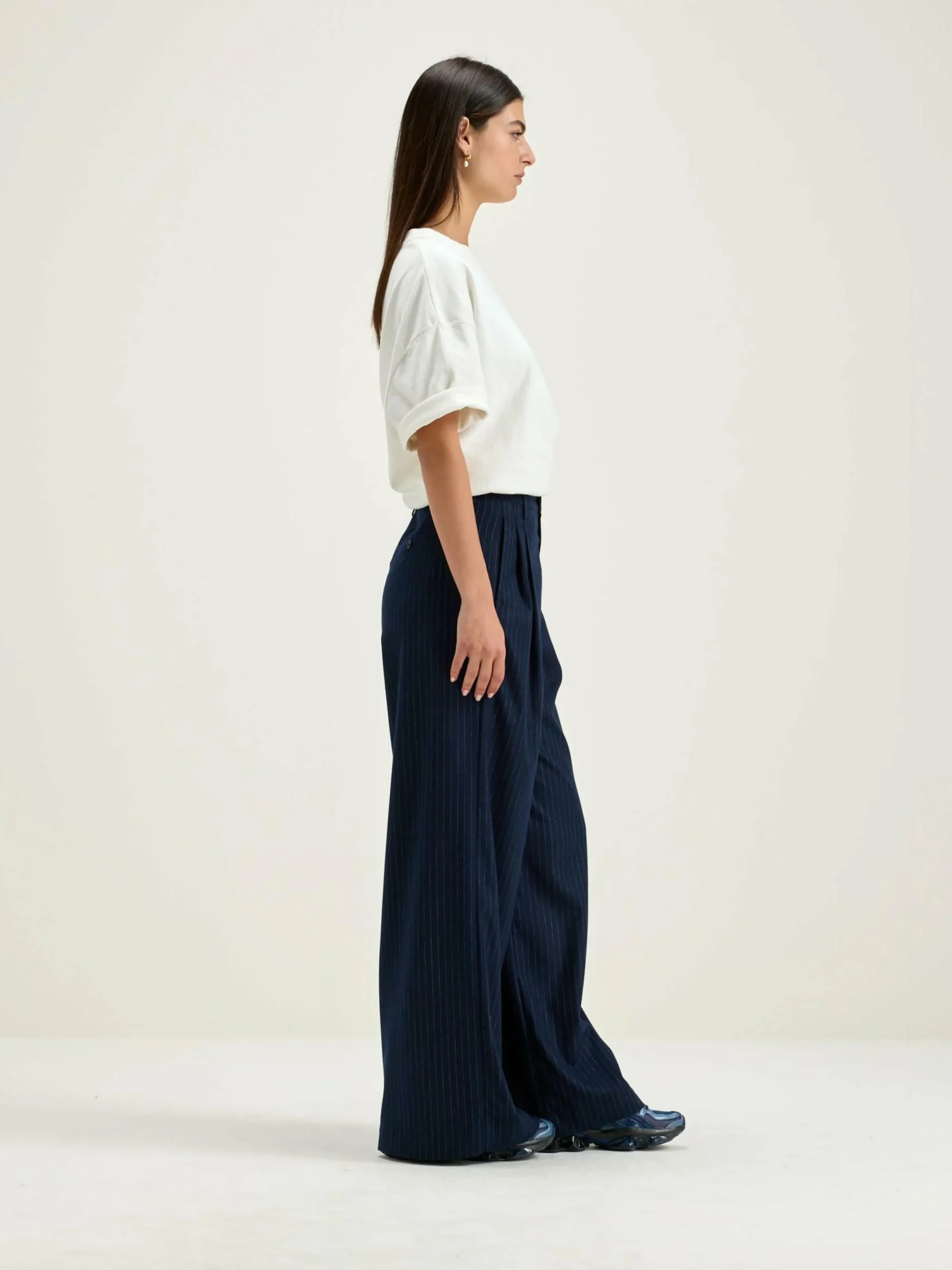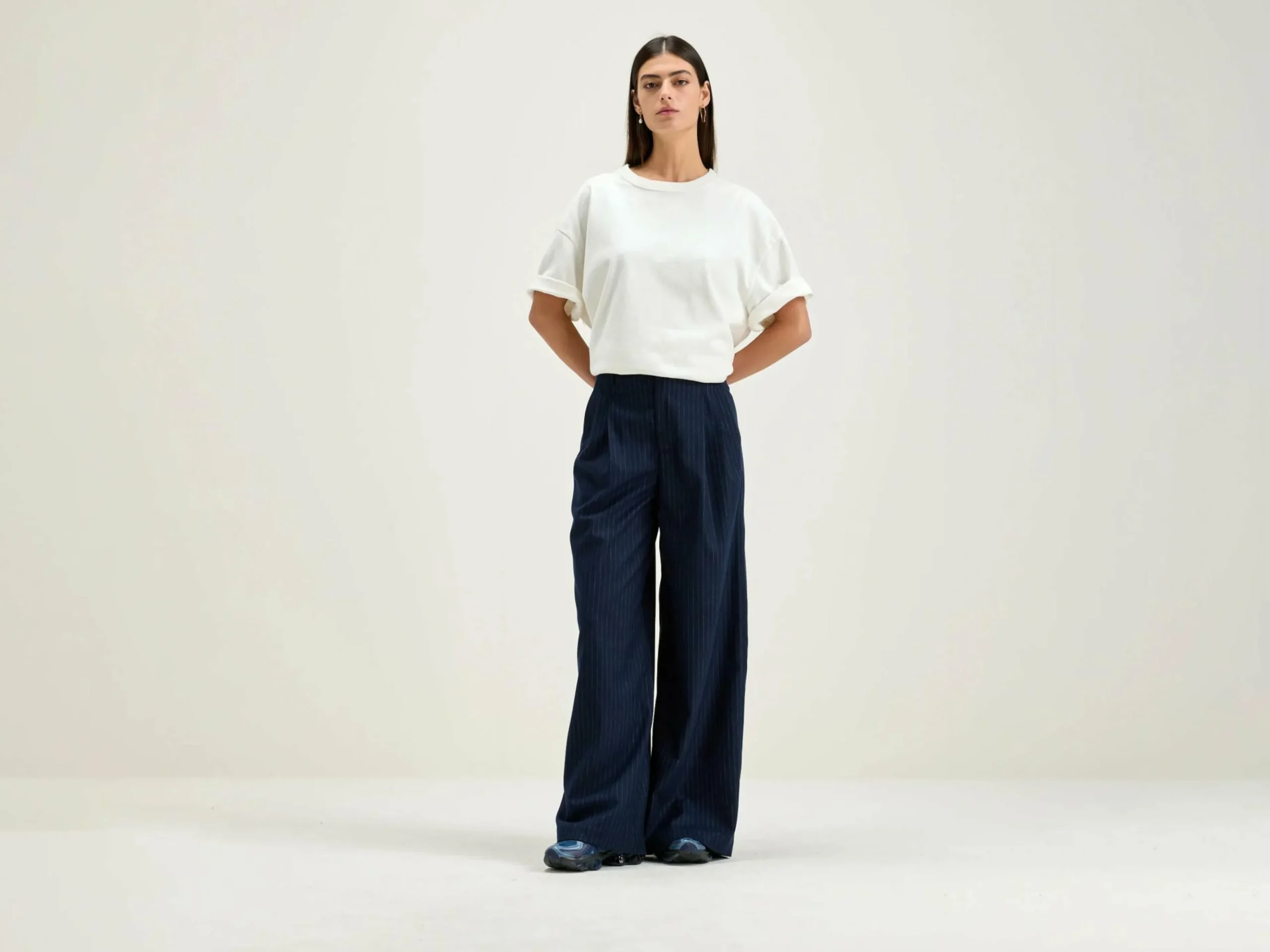 Pantalon à plis, jambes larges, taille haute et rayures classiques.